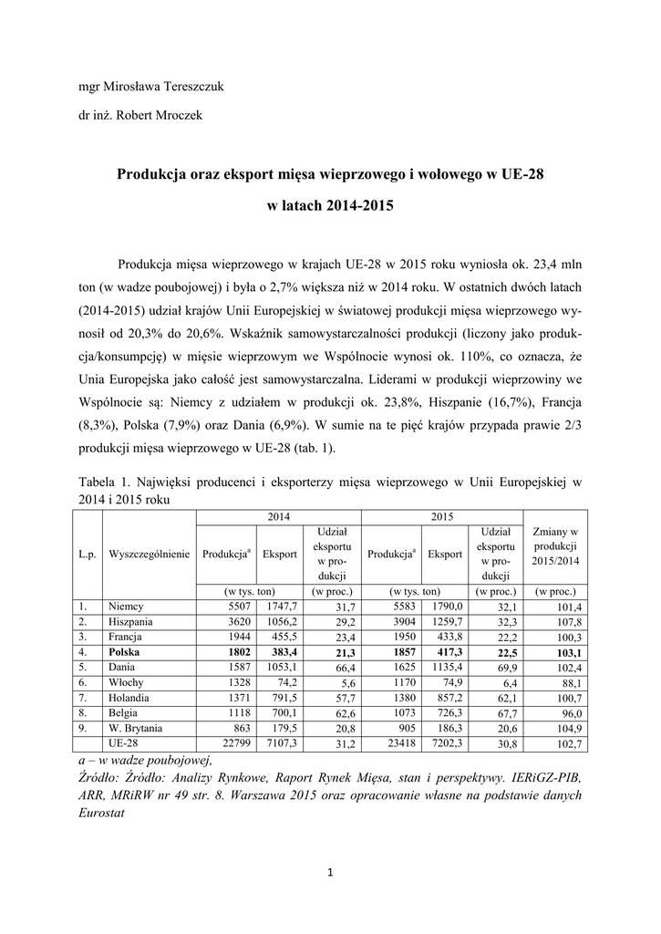 mgr Mirosława Tereszczuk dr inż. Robert Mroczek Produkcja oraz eksport mięsa wieprzowego i wołowego w UE-28 w latach 2014-2015 Produkcja mięsa wieprzowego w krajach UE-28 w 2015 roku wyniosła ok. 23,4 mln ton (w wadze poubojowej) i była o 2,7% większa niż w 2014 roku. W ostatnich dwóch latach (2014-2015) udział krajów Unii Europejskiej w światowej produkcji mięsa wieprzowego wynosił od 20,3% do 20,6%. Wskaźnik samowystarczalności produkcji (liczony jako produkcja/konsumpcję) w mięsie wieprzowym we Wspólnocie wynosi ok. 110%, co oznacza, że Unia Europejska jako całość jest samowystarczalna. Liderami w produkcji wieprzowiny we Wspólnocie są: Niemcy z udziałem w produkcji ok. 23,8%, Hiszpanie (16,7%), Francja (8,3%), Polska (7,9%) oraz Dania (6,9%). W sumie na te pięć krajów przypada prawie 2/3 produkcji mięsa wieprzowego w UE-28 (tab. 1). Tabela 1. Najwięksi producenci i eksporterzy mięsa wieprzowego w Unii Europejskiej w 2014 i 2015 roku 2014 L.p. Wyszczególnienie 1. 2. 3. 4. 5. 6. 7. 8. 9. Niemcy Hiszpania Francja Polska Dania Włochy Holandia Belgia W. Brytania UE-28 Produkcjaa Eksport (w tys. ton) 5507 1747,7 3620 1056,2 1944 455,5 1802 383,4 1587 1053,1 1328 74,2 1371 791,5 1118 700,1 863 179,5 22799 7107,3 2015 Udział eksportu w produkcji (w proc.) 31,7 29,2 23,4 21,3 66,4 5,6 57,7 62,6 20,8 31,2 Produkcjaa Eksport (w tys. ton) 5583 1790,0 3904 1259,7 1950 433,8 1857 417,3 1625 1135,4 1170 74,9 1380 857,2 1073 726,3 905 186,3 23418 7202,3 Udział eksportu w produkcji (w proc.) 32,1 32,3 22,2 22,5 69,9 6,4 62,1 67,7 20,6 30,8 Zmiany w produkcji 2015/2014 (w proc.) 101,4 107,8 100,3 103,1 102,4 88,1 100,7 96,0 104,9 102,7 a – w wadze poubojowej, Źródło: Źródło: Analizy Rynkowe, Raport Rynek Mięsa, stan i perspektywy. IERiGZ-PIB, ARR, MRiRW nr 49 str. 8. Warszawa 2015 oraz opracowanie własne na podstawie danych Eurostat 1 Największy udział eksportu mięsa wieprzowego w relacji do produkcji jest w Danii, Belgii i Holandii (ponad 60%), co wskazuje na proeksportowe nastawienie produkcji mięsa w tych krajach, przy średniej w UE-28 wynoszącej ok 30%. Spośród analizowanych krajów najmniejszy udział eksportu w relacji do produkcji był we Włoszech (6,4%). Największymi eksporterami mięsa wieprzowego w Unii Europejskiej są ich najwięksi producenci, a mianowicie Niemcy, Hiszpanie oraz Duńczycy (tab. 2 i 3). W większości największych producentów i eksporterów mięsa wieprzowego we Wspólnocie eksport tego mięsa ukierunkowany jest na rynek unijny (wewnętrzny), tj. kierowe jest tam ponad 70% eksportowanej wieprzowiny). Tabela 2. Eksport mięsa wieprzowego z krajów będących największymi producentami mięsa wieprzowego w UE-28 w 2014 i 2015 roku 2014 L.p. 1. 2. 3. 4. 5. 6. 7. 8 9. 10. 11. 12. Wyszczególnienie Niemcy Hiszpania Dania Holandia Belgia Francja Polska W. Brytania Austria Irlandia Węgry Włochy Eksport ogółem (w tys. ton) 1747,7 1056,2 1053,1 791,5 700,0 455,5 383,4 179,5 177,6 148,2 132,6 74,2 2015 w tym: wewnątrzpozaunijny unijny (w proc.) (w proc.) 83,4 16,6 73,6 26,4 70,7 29,3 80,4 19,6 93,9 6,1 78,7 11,3 73,5 26,5 69,8 30,2 75,7 24,3 59,9 40,1 65,8 34,2 59,4 40,6 Źródło: opracowanie własne na podstawie danych Eurostat 2 Eksport ogółem (w tys. ton) 1790,0 1259,7 1135,4 857,2 726,3 433,8 417,3 186,3 163,5 160,6 137,4 74,9 w tym: wewnątrzpozaunijny unijny (w proc.) (w proc.) 80,0 20,0 71,0 29,0 71,8 28,2 77,5 22,5 94,3 5,7 74,8 25,2 81,7 12,3 68,7 31,3 80,6 19,4 61,6 28,4 59,7 40,3 61,5 38,5 Tabela 3. Wartość eksportu mięsa wieprzowegoa w UE-28 (w mln euro) (w cenach bieżących) w 2014 i 2015 roku L.p. 1. 2. 3. 4. 5. 6. 7. 8. 9. 10. 11. 12. Wyszczególnienie Niemcy Hiszpania Dania Holandia Belgia Francja Polska Austria Irlandia Węgry W. Brytania Włochy UE-28 2014 3 802,9 2 494,1 2 338,4 1 617,5 1 271,6 837,1 704,1 420,8 355,7 313,9 256,1 169 15 057,4 2015 3 644,3 2 732,1 2 308,3 1 599,1 1 203,3 740,6 724,5 350,0 364,6 304,8 272,0 171,9 14 934,3 Źródło: jak w tab. 2. Produkcja mięsa wołowego w krajach UE-28 w 2015 roku wyniosła ok. 7,7 mln ton (w wadze poubojowej) i była o 1,8% większa niż w 2014 roku. W ostatnich dwóch latach (2014-2015) udział krajów Unii Europejskiej w światowej produkcji mięsa wołowego wynosił ok. 12,5%. Wskaźnik samowystarczalności produkcji (liczony jako produkcja/konsumpcję) w mięsie wołowym we Wspólnocie wynosi blisko 100%, co oznacza, że Unia Europejska jako całość jest praktycznie samowystarczalna. Liderami w produkcji mięsa wołowego we Wspólnocie są: Francja z udziałem w produkcji na poziomie ok 19%, Niemcy (14,7%), Wielka Brytania (11,2%) oraz Włochy (9,7%). W Sumie na te cztery kraje przypada ponad połowa produkowanej wołowiny we Wspólnocie (tab. 4). Największy udział eksportu mięsa wołowego w relacji do produkcji jest w Holandii oraz Polsce i wynosi odpowiednio 98,0% i 86,4%. W 2014 roku Holandia wyeksportowała więcej mięsa wołowego niż wyprodukowała, co można wytłumaczyć jedynie reeksportem lub większą sprzedażą zapasów. Oba kraje można więc uznać, że mają proeksportowe nastawienie produkcji tego gatunku mięsa, choć czynniki decydujące o tym są różne. Z danych zaprezentowanych w tabeli 4 wynika, że udział eksportu w produkcji mięsa wołowego w krajach Unii Europejskiej jest bardzo zróżnicowany. Mniejsze zróżnicowanie jest, gdy patrzymy na ukierunkowanie eksportu wołowiny. W zdecydowanej większości analizowanych krajów, eksportowane mięso trafia na rynek unijny (do innych krajów członkowskich) (tab. 3). 3 Tabela 4. Najwięksi producenci i eksporterzy mięsa wołowego w Unii Europejskiej w 2014 i 2015 roku 2014 L.p. 1. 2. 3. 4 5. 6. 7. 8. 9. 10. 11. Wyszczególnienie Produkcjaa Francja Niemcy W. Brytania Włochy Hiszpania Irlandia Polska Holandia Belgia Austria Dania UE-28 2015 Eksportb (w tys. ton) 1420 202,1 1128 332,0 878 110,4 709 117,8 579 132,3 582 344,2 421 308,8 376 393,8 258 121,9 222 109