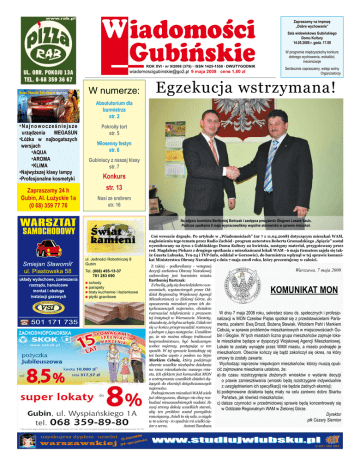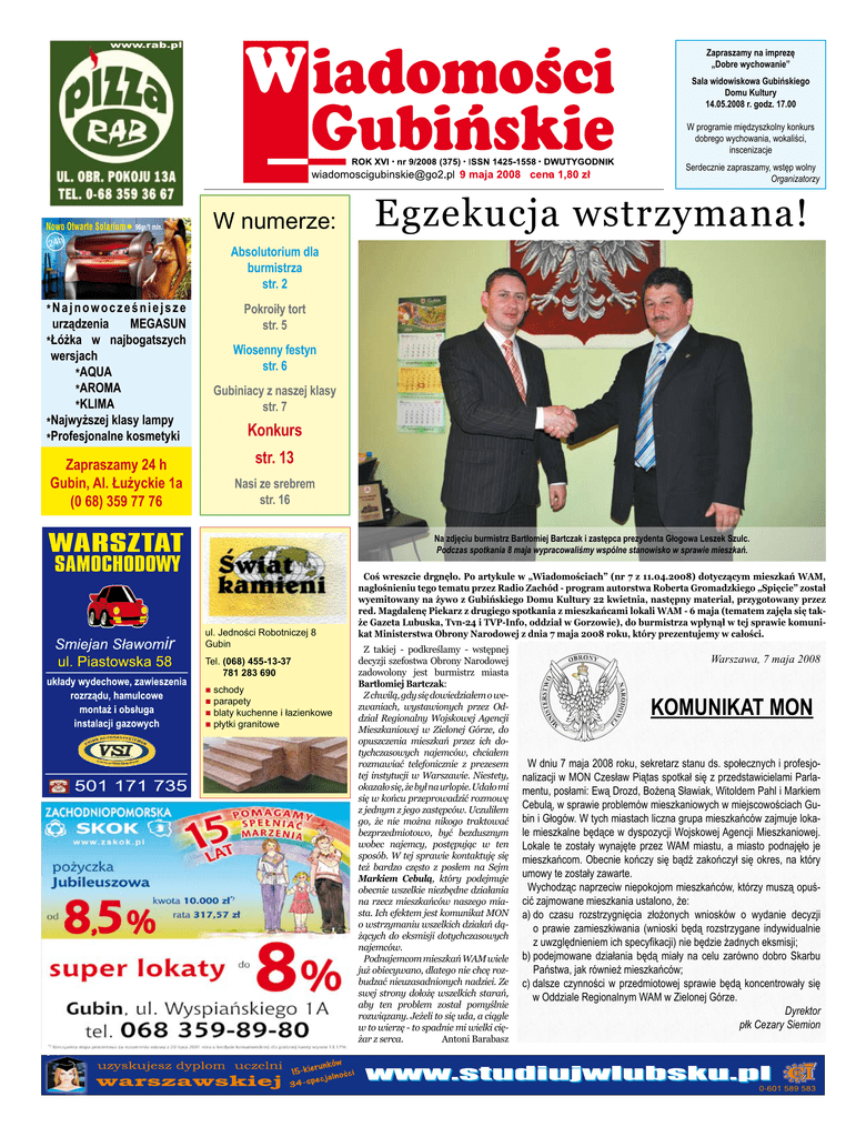 Zapraszamy na imprezę „Dobre wychowanie” Sala widowiskowa Gubińskiego Domu Kultury 14.05.2008 r. godz. 17.00 W programie międzyszkolny konkurs dobrego wychowania, wokaliści, inscenizacje Serdecznie zapraszamy, wstęp wolny Organizatorzy W numerze: Egzekucja wstrzymana! Absolutorium dla burmistrza str. 2 *N ajnowocześniejsze urządzenia MEGASUN *Łóżka w najbogatszych wersjach *AQUA *AROMA *KLIMA *Najwyższej klasy lampy *Profesjonalne kosmetyki Pokroiły tort str. 5 Wiosenny festyn str. 6 Gubiniacy z naszej klasy str. 7 Konkurs str. 13 Zapraszamy 24 h Gubin, Al. Łużyckie 1a (0 68) 359 77 76 Nasi ze srebrem str. 16 Na zdjęciu burmistrz Bartłomiej Bartczak i zastępca prezydenta Głogowa Leszek Szulc. Podczas spotkania 8 maja wypracowaliśmy wspólne stanowisko w sprawie mieszkań. ul. Jedności Robotniczej 8 Gubin Tel. (068) 455-13-37 781 283 690 n n n n schody parapety blaty kuchenne i łazienkowe płytki granitowe Coś wreszcie drgnęło. Po artykule w „Wiadomościach” (nr 7 z 11.04.2008) dotyczącym mieszkań WAM, nagłośnieniu tego tematu przez Radio Zachód - program autorstwa Roberta Gromadzkiego „Spięcie” został wyemitowany na żywo z Gubińskiego Domu Kultury 22 kwietnia, następny materiał, przygotowany przez red. Magdalenę Piekarz z drugiego spotkania z mieszkańcami lokali WAM - 6 maja (tematem zajęła się także Gazeta Lubuska, Tvn-24 i TVP-Info, oddział w Gorzowie), do burmistrza wpłynął w tej sprawie komunikat Ministerstwa Obrony Narodowej z dnia 7 maja 2008 roku, który prezentujemy w całości. Z takiej - podkreślamy - wstępnej decyzji szefostwa Obrony Narodowej zadowolony jest burmistrz miasta Bartłomiej Bartczak: Z chwilą, gdy się dowiedziałem o wezwaniach, wystawionych przez Oddział Regionalny Wojskowej Agencji Mieszkaniowej w Zielonej Górze, do opuszczenia mieszkań przez ich dotychczasowych najemców, chciałem rozmawiać telefonicznie z prezesem tej instytucji w Warszawie. Niestety, okazało się, że był na urlopie. Udało mi się w końcu przeprowadzić rozmowę z jednym z jego zastępców. Uczuliłem go, że nie można nikogo traktować bezprzedmiotowo, być bezdusznym wobec najemcy, postępując w ten sposób. W tej sprawie kontaktuję się też bardzo często z posłem na Sejm Markiem Cebulą, który podejmuje obecnie wszelkie niezbędne działania na rzecz mieszkańców naszego miasta. Ich efektem jest komunikat MON o wstrzymaniu wszelkich działań dążących do eksmisji dotychczasowych najemców. Podnajemcom mieszkań WAM wiele już obiecywano, dlatego nie chcę rozbudzać nieuzasadnionych nadziei. Ze swej strony dołożę wszelkich starań, aby ten problem został pomyślnie rozwiązany. Jeżeli to się uda, a ciągle w to wierzę - to spadnie mi wielki ciężar z serca. Antoni Barabasz Warszawa, 7 maja 2008 KOMUNIKAT MON W dniu 7 maja 2008 roku, sekretarz stanu ds. społecznych i profesjonalizacji w MON Czesław Piątas spotkał się z przedstawicielami Parlamentu, posłami: Ewą Drozd, Bożeną Sławiak, Witoldem Pahl i Markiem Cebulą, w sprawie problemów mieszkaniowych w miejscowościach Gubin i Głogów. W tych miastach liczna grupa mieszkańców zajmuje lokale mieszkalne będące w dyspozycji Wojskowej Agencji Mieszkaniowej. Lokale te zostały wynajęte przez WAM miastu, a miasto podnajęło je mieszkańcom. Obecnie kończy się bądź zakończył się okres, na który umowy te zostały zawarte. Wychodząc naprzeciw niepokojom mieszkańców, którzy muszą opuścić zajmowane mieszkania ustalono, że: a) do czasu rozstrzygnięcia złożonych wniosków o wydanie decyzji o prawie zamieszkiwania (wnioski będą rozstrzygane indywidualnie z uwzględnieniem ich specyfikacji) nie będzie żadnych eksmisji; b) podejmowane działania będą miały na celu zarówno dobro Skarbu Państwa, jak również mieszkańców; c) dalsze czynności w przedmiotowej sprawie będą koncentrowały się w Oddziale Regionalnym WAM w Zielonej Górze. Dyrektor płk Cezary Siemion Miasto i okolice 2 Urodzenia Oliwier Kusza, Esmina Woźniak, Wiktoria Studzińska, Kacper Janukiewicz, Patrycja Marchlewska, Bartosz Bartczak, Hubert Gilski, Konrad Brzezicki, Bartosz Kuba, Alan Czubkowski, Wiktoria Sokołowska, Oliwia Karczewska. Zgony Leszek Jerszyński l. 60, Bolesław Dudzień l. 69, Stefania Słowik l. 86, Alfred Lewandowski l. 85, Elżbieta Świeboda l. 55, Rozalia Brzezińska l. 84, Michał Staszkiewicz l. 70, Alfreda Patrzykąt l. 77, Maria Sośnicka l. 70, Genowefa Nawieśniak l. 79. Kolejny projekt przygotowany przez Wydział Europejski uzyskał dofinansowanie! „Witamy w Euromieście Gubin - Guben! - transgraniczna zintegrowana promocja wizualna” to projekt, w ramach którego powstanie w mieście m.in. 10 nowych trwałych tablic informacyjnych z historycznymi zdjęciami naszych zabytków oraz 3 tzw. witacze, czyli tablice witające wjeżdżających do naszego miasta podróżnych. Poza tym 3 autobusy kursujące na trasach: Zielona Góra-Gubin-Cottbus, Gubin-Krosno Odrzańskie i Gubin-Żary, oklejone zostaną reklamą zapraszającą na święto Euromiasta - Wiosna nad Nysą 2008. W kolejnych Wiadomościach oraz na stronie www.gubin.pl ukaże się obszerniejsza relacja z projektu, a już dzisiaj zapraszamy Państwa na punkt kulminacyjny projektu: polsko-niemiecki spacer „Szlakiem Zabytków Euromiasta”, któremu towarzyszyć będzie prelekcja lokalnego historyka Hansa Joachima Bergmanna (zapewniamy tłumaczenie!). Termin: 14 maja 2008 roku godz. 13.00. Miejsce spotkania: Wyspa Teatralna -„pomiędzy mostami”. KSIĘGARNIA Ryszard Kościesza ul. Obrońców Pokoju 5 PROMOCYJNA SPRZEDAŻ PODRĘCZNIKÓW cena katalogowa do 31.05.2008 do 21.06.2008 Wesoła Szkoła kl. 1 149,90 134,90 142,90 Wesoła Szkoła kl. 2 i 3 165,00 148,50 156,90 Już w szkole 6-latka 72,50 65,50 69,00 Już w szkole kl. 1 150,00 135,00 142,50 Już w szkole kl. 2 i 3 174,00 156,60 165,30 Sesja zaszczytów i rozłamów Ostatnia, XVIII Sesja rady Miejskiej obradow
