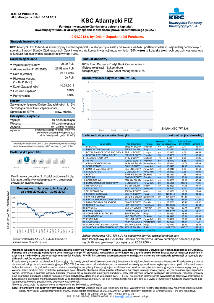KARTA PRODUKTU Aktualizacja na dzień: 10.04.2012 KBC Atlantycki FIZ Fundusz Inwestycyjny Zamknięty z ochroną kapitału*, inwestujący w fundusz działający zgodnie z przepisami prawa luksemburskiego (SICAV). 10.04.2012 r. był Dniem Zapadalności Funduszu. Strategia inwestycyjna KBC Atlantycki FIZ to fundusz inwestycyjny z ochroną kapitału, w którym zysk zależy od zmiany wartości portfela trzydziestu najbardziej dochodowych spółek z Europy i Stanów Zjednoczonych. Zysk inwestora na koniec inwestycji może wynieść 130% wzrostu koszyka akcji, ochrona zainwestowanego w fundusz kapitału w dniu zapadalności wynosi 100%. Najważniejsze dane • • • • Fundusz docelowy 100,99 PLN Wycena certyfikatów 27,92 mln PLN Aktywa netto (31.03.2012) 29.01.2007 Data rejestracji 100 PLN Pierwsza wycena (12.02.2007 r.) 100% Fund Partners Kredyt Bank Conservative 4 Miejsce rejestracji: Luksemburg Zarządzający: KBC Asset Management N.V. Zmiana wartości aktywów netto (w PLN) 10.04.2012 • Dzień Zapadalności • Ochrona kapitału* • Partycypacja 100% 130% Koszty Za wystąpienie przed Dniem Zapadalności 1,15% Za wystąpienie w Dniu Zapadalności 0% Sprzedaż na GPW prow. makler. Dni wykupu i wyceny: Wykup: 10 dzień miesiąca Wycena: 10 dzień miesiąca 10 - 23 dnia miesiąca Żądania poprzedzającego miesiąc, w którym wykupu: certyfikaty zostaną wykupione (23 dnia miesiąca do godz. 12:00*) * Dotyczy dni roboczych. Jeśli 23 jest dniem wolnym należy złożyć zlecenie w ostatni poprzedzający dzień roboczy do godz.12:00. Profil ryzyka produktu Procentowa zmiana wartości koszyka za okres 20.02.2007 - 30.03.2012 120% 100% 80% 60% 40% 20% Źródło: obliczenia KBC TFI S.A. na podstawie serwisu www.bloomberg.com lis 11 lut 12 sie 11 lis 10 lut 11 maj 11 sie 10 maj 10 lis 09 lut 10 sie 09 maj 09 lis 08 lut 09 sie 08 lis 07 lut 08 maj 08 sie 07 lut 07 0% maj 07 INFORMACJA MARKETINGOWA Profil ryzyka produktu: 2. Produkt odpowiedni dla klienta o profilu ryzyka bezpiecznym, zrównoważonym lub dynamicznym. Żródło: KBC TFI S.A. Spółki wchodzące w skład koszyka Lp. 1 2 3 4 5 6 7 8 9 10 11 12 13 14 15 16 17 18 19 20 21 22 23 24 25 26 27 28 29 30 (aktualizacja co kwartał) Waga w Kurs Kurs na dzień Kod Bloomberg Giełda koszyku początkowy .2012-03-30 ENEL SPA ENEL IM EQUITY Mediolan 5% 8,0893 2,71 FRANCE TELECOM SA FTE FP EQUITY Paryż 4% 20,7590 11,11 ROYAL BANK OF SCOTLAND GROUP RBS LN EQUITY Londyn 4% 20,8960 0,09 DEUTSCHE TELEKOM AG-REG DTE GY EQUITY Frankfurt 5% 13,4030 9,03 TELECOM ITALIA SPA TIT IM EQUITY Mediolan 4% 2,3067 0,89 TUI AG TUI1 GY EQUITY Frankfurt 5% 18,0170 5,58 ABN AMRO HOLDING NV AABA NA EQUITY Amsterdam 5% 27,0240 14,76 SOUTHERN CO SO UN EQUITY Nowy Jork 4% 35,9490 44,93 BANK OF AMERICA CORP BAC UN EQUITY Nowy Jork 4% 51,9010 9,57 CITIGROUP INC C UN EQUITY Nowy Jork 4% 51,9280 3,66 FORTIS FORB BB EQUITY Bruksela 3% 33,1960 1,65 RWE AG RWE GY EQUITY Frankfurt 4% 77,8040 35,81 COMERICA INC CMA UN EQUITY Nowy Jork 4% 61,4500 32,36 DOMINION RESOURCES INC/VA D UN EQUITY Nowy Jork 3% 85,5220 102,42 IBERDROLA SA IBE SM EQUITY Madryt 3% 33,8360 17,03 KEY CORP KEY UN EQUITY Nowy Jork 2% 38,5070 8,50 TELEFONICA SA TEF SM EQUITY Madryt 3% 16,5630 12,29 SOCIETE GENERALE GLE FP EQUITY Paryż 3% 129,5710 21,97 SKF AB-B SHARES SKFB SS EQUITY Sztokholm 2% 136,0250 161,50 BRITISH AMERICAN TOBACCO PLC BA TS LN EQUITY Londyn 3% 15,7280 31,51 DAIMLERCHRYSLER AG-REG DCX GY EQUITY Frankfurt 2% 52,5580 45,45 NORDEA BANK AB NDA SS EQUITY Sztokholm 2% 109,3600 60,15 BAYER AG BAY GY EQUITY Frankfurt 3% 43,7150 52,74 SWISS RE-REG RUKN VX EQUITY Virt-x 3% 105,8400 49,04 SCHNEIDER ELECTRIC SA SU FP EQUITY Paryż 3% 92,4550 48,99 KBC GROEP NV KBC BB EQUITY Bruksela 3% 94,3440 18,81 PFIZER INC PFE UN EQUITY Nowy Jork 2% 25,4330 22,66 AKZO NOBEL AKZA NA EQUITY Amsterdam 2% 46,4550 44,27 COMPAGNIE DE SAINT-GOBAIN SGO FP EQUITY Paryż 3% 72,0410 33,49 TAKEDA PHARMACEUTICAL CO LTD 4502 JT EQUITY Tokio 3% 8132,0000 3645,00 Procentowa zmiana wartości koszyka Nazwa spółki Zmiana % -66,47 -46,51 -99,56 -32,65 -61,35 -69,05 -45,39 24,98 -81,56 -92,96 -95,04 -53,98 -47,34 19,76 -49,67 -77,93 -25,83 -83,05 18,73 100,31 -13,52 -45,00 20,65 -53,67 -47,01 -80,06 -10,90 -4,70 -53,52 -55,18 -43,74 Źródło: obliczenia KBC TFI S.A. na podstawie serwisu www.bloomberg.com Kurs Początkowy dla i-tej spółki - średnia arytmetyczna kursów zamknięcia cen akcji z pierwszych 10 sesji giełdowych począwszy od 20.02.2007 r. *Ochrona wpłaconego kapitału (bez uwzględniania opłaty za wydanie Certyfikatów) dotyczy wyłącznie wykupienia Certyfikatów w Dniu Zapadalności Funduszu. Fundusz nie gwarantuje osiągnięcia celu inwestycyjnego. W przypadku wykupienia certyfikatów na żądanie przed Dniem Zapadalności Inwestor powinien liczyć się z możliwością utraty co najmniej części kapitału. Wyniki historyczne zaprezentowane w niniejszym materiale nie stanowią gwarancji osiągnięcia podobnych zysków w przyszłości. Przedstawiony materiał ma charakter informacyjny, nie należy go traktować jako rekomendacji inwestowania w jakiekolwiek instrumenty finansowe. Przedstawiony materiał nie stanowi usługi doradztwa inwestycyjnego. KBC TFI S.A. nie ponosi odpowiedzialności za ewentualne szkody spowodowane wykorzystaniem opinii i informacji zawartych w komentarzu. Indywidualna stopa zwrotu z inwestycji w certyfikaty inwestycyjne jest uzależniona od wartości certyfikatu inwestycyjnego w momencie jego nabycia i wykupu przez fundusz oraz wysokości pobranych opłat. Sposób obliczania stopy zwrotu, informacje dotyczące strategii inwestycyjnej, w tym dokładny opis czynników ryzyka, informacje o zakresie ochrony kapitału, znajdują się w prospekcie emisyjnym Funduszu, który jest jedynym prawnie wiążącym dokumentem. Prospekt emisyjny oraz informacje dotyczące opłat za nabycie i wykup certyfikatów, dostępne są w siedzibie KBC TFI S.A., na stronach internetowych www.kbctfi.pl oraz www.kred