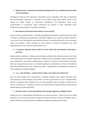 1. Skąd pomysł na rozpoczęcie działalności politycznej? Czy w młodości interesowała się Pani polityką? Działalność polityczną tak naprawdę rozpoczęłam przez przypadek. Całe moje wcześniejsze życie poświęcałam medycynie, w młodości- czas studiów trudno było znaleźć chwilę na coś innego niż szkoła. Jednak po skończeniu specjalizacji oraz kilkunastu latach pracy zdecydowałam że powinnam zacząć realizować się również w innej dziedzinie życia. Okoliczności tak się złożyły, że wypadło na politykę. 2. Jak udaję się Pani łączyć pracę lekarza z pracą posła? Nie jest to łatwe, jednak możliwe. W każdy poniedziałek przyjmuję w przychodni (jest to dzień w którym nie odbywają się posiedzenia sejmu)bez względu na to czy jest to tydzień sejmowy, czy też nie. W inne dni tygodnia mam możliwość pracy w zawodzie tylko jeśli nie ma posiedzeń sejmu oraz komisji. Trzeba pamiętać że praca lekarza to również konsultację oraz stałe dokształcanie się, a na to zawsze trzeba znaleźć czas. 3. Co podczas kadencji Sejmu udało się Pani zrobić dla mieszkańców Warszawy i powiatu? Jestem posłem wybranym z okręgu warszawskiego, jednak moim zadaniem jest praca nie tylko na rzecz Mazowsza, ale również całego kraju. Wydaje mi się iż największe sukcesy odniosłam na polu medycznym. Stworzyłam parlamentarny zespół ds. Chorych na Stwardnienie Rozsiane, który już drugą kadencję stara się wychodzić naprzeciw oczekiwaniom chorych. Prowadziłam kilka akcji profilaktycznych min. „zbadaj się mamo”. Zajmowałam się działaniami mającymi na celu rewitalizację szpitala praskiego. 4. A co – idąc do Sejmu – zamierzał Pan zrobić, a nie udało się zrealizować? Idąc do sejmu miałam inne wyobrażenie o sposobie działania tego organu. Wcześniej jako przewodnicząca Rady Dzielnicy Praga-Północ również pracowałam na rzecz Warszawiaków, jednak na mniejszą skalę. Wydaje mi się że wiele projektów które chciałam zrealizować jest jeszcze w trakcie prac. Liczyłam że uda mi się to zrobić podczas jednej kadencji, jednak jak się okazało będę potrzebowała dwóch. 5. Jak Pani uważa, co jest najważniejsze dla naszego regionu na najbliższe lata? Wydaje mi się że najważniejsze dla Mazowsza są trafne inwestycje. Ważne jest aby nie tylko Warszawa, ale również inne miasta na Mazowszu miały możliwość rozwoju. Chciałabym aby za kilka lat Mazowsze zostało uznane za najlepiej rozwijającą się aglomeracje w kraju. 6. Czy kobiecie będącej posłem trudno jest się przebić ze swoim zdaniem wśród mężczyzn? Wydaje mi się że w sejmie kobiety traktowane są na równi z mężczyznami. Oczywiście jest nas mniej, jednak nie powoduje to żadnej dyskryminacji. Wręcz przeciwnie zgadzam się z obiegowym powiedzeniem że kobiety łagodzą obyczaje. Tak jest również w sejmie, za równo ja, jak i moje koleżanki wnosimy wiele spokoju oraz roztropności w czasami nawet bardzo zaciekłe dyskusje. 7. Czy pozostaniu posłem porzuciła Pani karierę lekarza? Nie. W zawodzie pracuje od blisko 25 lat, nie wyobrażam sobie rozstania z medycyną. Pomimo iż musiałam ograniczyć pracę lekarską nie byłabym w stanie jej całkowicie zaprzestać. Posłem mogę być jedną, dwie czy trzy kadencję, jednak lekarzem będę zawsze. Ten zawód jest formą powołania, nie tylko pracy. 8. Jakie jest Pani zdanie dotyczące Kościoła? Czy faktycznie zaczął zbyt znacząco wpływać w naszym kraju? Czy zgadza się Pani z pomysłem "odcięcia" religii ze szkół i przeznaczeniem tych pieniędzy na inne potrzebne rzeczy? W Polsce większość społeczeństwa to zdeklarowani katolicy, dlatego też wycofanie religii ze szkół jest bardzo drażliwym tematem. Moim zdaniem problemy finansowe w oświacie nie znikną wraz z wycofaniem religii, można oczywiście zredukować część kosztów związanych z lekcjami religii, jednak kompleksowego rozwiązania powinniśmy szukać gdzie indziej. 9. Jakie jest Pani zdanie dotyczące poniesionych dużych kosztów na "Euro 2012"? Czy w tej sytuacji przy tak ważnym wydarzeniu dla całego kraju, jest to słuszne manifestować przeciw poniesionym na dane wydarzenie kosztom? To zależy o jakich kosztach mówimy, drogi, stadiony czy też innego rodzaju inwestycje dalej pozostają w naszym kraju. To nie jest tak że wybudujemy coś tylko na 2 miesiące, żeby potem to zburzyć. Wszelkiego rodzaju inwestycje będą służyć mieszkańcom wiele lat po zakończeniu Euro 2012. Inne koszty jakie musimy ponieść np. koszty zabezpieczenia ponoszą również inne kraje w których organizowane są międzynarodowe wydarzenia sportowe, dlatego też manifestowanie sprzeciwu wydaje mi się bardziej sprawą medialną, niż merytoryczną. 10. Chcielibyśmy także poruszyć już długo ciągnący się problem aborcji i zapłodnienia in vitro. Jest Pani za wprowadzeniem takich metod, czy jest Pani przeciwna? Jeśli chodzi o in vitro trudno jest mi wyrazić jednoznaczną opinię. Z medycznego punktu widzenia nie jest to ani prosty ani 100% skuteczny zabieg. Tak naprawdę o skutkach stosowania tej metody będziemy mogli mówić dopiero za kilka lat, kiedy pierwsze urodzone tym sposobem dzieci osiągną dojrzałość. Ze społecznego widzenie mogę stwierdzić iż sama jestem matką, dlatego wiem jakim szczęściem są dzieci. Do tego wszystkiego dochodzą również względy religijne oraz ekonomiczne. Z wyżej wymienionych powodów wynika fakt że nie jestem w stanie jednoznacznie określi słuszności czy też jej braku odnośnie stosowania in vitro.