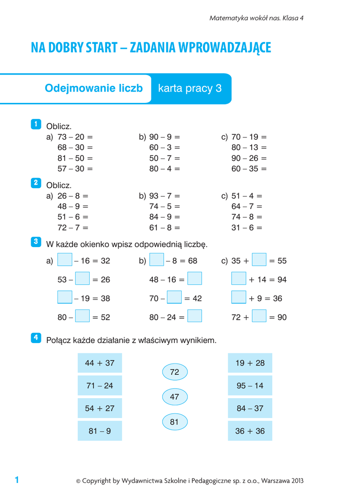 Matematyka wokół nas. Klasa 4 NA DOBRY START – ZADANIA WPROWADZAJĄCE Odejmowanie liczb karta pracy 3 1 Oblicz. a) 73 – 20 = b)90 – 9 = c) 70 – 19 = 68 – 30 = 60 – 3 = 80 – 13 = 81 – 50 = 50 – 7 = 90 – 26 = 57 – 30 = 80 – 4 = 60 – 35 = 2 Oblicz. a) 26 – 8 = b)93 – 7 = c) 51 – 4 = 48 – 9 = 74 – 5 = 64 – 7 = 51 – 6 = 84 – 9 = 74 – 8 = 72 – 7 = 61 – 8 = 31 – 6 = 3 W każde okienko wpisz odpowiednią liczbę. a) – 16 = 32 53 – 4 b) = 26 – 19 = 38 80 – = 52 – 8 = 68 48 – 16 = 70 – c) 35 + = 42 80 – 24 = = 55 + 14 = 94 + 9 = 36 72 + = 90 Połącz każde działanie z właściwym wynikiem. 44 + 37 72 71 – 24 19 + 28 95 – 14 47 54 + 27 81 – 9 1 84 – 37 81 36 + 36 © Copyright by Wydawnictwa Szkolne i Pedagogiczne sp. z o.o., Warszawa 2013 Karta pracy 3 5 Matematyka wokół nas. Klasa 4 Połącz linią każde działanie z odpowiednią sumą podanych liczb. 90 + 67 113 41 + 79 81 + 32 120 65 + 92 70 + 50 157 52 + 61 6 Pani Julia kupiła warzywa za 28 zł, owoce za 16 zł i ciasto za 9 zł. Ile zapłaciła za te zakupy? 7 Strzałka oznacza „dodaj 11”, a strzałka Wpisz w kółka odpowiednie liczby. oznacza „odejmij 9”. 27 8 Na piknik klasowy przygotowano 36 kanapek z serem i o 12 kanapek mniej – z szynką. Ile przygotowano kanapek z szynką? 9 Pani Karolina zrobiła zakupy za 86 zł. Ile otrzymała reszty ze 100 zł? 10 Pani Zofia kupiła wędlinę za 17 zł i ser za 24 zł. Ile reszty otrzymała z 50 zł? 11 Od domu Amelki do domu babci Ani jest 45 km, a do domu babci Krysi jest o 17 km bliżej. Ile kilometrów jest od domu Amelki do domu babci Krysi? Zaznacz poprawną odpowiedź. A. 17 km B. 45 km C. 62 km D. 28 km 12 W ogródku zakwitło 40 tulipanów. Wśród nich było 16 tulipanów białych, a pozostałe tulipany były czerwone i żółte. Ile zakwitło tulipanów czerwonych i żółtych razem? 2 © Copyright by Wydawnictwa Szkolne i Pedagogiczne sp. z o.o., Warszawa 2013