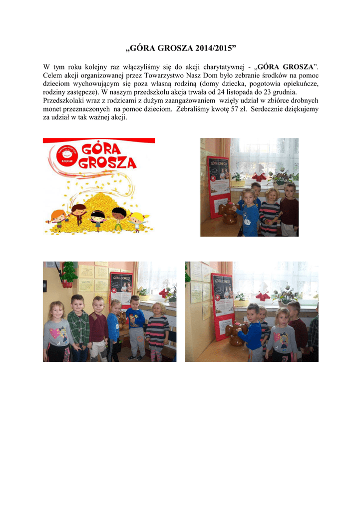 „GÓRA GROSZA 2014/2015” W tym roku kolejny raz włączyliśmy się do akcji charytatywnej - „GÓRA GROSZA”. Celem akcji organizowanej przez Towarzystwo Nasz Dom było zebranie środków na pomoc dzieciom wychowującym się poza własną rodziną (domy dziecka, pogotowia opiekuńcze, rodziny zastępcze). W naszym przedszkolu akcja trwała od 24 listopada do 23 grudnia. Przedszkolaki wraz z rodzicami z dużym zaangażowaniem wzięły udział w zbiórce drobnych monet przeznaczonych na pomoc dzieciom. Zebraliśmy kwotę 57 zł. Serdecznie dziękujemy za udział w tak ważnej akcji.