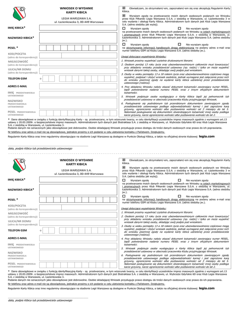 WNIOSEK O WYDANIE KARTY KIBICA LEGIA WARSZAWA S.A. ul. Łazienkowska 3, 00-449 Warszawa IMIĘ KIBICA* Oświadczam, że otrzymałam/-em, zapoznałam/-em się oraz akceptuję Regulamin Karty Kibica. Wyrażam zgodę na przetwarzanie moich danych osobowych podanych we Wniosku przez Klub Piłkarski Legia Warszawa S.S.A. z siedzibą w Warszawie, ul. Łazienkowska 3 w celu wydania i obsługi Karty Kibica. Administratorem tych danych jest Klub Legia Warszawa S.A. (adres siedziby jak wyżej). Wyrażam zgodę Nie wyrażam zgody na przetwarzanie moich danych osobowych podanych we Wniosku w celach marketingowych i promocyjnych przez Klub Piłkarski Legia Warszawa S.S.A. z siedzibą w Warszawie, ul. Łazienkowska 3. Administratorem tych danych jest Klub Legia Warszawa S.A. (adres siedziby jw.). NAZWISKO KIBICA* Wyrażam zgodę Nie wyrażam zgody na otrzymywanie informacji handlowych drogą elektroniczną na podany adres e-mail oraz numer telefonu GSM od Klubu Legia Warszawa S.A. (adres siedziby jw.). PESEL * KOD/POCZTA Uwagi dotyczące wypełniania Wniosku: (adres do korespondencji) 1. Wniosek prosimy wypełniać czytelnie drukowanymi literami. MIEJSCOWOŚĆ 2. Osobom poniżej 13 roku życia oraz ubezwłasnowolnionym całkowicie musi towarzyszyć przy składaniu wniosku przedstawiciel ustawowy (np. rodzic) i tylko on może wypełnić wniosek danymi takiej osoby, składając swój podpis pod wnioskiem. (adres do korespondencji) ULICA/NR DOMU (adres do korespondencji) TELEFON GSM 3. Osoby w wieku pomiędzy 13 a 18 rokiem życia oraz ubezwłasnowolnione częściowo mogą wypełnić, podpisać i złożyć wniosek osobiście, jednak wymagane jest załączenie przez nich do wniosku pisemnej zgody na wydanie karty kibica udzielonej przez przedstawiciela ustawowego (rodzica). + ADRES E-MAIL 4. Przy składaniu Wniosku należy okazać dokument tożsamości zawierający numer PESEL, bądź potwierdzenie nadania numeru PESEL wraz z innym oficjalnym dokumentem tożsamości. IMIĘ PRZEDSTAWICIELA USTAWOWEGO 5. Wniosek podpisuje osoba występująca o Kartę Kibica bądź jej pełnomocnik lub przedstawiciel ustawowy w obecności pracownika Klubu przyjmującego Wniosek. NAZWISKO 6. Posługiwanie się podrobionym lub przerobionym dokumentem zawierającym zgodę przedstawiciela ustawowego podlega odpowiedzialności karnej i jest zagrożone karą grzywny, ograniczenia wolności albo pozbawienia wolności od 3 miesięcy do lat 5. Natomiast posługiwanie się dokumentem stwierdzającym tożsamość innej osoby podlega karze grzywny, karze ograniczenia wolności albo pozbawienia wolności do lat 2. PRZEDSTAWICIELA USTAWOWEGO PESEL PRZEDSTAWICIELA USTAWOWEGO * Dane obowiązkowe w związku z funkcją identyfikacyjną Karty - są przetwarzane, w tym wizerunek twarzy, w celu identyfikacji uczestników imprez masowych zgodnie z wymogami art.13 ustawy z 20.03.2009r. o bezpieczeństwie imprez masowych. Administratorem tych danych jest Ekstraklasa S.A. z siedzibą w Warszawie, ul. Wybrzeże Gdyńskie 6D oraz Klub Legia Warszawa S.A. z siedzibą w Warszawie, ul. Łazienkowska 3. Podanie danych nie oznaczonych jako obowiązkowe jest dobrowolne. Osobie składającej Wniosek przysługuje prawo dostępu do treści danych osobowych oraz prawo do ich poprawiania. Nr telefonu oraz adres e-mail nie są obowiązkowe, jednakże prosimy o ich podanie w celu ułatwienia kontaktu z Państwem. Dziękujemy. Regulamin Karty Kibica oraz inne regulaminy obowiązujące na stadionie Legii Warszawa są dostępne w Punkcie Obsługi Kibica, a także na oficjalnej stronie klubowej legia.com …………………………………………………………………………………………… data, podpis Kibica lub przedstawiciela ustawowego WNIOSEK O WYDANIE KARTY KIBICA LEGIA WARSZAWA S.A. ul. Łazienkowska 3, 00-449 Warszawa IMIĘ KIBICA* Oświadczam, że otrzymałam/-em, zapoznałam/-em się oraz akceptuję Regulamin Karty Kibica. Wyrażam zgodę na przetwarzanie moich danych osobowych podanych we Wniosku przez Klub Piłkarski Legia Warszawa S.S.A. z siedzibą w Warszawie, ul. Łazienkowska 3 w celu wydania i obsługi Karty Kibica. Administratorem tych danych jest Klub Legia Warszawa S.A. (adres siedziby jak wyżej). Wyrażam zgodę Nie wyrażam zgody na przetwarzanie moich danych osobowych podanych we Wniosku w celach marketingowych i promocyjnych przez Klub Piłkarski Legia Warszawa S.S.A. z siedzibą w Warszawie, ul. Łazienkowska 3. Administratorem tych danych jest Klub Legia Warszawa S.A. (adres siedziby jw.). NAZWISKO KIBICA* Wyrażam zgodę Nie wyrażam zgody na otrzymywanie informacji handlowych drogą elektroniczną na podany adres e-mail oraz numer telefonu GSM od Klubu Legia Warszawa S.A. (adres siedziby jw.). PESEL * KOD/POCZTA Uwagi dotyczące wypełniania Wniosku: (adres do korespondencji) 1. Wniosek prosimy wypełniać czytelnie drukowanymi literami. MIEJSCOWOŚĆ 2. Osobom poniżej 13 roku życia oraz ubezwłasnowolnionym całkowicie musi towarzyszyć przy składaniu wniosku przedstawiciel ustawowy (np. rodzic) i tylko on może wypełnić wniosek danymi takiej osoby, składając swój podpis pod wnioskiem. (adres do korespondencji) ULICA/NR DOMU (adres do korespondencji) TELEFON GSM + ADRES E-MAIL IMIĘ PRZEDSTAWICIELA USTAWOWEGO NAZWISKO PRZEDSTAWICIELA USTAWOWEGO PESEL PRZEDSTAWICIELA USTAWOWEGO 3. Osoby w wieku pomiędzy 13 a 18 rokiem życia oraz ubezwłasnowolnione częściowo mogą wypełnić, podpisać i złożyć wniosek osobiście, jednak wymagane jest załączenie przez nich do wniosku pisemnej zgody na wydanie karty kibica udzielonej przez przedstawiciela ustawowego (rodzica). 4. Przy składaniu Wniosku należy okazać dokument tożsamości zawierający numer PESEL, bądź potwierdzenie nadania numeru PESEL wraz z innym oficjalnym dokumentem tożsamości. 5. Wniosek podpisuje osoba występująca o Kartę Kibica bądź jej pełnomocnik lub przedstawiciel ustawowy w obecności pracownika Klubu przyjmującego Wniosek. 6. Pos