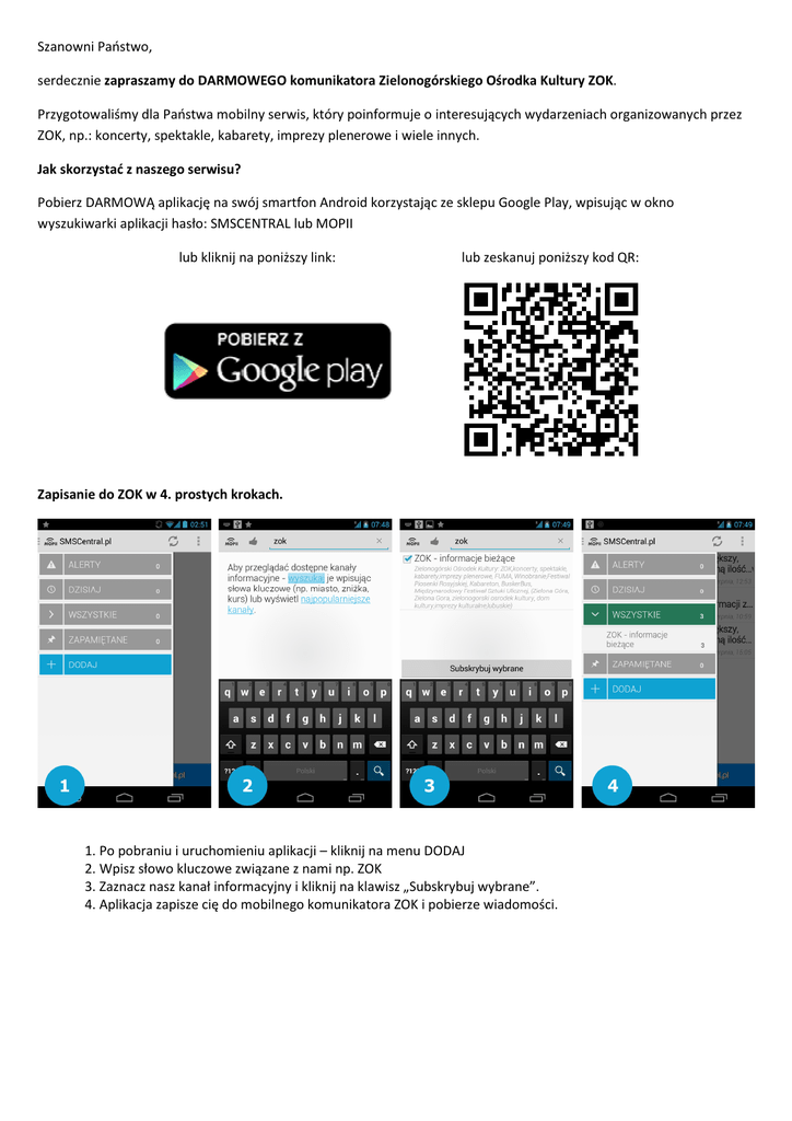 Szanowni Państwo, serdecznie zapraszamy do DARMOWEGO komunikatora Zielonogórskiego Ośrodka Kultury ZOK. Przygotowaliśmy dla Państwa mobilny serwis, który poinformuje o interesujących wydarzeniach organizowanych przez ZOK, np.: koncerty, spektakle, kabarety, imprezy plenerowe i wiele innych. Jak skorzystać z naszego serwisu? Pobierz DARMOWĄ aplikację na swój smartfon Android korzystając ze sklepu Google Play, wpisując w okno wyszukiwarki aplikacji hasło: SMSCENTRAL lub MOPII lub kliknij na poniższy link: lub zeskanuj poniższy kod QR: Zapisanie do ZOK w 4. prostych krokach. 1. Po pobraniu i uruchomieniu aplikacji – kliknij na menu DODAJ 2. Wpisz słowo kluczowe związane z nami np. ZOK 3. Zaznacz nasz kanał informacyjny i kliknij na klawisz „Subskrybuj wybrane”. 4. Aplikacja zapisze cię do mobilnego komunikatora ZOK i pobierze wiadomości. Przykładowa wiadomość z ZOK. UWAGA: 1. Pobranie i użytkowanie aplikacji SMSCentral jest BEZPŁATNE. Jedynym ewentualnym kosztem korzystania z komunikatora może być koszt włączonego połączenia internetowego w smartfonie (połączenie jest darmowe gdy korzystamy z ogólnodostępnych sieci Wi-Fi). 2. Rejestracja w systemie oznacza: - zgodę na przetwarzanie Państwa danych osobowych oraz - zgodę na otrzymywanie od ZOK mobilnych wiadomości. 3. Aby zrezygnować z otrzymywania informacji od ZOK – w dowolnej chwili można kliknąć na nazwę naszego kanału i usunąć go z listy nadawców (ikona kosza). Od tej chwili nie otrzymacie Państwo od nas żadnej wiadomości, do momentu ponownej subskrypcji kanału ZOK. 4. Szanujemy Państwa prywatność! Dlatego na komunikator będziemy przesyłać wyłącznie informacje związane z działalnością ZOK oraz tematami, które zostały przez Państwa osobiście dodane. 5. Rozwijamy nasz komunikator i powstają wersje na kolejne systemy np. Windows czy iPhone. Będziemy informować na bieżąco o rozwoju platformy i z góry dziękujemy za przesyłane do nas na adres [email protected] Państwa sugestie czy uwagi.