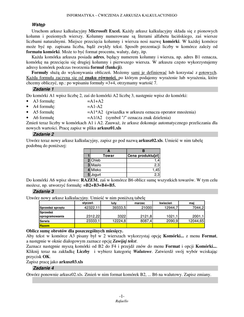 INFORMATYKA – ĆWICZENIA Z ARKUSZA KALKULACYJNEGO Wstęp Uruchom arkusz kalkulacyjny Microsoft Excel. Każdy arkusz kalkulacyjny składa się z pionowych kolumn i poziomych wierszy. Kolumny numerowane są literami alfabetu łacińskiego, zaś wiersze liczbami naturalnymi. Miejsce przecięcia kolumny i wiersza nosi nazwę komórki. W każdej komórce może być np. zapisana liczba, bądź zwykły tekst. Sposób prezentacji liczby w komórce zależy od formatu komórki. Może to być format procentu, waluty, daty, itp. Każda komórka arkusza posiada adres, będący numerem kolumny i wiersza, np. adres B1 oznacza, komórkę na przecięciu się drugiej kolumny i pierwszego wiersza. W arkuszu często wykorzystujemy adresy komórek podczas tworzenia formuł (funkcji). Formuły służą do wykonywania obliczeń. Możemy sami je definiować lub korzystać z gotowych. Każda formuła zaczyna się od znaku równości, po którym podajemy wyrażenie lub wyrażenia, które chcemy obliczyć, np.: po wpisaniu formuły =3+4, otrzymamy wartość 7. Zadanie 1 Do komórki A1 wpisz liczbę 2, zaś do komórki A2 liczbę 3, następnie wpisz do komórki: • A3 formułę: =A1+A2 • A4 formułę: =A1-A2 • A5 formułę =A1*A2 (gwiazdka w arkuszu oznacza operator mnożenia) • A6 formułę =A1/A2 (symbol "/" oznacza znak dzielenia) Zmień teraz liczby w komórkach A1 i A2. Zauważ, że arkusz dokonuje automatycznego przeliczania dla nowych wartości. Pracę zapisz w pliku arkusz01.xls Zadanie 2 Utwórz teraz nowy arkusz kalkulacyjny, zapisz go pod nazwą arkusz02.xls. Umieść w nim tabelę podobną do poniższej: 1 2 3 4 5 A Towar B Cena produktu[zł] 1,4 2,3 1,45 2,3 Chleb Masło Mleko Jogurt Do komórki A6 wpisz słowo: RAZEM, zaś w komórce B6 oblicz sumę wszystkich towarów. W tym celu możesz, np. utworzyć formułę: =B2+B3+B4+B5. Zadanie 3 Utwórz nowy arkusz kalkulacyjny. Umieść w nim poniższą tabelę styczeń Sprzedaż sprzętu Sprzedaż oprogramowania Serwis luty marzec kwiecień maj 42322,11 39333,5 21000 12944,7 7044,2 2312,22 23333,1 3322 12224,8 2121,8 8087,4 1021,1 2090,9 2001,1 12044,65 Razem Oblicz sumę obrotów dla poszczególnych miesięcy. Aby tekst w komórce A3 pisany był w 2 wierszach wykorzystaj opcję Komórki... z menu Format, a następnie w oknie dialogowym zaznacz opcję Zawijaj tekst. Zaznacz następnie myszą komórki od B2 do F4 i przejdź znów do menu Format i opcji Komórki.... Kliknij teraz na zakładkę Liczby i wybierz kategorię Walutowe. Zatwierdź swój wybór wciskając przycisk OK. Zapisz pracę jako arkusz03.xls Zadanie 4 Otwórz ponownie arkusz02.xls. Zmień w nim format komórek B2, ... B6 na walutowy. Zapisz zmiany. -1Rafaello INFORMATYKA – ĆWICZENIA Z ARKUSZA KALKULACYJNEGO Zadanie 5 Właśnie zamierzasz kupić komputer. Sprzedawca podał Ci jedynie ceny poszczególnych elementów składowych wg poniższego zestawu. Za pomocą arkusza kalkulacyjnego oblicz cenę końcową komputera. Za miesiąc może nastąpić podwyżka tych elementów o 10%. Oblicz w tym samym arkuszu, ile będą kosztować poszczególne elementy i cały komputer po podwyżce. Oto i tabela: Element Procesor płyta główna pamięć dysk twardy obudowa mysz SUMA Cena 540,00 zł 356,00 zł 170,00 zł 600,00 zł 110,00 zł 15,00 zł Nowa cena Nadaj odpowiednie formatowanie komórkom. Nową cenę obliczysz korzystając ze wzoru: =cena+cena*10% (np. =B2+B2*10%). Obliczając sumę wykorzystaj przycisk autosumowania: Σ z paska narzędzi, zaznaczając następnie interesujący Cię zakres komórek. Pracę zapisz jako arkusz04.xls Zadanie 6 Otwórz ponownie arkusz02.xls. Usuń z niego ostatni wiersz i wpisz do niego 3 kolumny według wzoru podanego poniżej: Towar Chleb Masło Mleko Jogurt Cena zakupu [zł] Marża [%] Marża [zł] Cena sprzedaży [zł] 1,40 zł 20% 2,30 zł 25% 1,45 zł 30% 2,30 zł 15% Oblicz marżę w złotych i cenę sprzedaży towarów. Nie zapomnij również o odpowiednim sformatowaniu komórek. Zmiany zapisz w pliku arkusz05.xls Zadanie 7 Przygotuj zestawienie dotyczące zakupów w sklepie warzywnym. Oblicz koszt i wagę torby z zakupami. Wpisz do arkusza poniższe zestawienie: Nazwa Cena [zł/kg] Liczba kg Wartość [zł] Ziemniaki 0,6 4,0 Marchew 2,0 1,5 Cebula 1,5 0,6 Jabłka 5,0 2,3 Razem Koszt ziemniaków obliczony ze wzoru: =B2*C2 wpisz do D2. Następnie zaznacz komórki od D2 do D5 i korzystając z menu Edycja/Wypełnij...w dół skopiuj wzór do tych komórek W komórce C7 oblicz wagę paczki. Skorzystaj z przycisku Autosumowania (Σ), zaznacz interesujący Cię zakres komórek. Podobnie w komórce D7 podsumuj wszystkie wydatki. Zmień format komórek z kolumny B i D na walutowy. Zadanie zapisz jako arkusz07.xls Zadanie 8 Utwórz zestawienie dotyczące powierzchni i ludności kilku krajów europejskich. KRAJ POWIERZCHNIA LUDNOŚĆ [TYS] GĘSTOŚĆ ZALUDNIENIA [km2] [TYS/KM2] Norwegia 323900 4381 Szwecja 450000 8843 Dania 43100 5262 Finlandia 338100 5124 -2Rafaello INFORMATYKA – ĆWICZENIA Z ARKUSZA KALKULACYJNEGO Oblicz gęstość zaludnienia [tys. mieszkańców/km2] (skorzystaj z formuły =ludność/powierzchnia). Obliczoną gęstość zaludnienia skopiuj następnie na obszar D2:D4 wykorzystując mechanizm podany w zadaniu poprzednim. Pracę zapisz jako: arkusz 08.xls Zadanie 9 Sporządź listę płac brygady złożonej z 4 pracowników. Każdy z pracowników otrzymuje stałą pensję miesięczną, ale różną od pensji swoich kolegów. Wszyscy dostają premię w wysokości20% swoich zarobków i wszyscy płacą 21% podatek od sumarycznych zarobków. Oblicz ich zarobki brutto i netto oraz podaj odpowiednie sumy dla całej brygady. Kto Pensja Premia Zarobki Podatek Zarobki zasadnicza Brutto netto Pracownik 1 800 Pracownik 2 920 Pracownik 3 950 Pracownik 4 1020 Średnia Oblicz średnie zarobki netto i brutto pracowników. Aby obliczyć wartość średnią kliknij najpierw na komórkę D6, następnie skorzystaj z przycisku fx lub menu Wstaw/Funkcja..., wyb