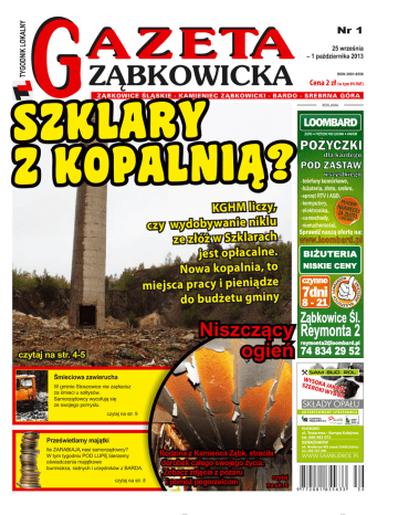 Nr 1 25 września – 1 października 2013 ISSN 2081-8556 Cena 2 zł (w tym 8% VAT) Szklary z kopalnią? Ząbkowice śląskiE • Kamieniec ząbkowicki • Bardo • srebrna góra KGHM liczy, czy w ydobywanie niklu ze złóż w Szklarach jest opłacalne. Nowa kopalnia, to miejsca pracy i pieniądze do budżetu gminy reklama BIŻUTERIA NISKIE CENY Ząbkowice Śl. Niszczący Reymonta 2 ogień 74 834 29 52 [email protected] czytaj na str. 4-5 Śmieciowa zawierucha W gminie Stoszowice nie zapłacisz za śmieci u sołtysów. Samorządowcy wycofują się ze swojego pomysłu. czytaj na str. 9 Prześwietlamy majątki Ile ZARABIAJĄ nasi samorządowcy? W tym tygodniu POD LUPĘ bierzemy oświadczenia majątkowe burmistrza, radnych i urzędników z BARDA. czytaj na str. 8 Rodzina z Kamieńca Ząbk. straciła dorobek całego swojego życia. Zobacz zdjęcia z pożaru czytaj i pomóż pogorzelcom na str. 6 2 Nr 001 Pod Paragrafem Słowo od redaktor naczelnej Karolina Makiej [email protected] Czy młodzież potrafi walczyć o swoje? Czy gimnazjaliści i licealiści są w stanie bronić swoich rówieśników? Czy wreszcie młodzi Problemy z prądem Przygotuj się na brak prądu. Już teraz zabezpiecz się i kup zapas świeczek ludzie są w stanie przekonywać dorosłych do swoich pomysłów? Gdyby w Ząbkowicach Śl. tak nie było, to zapewne Młodzieżowa Rada Miejska nie przetrwałaby dwóch lat i teraz nie byliby wybierani radni na drugą kadencję. Wiele starszych od nich osób, zwłaszcza polityków, zastanawia się po co właściwie taka rada istnieje? Ja sens w tym widzę. Może to właśnie dzięki tej młodzieży, starsi uświadomią sobie lub przypomną co tak Nadal trwa wymiana słupów energetycznych w wielu miejscowościach powiatu ząbkowickiego. To właśnie dlatego mieszkańcy wciąż muszą się liczyć z trwającymi nawet po kilka godzin brakami w dostawach prądu. Na przykład dzisiaj (środa, 25 września) w godz. 8.00-15.00 prądu nie będzie miała część mieszkańców ul. Dalekiej, Niepodległości i Legnickiej. Natomiast dwa dni temu (wtorek, 29 września) z brakiem prądu musieli się też zmagać mieszkańcy kilkunastu ulic w Kamieńcu Ząbk. Od godz. 13.00 przez dwie godziny prądu nie było w budynkach przy ulicach: Trzydziestolecia, Szkolna, Parkowa, Kolejowa, Krzywoustego, Osiedle Krzywoustego, Rumiankowa, Ogrodowa, Zamkowa, Wiejska, Jasna, Paczkowska, Piaskowa, Astrowa, Polna, Fiołkowa, Plac Kościelny, Różana, Krótka, Boczna, Nauczycielska, Gajowa, Byczeń, ulica Osiedle, Starczów, Goleniów, Śrem. PG naprawdę w sprawowaniu władzy jest najistotniejsze. Niejednokrotnie jest bowiem tak, że to nasi politycy mogą uczyć się od młodzieży: po pierwsze szacunku do innych, po drugie chęci działania i wreszcie kreatywności i twórczych pomysłów. Patrząc na naszych polityków, nie tyle na gruncie lokalnym, co ogólnopolskim wyraźnie widać, że kilka lekcji by im się przydało. Ząbkowickiej Młodzieżowej Radzie życzymy więc powodzenia! Ale przede wszystkim tego, aby Ich pomysły spotkały się z aprobatą lokalnych władz. Sugeruję, aby samorządowcy wsłuchiwali się w pomysły, rady i wskazówki młodych ludzi. To właśnie te osoby niczym nie są skażone, nie mają żadnej przeszłości. Patrzą w przyszłość pełni optymizmu i energii nie wiedząc jeszcze, że dorosłe życie to prawdziwy „wyścig szczurów”. Wykorzystajmy to! strażackie newsy • strażackie newsy • strażackie newsy • strażackie newsy • strażackie newsy Stłuczka w Kozińcu Dwa samochody osobowe we wtorek, 17 września ok. godz. 13.00 zderzyły się na terenie Kozieńca. Interweniowali strażacy, którzy oprócz standardowych czynności musieli się zająć także usuwaniem płynów eksploatacyjnych, które wyciekły z pojazdów. Na pomoc uwięzionym Kolejna nietypowa akcja strażaków. Tym razem zostali poproszeni przez policjantów o pomoc w otworzeniu drzwi jednego z mieszkań w Kamieńcu Ząbk., gdzie znajdowała się kobieta. Do podobnego zdarzenia doszło tego samego dnia (środa, 18 września) ok. godz. 9.43 w mieszkaniu przy ul. Amii Krajowej w Ząbkowicach Śl. W tym przypadku kobieta nie mogła dostać się do swojego mieszkania, w którym przebywało jej dwuletnie dziecko i niepełnosprawny ojciec. Aktywny dwutlenek W jednym z mieszkań przy ul. Głowackiego w Ząbkowicach Śl. wyczuwalny był dwutlenek węgla. Jego mieszkaniec natychmiast postanowił zaalarmować miejscową Komendę Powiatową Państwowej Straży Pożarnej. Strażacy potwierdzili, że w jednym z pomieszczeń było stężenie dwutlenku. To właśnie dlatego ich akcja, oprócz przeprowadzenia pomiarów, polegała na przewietrzeniu mieszkania. Do zdarzenia doszło w czwartek, 18 września ok. godz. 12.03. Landrover w ogniu Takiego pożaru w Stolcu dawno nie było. We wtorek, 17 września ok. godz. 6.56 spłonął samochód marki Landrover zaparkowany na miejscowym parkingu. Pomimo, że od zdarzenia minął tydzień, to strażacy nadal nie wiedzą, co było przyczyną pożaru. Karolina Makiej Czekamy na Twoje zdjęcie! Wyślij MMS-a na numer 902123* w treści wpisując Ap.gn * koszt jednego MMS-a to 2 zł + VAT (2,46 zł z VAT), za opublikowanie Twojego zdjęcia zapłacimy do 200 zł Za p³ na acim y 2 0 we t 0 z³ * Gazeta interweniuje Karolina Makiej czeka na zgłoszenia codzienne (tel. 502 324 540) Chętnie pomożemy rozwiązać Twój problem! Nr 001 3 Szukał grzybów, wylądował pod kołami samochodu Do tragicz nego wypad ku doszło w niedzielę, 22 września ok. godz. 11.30 w Szczytnej. Na ul. Robotniczej kierowca samochodu marki BMW potrącił pieszego. Jak ustalili policja nci potrąc ony, to 23-letni mieszkaniec Kamieńca Ząbk. Na miejscu zdarzenia oprócz policjantów i strażaków obecny był także prokurator, pod nadzorem którego prowadzone są teraz czynności wyjaśniające. Policjanci już jednak mówią o tym, co dokładnie wydarzyło się w Szczytnej. - 23-latek idący p