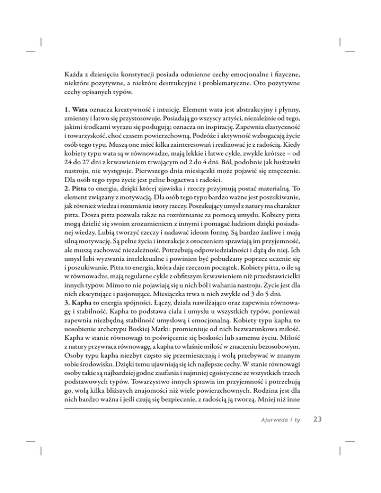 Każda z dziesięciu konstytucji posiada odmienne cechy emocjonalne i fizyczne, niektóre pozytywne, a niektóre destrukcyjne i problematyczne. Oto pozytywne cechy opisanych typów. 1. Wata oznacza kreatywność i intuicję. Element wata jest abstrakcyjny i płynny, zmienny i łatwo się przystosowuje. Posiadają go wszyscy artyści, niezależnie od tego, jakimi środkami wyrazu się posługują; oznacza on inspirację. Zapewnia elastyczność i towarzyskość, choć czasem powierzchowną. Podróże i aktywność wzbogacają życie osób tego typu. Muszą one mieć kilka zainteresowań i realizować je z radością. Kiedy kobiety typu wata są w równowadze, mają lekkie i łatwe cykle, zwykle krótsze – od 24 do 27 dni z krwawieniem trwającym od 2 do 4 dni. Ból, podobnie jak huśtawki nastroju, nie występuje. Pierwszego dnia miesiączki może pojawić się zmęczenie. Dla osób tego typu życie jest pełne bogactwa i radości. 2. Pitta to energia, dzięki której zjawiska i rzeczy przyjmują postać materialną. To element związany z motywacją. Dla osób tego typu bardzo ważne jest poszukiwanie, jak również wiedza i rozumienie istoty rzeczy. Poszukujący umysł z natury ma charakter pitta. Dosza pitta pozwala także na rozróżnianie za pomocą umysłu. Kobiety pitta mogą dzielić się swoim zrozumieniem z innymi i pomagać ludziom dzięki posiadanej wiedzy. Lubią tworzyć rzeczy i nadawać ideom formę. Są bardzo żarliwe i mają silną motywację. Są pełne życia i interakcje z otoczeniem sprawiają im przyjemność, ale muszą zachować niezależność. Potrzebują odpowiedzialności i dążą do niej. Ich umysł lubi wyzwania intelektualne i powinien być pobudzany poprzez uczenie się i poszukiwanie. Pitta to energia, która daje rzeczom początek. Kobiety pitta, o ile są w równowadze, mają regularne cykle z obfitszym krwawieniem niż przedstawicielki innych typów. Mimo to nie pojawiają się u nich ból i wahania nastroju. Życie jest dla nich ekscytujące i pasjonujące. Miesiączka trwa u nich zwykle od 3 do 5 dni. 3. Kapha to energia spójności. Łączy, działa nawilżająco oraz zapewnia równowagę i stabilność. Kapha to podstawa ciała i umysłu u wszystkich typów, ponieważ zapewnia niezbędną stabilność umysłową i emocjonalną. Kobiety typu kapha to uosobienie archetypu Boskiej Matki: promieniuje od nich bezwarunkowa miłość. Kapha w stanie równowagi to poświęcenie się boskości lub samemu życiu. Miłość z natury przywraca równowagę, a kapha to właśnie miłość w znaczeniu bezosobowym. Osoby typu kapha niezbyt często się przemieszczają i wolą przebywać w znanym sobie środowisku. Dzięki temu ujawniają się ich najlepsze cechy. W stanie równowagi osoby takie są najbardziej godne zaufania i najmniej egoistyczne ze wszystkich trzech podstawowych typów. Towarzystwo innych sprawia im przyjemność i potrzebują go, wolą kilka bliższych znajomości niż wiele powierzchownych. Rodzina jest dla nich bardzo ważna i jeśli czują się bezpiecznie, z radością ją tworzą. Mniej niż inne Ajurweda i ty 23 typy zajmują się poszukiwaniami intelektualnymi i wolą wchodzić w emocjonalne relacje z żywymi istotami – ludźmi, zwierzętami lub roślinami. Kiedy są w równowadze, mają regularne i niezbyt obfite menstruacje bez bólu i huśtawki emocjonalnej. Życie jest dla nich pełne miłości i obfitości. U tych kobiet menstruacja trwa najdłużej – od 3 do 7 dni. 4. Wata/pitta: to połączenie sprawia, że kobieta jest kreatywna i potrafi przejawiać tę cechę w konkretnej formie, na przykład tworząc sztukę, zajmując się biznesem lub działając w jakiejkolwiek innej dziedzinie życia. To dobre połączenie dla nauczycieli. Zwykle osoby takie są bardzo wesołe, pełne energii i lubiące zmiany. Ich cykle są na ogół regularne z normalnym upływem krwi. 5. Wata/kapha: to połączenie powoduje, że kreatywność u kobiety przejawia się w bardziej stabilny lub namacalny sposób. Większe jest prawdopodobieństwo, że tendencja ta ujawni się w odniesieniu do ludzi i zwierząt niż do abstrakcyjnych form materialnych. Tu również kryje się wielka moc intuicji, a także przywiązanie do natury i wszystkich żywych istot. Cykle są regularne, z lekkim upływem krwi. 6. Pitta/wata: kobiety tego typu z większą pasją podchodzą do życia i swoich zainteresowań. Mają tendencję, by swoją energią motywować tych, którzy je otaczają. To także korzystne połączenie dosz dla osób, które uczą innych lub wspomagają ich w jakichkolwiek dążeniach emocjonalnych, intelektualnych lub fizycznych. Cykl tych kobiet jest regularny z właściwym upływem krwi. 7. Pitta/kapha: to połączenie zwykle sprawia, że kobieta ma motywację do życia. Oddaje się mu i doświadcza go. Pragnie domu i rodziny, a mimo to realizuje inne zainteresowania i potrzeby zawodowe. Może bardzo dużo pracować. Jej cykl jest regularny, z równomiernym upływem krwi. 8. Kapha/wata: to połączenie sprawia, że kobieta zazwyczaj jest pełna życia i energiczna. Rozmowne, przyjacielskie i towarzyskie osoby tego typu mają dość wigoru, by bez przeszkód nawiązywać bezpośrednie i głębokie więzi z wieloma ludźmi. Kobieta taka podchodzi do innych z troską i intuicją, przyjemność może też sprawiać jej organizowanie różnych wydarzeń lub kierowanie ludźmi. To połączenie dosz charakteryzuje się umiejętnością zarządzania. Cykle takich kobiet są regularne i lekkie. 9. Kapha/pitta: to połączenie zazwyczaj sprawia, że kobieta jest silna i potężna. Może w życiu robić, co chce. Mimo to, gdy jest w równowadze, wykazuje postawę raczej humanitarną niż materialną. Ten typ jest potężną, pozytywną siłą w społeczeństwie. U tych kobiet cykle są regularne, a upływ krwi umiarkowany. 10. Wata/pitta/kapha: takie połączenie dosz może sprawić, że kobieta będzie uosobieniem archetypu Bogini. Ogólnie promieniuje od 
