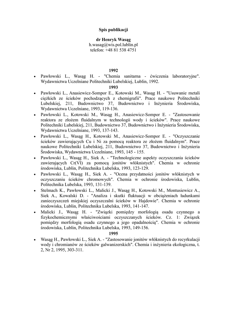 Spis publikacji dr Henryk Wasąg [email protected] telefon: +48 81 538 4751 1992 Pawłowski L., Wasąg H. - "Chemia sanitarna - ćwiczenia laboratoryjne". Wydawnictwa Uczelniane Politechniki Lubelskiej, Lublin, 1992. 1993 Pawłowski L., Anasiewicz-Sompor E., Kotowski M., Wasąg H. - "Usuwanie metali ciężkich ze ścieków pochodzących z chemigrafii". Prace naukowe Politechniki Lubelskiej, 211, Budownictwo 37, Budownictwo i Inżynieria Środowiska, Wydawnictwa Uczelniane, 1993, 119-136. Pawłowski L., Kotowski M., Wasąg H., Anasiewicz-Sompor E. - "Zastosowanie reaktora ze złożem fluidalnym w technologii wody i ścieków". Prace naukowe Politechniki Lubelskiej, 211, Budownictwo 37, Budownictwo i Inżynieria Środowiska, Wydawnictwa Uczelniane, 1993, 137-143. Pawłowski L., Wasąg H., Kotowski M., Anasiewicz-Sompor E. - "Oczyszczanie ścieków zawierających Cu i Ni za pomocą reaktora ze złożem fluidalnym". Prace naukowe Politechniki Lubelskiej, 211, Budownictwo 37, Budownictwo i Inżynieria Środowiska, Wydawnictwa Uczelniane, 1993, 145 - 155. Pawłowski L., Wasąg H., Siek A. - "Technologiczne aspekty oczyszczania ścieków zawierających Cr(VI) za pomocą jonitów włóknistych". Chemia w ochronie środowiska, Lublin, Politechnika Lubelska, 1993, 123-129. Pawłowski L., Wasąg H., Siek A. - "Ocena przydatności jonitów włóknistych w oczyszczaniu ścieków chromowych". Chemia w ochronie środowiska, Lublin, Politechnika Lubelska, 1993, 131-139. Stelmach K., Pawłowski L., Malicki J., Wasąg H., Kotowski M., Montusiewicz A., Siek A., Kowalski D. - "Analiza i skutki fluktuacji w obciążeniach ładunkami zanieczyszczeń miejskiej oczyszczalni ścieków w Hajdowie". Chemia w ochronie środowiska, Lublin, Politechnika Lubelska, 1993, 141-147. Malicki J., Wasąg H. - "Związki pomiędzy morfologią osadu czynnego a fizykochemicznymi właściwościami oczyszczanych ścieków. Cz. 1: Związek pomiędzy morfologią osadu czynnego a jego opadalnością". Chemia w ochronie środowiska, Lublin, Politechnika Lubelska, 1993, 149-156. 1995 Wasąg H., Pawłowski L., Siek A. - "Zastosowanie jonitów włóknistych do recyrkulacji wody i chromianów ze ścieków galwanizerskich". Chemia i inżynieria ekologiczna, t. 2, Nr 2, 1995, 303-311. 1996 Soldatov V., Pawłowski L., Wasąg H., Elinson I., Shunkievich A. - "Air pollution control with fibrous ion exchangers". Chemistry for the Protection of the Environment, 2, Plenum Press, New York, 1996, 55-66. Soldatov V., Pawłowski L., Wasąg H., Elinson I., Shunkievich A. - "Prospects of fibrous ion exchangers in water pollution control (chromates sorption by aminocarboxylic fibres example)". Chemistry for the Protection of the Environment, 2, Plenum Press, New York, 1996, 107-119. 1997 Pawłowski L., Wasąg H. - "Chemia sanitarna - ćwiczenia rachunkowe". Wydawnictwa Uczelniane Politechniki Lubelskiej, Lublin, 1992 (wznowienie 1997). 1998 Chomczyńska M., Pawłowski L., Wasąg H. - "Ion exchanger composites as humus substitute for restoration of degraded soils". Chemistry for the Protection of the Environment, 3, 1998, 321-328. 2000 Chomczyńska M., Matusevich V.V., Pawłowski L., Wasąg H., Soldatov V.S., Szymańska M. - "Vosstanovlenie plodorodija istoscennych i besplodnych pocv s pomosc'ju ionoobmennych substratov". Proceedings of Byelorussian-Polish Scientific and Technical Seminar, Grodno, 14-16 November, 2000. 2001 Chomczyńska M., Matusevich V.V., Pawłowski L., Wasąg H., Soldatov V.S., Szymańska M. - "Rekultivacija istoscennych počv ionoobmennymi substratami". Doklady Nacional'noj Akademii Nauk Belarusi, 45, 2001, 116-119. Soldatov V.S., Pawłowski L., Szymańska M., Chomczyńska M., Matusevich V.V., Wasąg H., Machoń H., Kowalik H., Kobusiński P. - "Application of ion exchange substrates Biona for fertilization of depleted soils and bare sand". Ecological Engineering, 18, 227-232, 2001. 2002 Soldatov V.S., Pawłowski L., Szymańska M., Matusevich V., Chomczyńska M., Wasąg H., Kloc E. - "Ispol'zovanie ionoobmennych substratov v kacestve udobrenija dlja istscoennych pocv". Agrochimija, 8, 50-55, 2002. Chomczyńska M., Pawłowski L., Wasąg H., Soldatov V.S., Matusevich V.V., Szymańska M. – Wpływ substratu jonitowego na retencję składników mineralnych w podłożu – badania modelowe. Inżynieria i Ochrona Środowiska, 5, 213-221,2002. 2003 Soldatov V., Shunkevich A., Wasąg H., Pawłowski L., Pawłowska M., 2003, Prospects of Fibrous Ion Exchangers in Technology of Water Purification, [in:] Environmental Engineering Studies - Polish Research on the Way to the EU, Kluwer, 153-167 2004 Soldatov V.S., Pawłowski L., Wasąg H., Schunkevich A.- New materials and technologies for environmental engineering. Part I – Synthesis and structure of ion exchange fibers. Monografie Komitetu Inżynierii Środowiska PAN, 21, 1-127, 2004. Szkutnik E., Wasąg H., Pawłowska M., Soldatov V. – Partition of heavy metals in municipal wastewater – the issue of ionic forms. Księga konferencyjna ECOpole’04, 165-169, 2004. Wasąg H., Dadej W. – Pathway of heavy metals in sewage treatment processes. Pathway of pollutants and mitigation strategies of their impact on the ecosystems. Monografie Komitetu Inżynierii Środowiska PAN, 27, 269-287, 2004. 2005 Gierżatowicz R., Wasąg H. – Mączka mięsno-kostna paliwem alternatywnym. Strategie spalania. Zarządzanie środowiskiem na terenach uprzemysłowionych – nowoczesne systemy, techniki i technologie, T2, 149-162, 2005. Orlovskaya L., Kujawska J., Soldatov V., Wasag H. - Sorpcja metali ciężkich na jonitach włóknistych jako metoda wzbogacania analitów, II Kongres Inżynierii Środowiska – materiały tom 2, Monografie Komitetu Inżynierii Środowiska PAN, vol. 33, pp. 657-664, 2005. Wasąg H., Gierżatowicz R., Szkutnik E., Kujawska J. – Usuwanie metali ciężkich ze ścieków miejskich za pomocą zeolitów naturalnych, II Kongres Inżynierii Środowiska – materiały tom 1, Monografie Ko