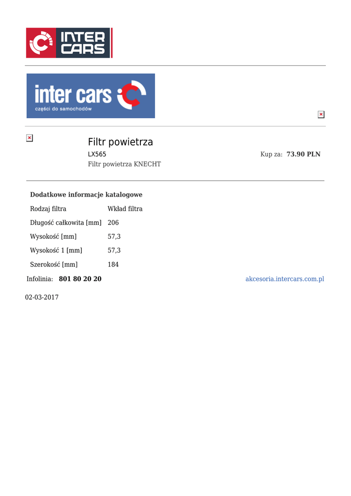 Filtr powietrza Kup za: 73.90 PLN LX565 Filtr powietrza KNECHT Dodatkowe informacje katalogowe Rodzaj filtra Wkład filtra Długość całkowita [mm] 206 Wysokość [mm] 57,3 Wysokość 1 [mm] 57,3 Szerokość [mm] 184 Infolinia: 801 80 20 20 02-03-2017 akcesoria.intercars.com.pl