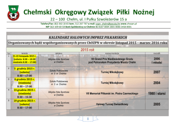 Chełmski Okręgowy Związek Piłki Nożnej 22 – 100 Chełm, ul. I Pułku Szwoleżerów 15 a Telefon/Fax: (82) 563 18 65 kom. 512 267 767 e-mail: [email protected] www.chozpn.pl NIP 563-109-60-58 Bank Spółdzielczy w Chełmie 86 8187 0004 2001 0006 5458 0001 KALENDARZ HALOWYCH IMPREZ PIŁKARSKICH Organizowanych bądź współorganizowanych przez ChOZPN w okresie listopad 2015 – marzec 2016 roku 2015 rok Lp termin miejsce nazwa turnieju rocznik 1 21-22 listopada 2015 r. (sobota 8:30 – 19:30 niedziela 8:30 – 17:00) Miejska Hala Sportowa w Chełmie VII Grand Prix Niedźwiedziego Grodu pod Patronatem Prezydenta Miasta Chełm 2006 I młodsi Szkoła Podstawowa nr 5 w Chelmie Turniej Mikołajkowy 2007 Szkoła Podstawowa nr 5 w Chelmie Turniej Mikołajkowy 2004 Miejska Hala Sportowa w Chełmie VII Memoriał Piłkarski im. Piotra Czerneckiego 1980 i starsi Miejska Hala Sportowa w Chełmie Halowy Turniej Gwiazdkowy 2005 2 3 4 5 5 grudnia 2015 r. (sobota) 8:30 – 17:00 6 grudnia 2015 r. (niedziela) 8:30 – 17:00 13 grudnia 2015 r. (niedziela) 8:30 – 15:30 19 grudnia 2015 r. (sobota) 8:30 – 17:00 1 Chełmski Okręgowy Związek Piłki Nożnej 22 – 100 Chełm, ul. I Pułku Szwoleżerów 15 a Telefon/Fax: (82) 563 18 65 kom. 512 267 767 e-mail: [email protected] www.chozpn.pl NIP 563-109-60-58 Bank Spółdzielczy w Chełmie 86 8187 0004 2001 0006 5458 0001 6 19 grudnia 2015 r. (sobota) 8:30 – 17:00 Szkoła Podstawowa nr 5 w Chelmie Halowy Turniej Gwiazdkowy 2006 Szkoła Podstawowa nr 5 w Chelmie HALOWY TURNIEJ NOWOROCZNY dla dzieci 2008 Miejska Hala Sportowa w Chełmie Halowe Mistrzostwa Okręgu Chełmskiego W kategorii seniorów - runda eliminacyjna Halowy Turniej Juniorów Młodszych o Puchar firmy „OKNOPLAST” Chełm Halowe Mistrzostwa Okręgu Chełmskiego W kategorii seniorów - runda finałowa - 2016 rok 7 9 stycznia 2016 r. (sobota) 8:30 – 17:00 8 23 stycznia 2016 r. (sobota) 8:30 – 20:00 9 24 stycznia 2016 r. (niedziela) Miejska Hala Sportowa w Chełmie 8:30 – 17:00 10 6 luty 2016 r. (sobota) Miejska Hala Sportowa w Chełmie 8:30 – 20:00 11 7 luty 2016 r. (niedziela) Miejska Hala Sportowa w Chełmie 31 stycznia 2016 r. (niedziela) 8:30 – 17:00 Szkoła Podstawowa nr 5 w Chelmie 1999 2000 senior Halowy Turniej Piłki Nożnej o Puchar firmy „SKOREK” Chełm 2001 2002 Halowy Turniej Piłki Nożnej o Puchar Prezesa ChOZPN 2006 2007 8:30 – 17:00 12 senior 2 Chełmski Okręgowy Związek Piłki Nożnej 22 – 100 Chełm, ul. I Pułku Szwoleżerów 15 a Telefon/Fax: (82) 563 18 65 kom. 512 267 767 e-mail: [email protected] www.chozpn.pl NIP 563-109-60-58 Bank Spółdzielczy w Chełmie 86 8187 0004 2001 0006 5458 0001 13 21 luty 2016 r. (sobota) Miejska Hala Sportowa w Chełmie XII Turniej piłki nożnej sędziów Im. Alfreda Ostrowskiego 8:30 – 16:30 14 5 marca 2016 r. (sobota) 9:00 – 17:00 15 27 - 28 luty 2016 r. (sobota 8:30 – 19:30 niedziela 9:30 – 17:00) Szkoła Podstawowa nr 5 w Chelmie VIII Halowy Turniej Piłkarski dla dzieci „Mali Piłkarze – Mamusiom” Hala Sportowa w Dorohusku Hala Sportowa w Woli Uhruskiej III Międzynarodowy Turniej Halowy „Kresy 2016” 3 sędziowie 2008 2009 2002 2003 2004 2005