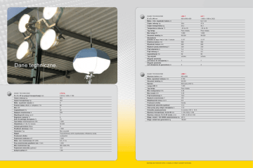 Dane techniczne. DANE TECHNICZNE LBA 1 LB 1 D x S x W mm 900 x 900 x 600 1.960 x 1.960 x 2.622 Maks. / min. wysokość balonu m – 6,2 / 2,6 Ciężar roboczy kg 28,4 47,9 Ciężar transportowy kg 34,3 50,1 Temperatura robocza °C - 22 do 35 - 22 do 35 Typ lampy Para metalu Para metalu Moc lampy W 1.000 1.000 Strumień świetlny lm 99.000 99.000 Oświetlenie (światło na wys. 4 m) m2 dla 11 luksów 3.317 3.317 Średnica balonu mm 900 900 Wysokość balonu mm 600 600 Napięcie (prąd przemienny) V 230 230 Prąd włączenia A 7,4 7,4 Prąd roboczy A 4,0 4,0 Częstotliwość Hz 50 50 Typ wtyczki schuko schuko Długość przewodu (od balonu do obciążenia) m 7 7 Długość przewodu (od obciążenia do generatora) m 3 3 DANE TECHNICZNE LBM 1 Wymiary balonu mm 900 x 600 Maks. wysokość statywu mm 3.700 Strumień świetlny lm 99.000 Oprawa E40 (przy 230 V) Lampa HQI W 1.000 Typ lampy Para metalu Moc maksymalna kVA 2,36 2,30 DANE TECHNICZNE LTN 6L Moc trwała kVA D x S x W (w pozycji transportowej) mm 3.918 x 1.265 x 1.790 Prąd znamionowy A 10,0 Ciężar roboczy kg 865 Napięcie znamionowe V 230 Ciężar transportowy kg 767 Współczynnik mocy cos φ 0,9 Maks. wysokość masztu m 9 Producent silnika Honda Poziom hałasu dB(A) w odległości 7 m 66 Pojemność zbiornika (paliwa) l 11,0 Moc kW 6 Czas pracy przy stałym obciążeniu h 11,8 Częstotliwość Hz 50 Gniazdka przyłączeniowe 2 x schuko 230 V, 16 A Napięcie znamionowe V 230 Wymiary transportowe: D x S x W mm 1.116 x 700 x 1.700 Współczynnik mocy cos φ 1 Wymiary robocze: D x S x W (maks.) mm 1.844 x 2.563 x 5.160 Regulacja napięcia % brak do pełnego obciążenia % 6 10 Waga: wózek + GV 2500A (zatankowany) kg 207,3 Typ lampy metalhalogenowa (W) 1.000 Waga: wózek bez generatora kg 156,80 Oświetlenie m2 dla 5,4 luksów 30.400 Izolacja generatora Klasa H Prędkość obrotowa 1/min 1.500 Generator Typ Bez szczotek Napęd Trzycylindrowy silnik wysokoprężny chłodzony wodą Producent silnika Lombardini Pojemność skokowa cm3 1.028 Maks. moc znamionowa kW (KM) 8,5 (11,4) Przy znamionowej prędkości obr. 1/min 1,500 Moc znamionowa wg ISO 3046 IFN Pojemność zbiornika (paliwa) l 123 Zużycie paliwa l/h 1,68 Zastrzega się możliwość zmian w związku ze stałym rozwojem konstrukcji.
