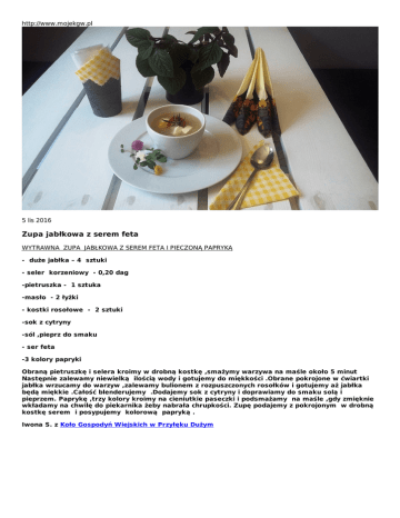 http://www.mojekgw.pl 5 lis 2016 Zupa jabłkowa z serem feta WYTRAWNA ZUPA JABŁKOWA Z SEREM FETA I PIECZONĄ PAPRYKĄ - duże jabłka – 4 sztuki - seler korzeniowy - 0,20 dag -pietruszka - 1 sztuka -masło - 2 łyżki - kostki rosołowe - 2 sztuki -sok z cytryny -sól ,pieprz do smaku - ser feta -3 kolory papryki Obraną pietruszkę i selera kroimy w drobną kostkę ,smażymy warzywa na maśle około 5 minut Następnie zalewamy niewielką ilością wody i gotujemy do miękkości .Obrane pokrojone w ćwiartki jabłka wrzucamy do warzyw ,zalewamy bulionem z rozpuszczonych rosołków i gotujemy aż jabłka będą miękkie .Całość blenderujemy .Dodajemy sok z cytryny i doprawiamy do smaku solą i pieprzem. Paprykę ,trzy kolory kroimy na cieniutkie paseczki i podsmażamy na maśle ,gdy zmięknie wkładamy na chwilę do piekarnika żeby nabrała chrupkości. Zupę podajemy z pokrojonym w drobną kostkę serem i posypujemy kolorową papryką . Iwona S. z Koło Gospodyń Wiejskich w Przyłęku Dużym