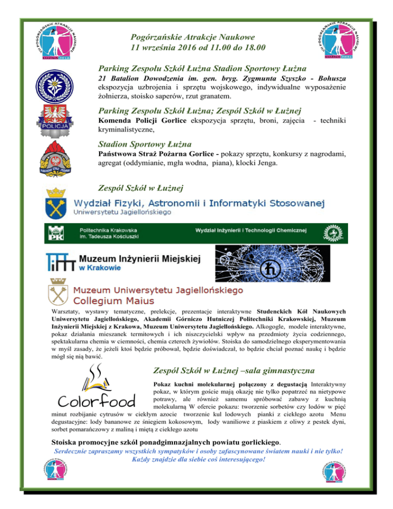 Pogórzańskie Atrakcje Naukowe 11 września 2016 od 11.00 do 18.00 Parking Zespołu Szkół Łużna Stadion Sportowy Łużna 21 Batalion Dowodzenia im. gen. bryg. Zygmunta Szyszko - Bohusza ekspozycja uzbrojenia i sprzętu wojskowego, indywidualne wyposażenie żołnierza, stoisko saperów, rzut granatem. Parking Zespołu Szkół Łużna; Zespól Szkół w Łużnej Komenda Policji Gorlice ekspozycja sprzętu, broni, zajęcia kryminalistyczne, - techniki Stadion Sportowy Łużna Państwowa Straż Pożarna Gorlice - pokazy sprzętu, konkursy z nagrodami, agregat (oddymianie, mgła wodna, piana), klocki Jenga. Zespól Szkół w Łużnej Warsztaty, wystawy tematyczne, prelekcje, prezentacje interaktywne Studenckich Kół Naukowych Uniwersytetu Jagiellońskiego, Akademii Górniczo Hutniczej Politechniki Krakowskiej, Muzeum Inżynierii Miejskiej z Krakowa, Muzeum Uniwersytetu Jagiellońskiego. Alkogogle, modele interaktywne, pokaz działania mieszanek termitowych i ich niszczycielski wpływ na przedmioty życia codziennego, spektakularna chemia w ciemności, chemia czterech żywiołów. Stoiska do samodzielnego eksperymentowania w myśl zasady, że jeżeli ktoś będzie próbował, będzie doświadczał, to będzie chciał poznać naukę i będzie mógł się nią bawić. Zespól Szkół w Łużnej –sala gimnastyczna Pokaz kuchni molekularnej połączony z degustacją Interaktywny pokaz, w którym goście mają okazję nie tylko popatrzeć na nietypowe potrawy, ale również samemu spróbować zabawy z kuchnią molekularną W ofercie pokazu: tworzenie sorbetów czy lodów w pięć minut rozbijanie cytrusów w ciekłym azocie tworzenie kul lodowych pianki z ciekłego azotu Menu degustacyjne: lody bananowe ze śniegiem kokosowym, lody waniliowe z piaskiem z oliwy z pestek dyni, sorbet pomarańczowy z maliną i miętą z ciekłego azotu Stoiska promocyjne szkól ponadgimnazjalnych powiatu gorlickiego. Serdecznie zapraszamy wszystkich sympatyków i osoby zafascynowane światem nauki i nie tylko! Każdy znajdzie dla siebie coś interesującego!