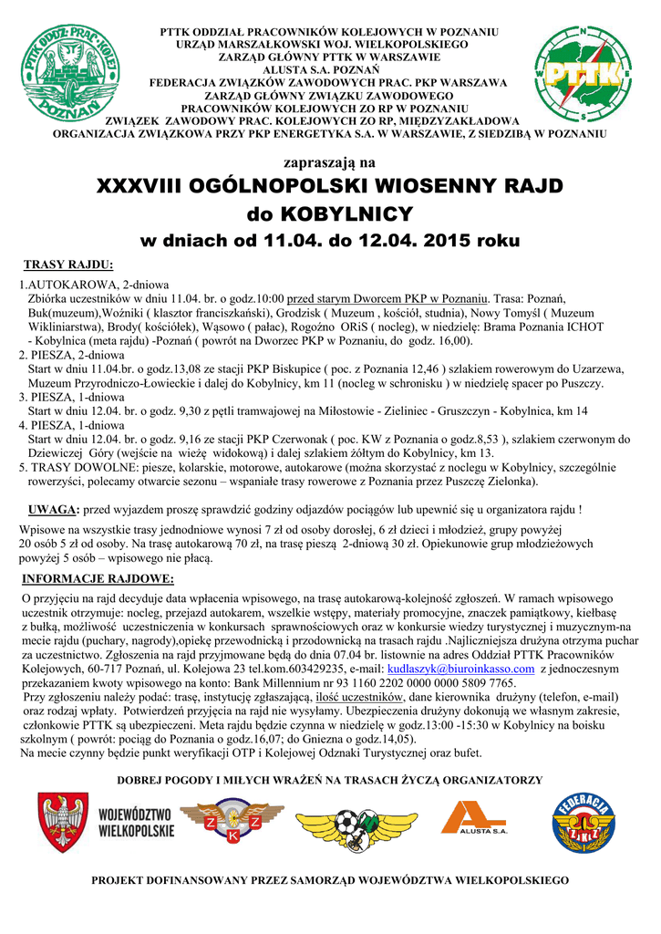 PTTK ODDZIAŁ PRACOWNIKÓW KOLEJOWYCH W POZNANIU URZĄD MARSZAŁKOWSKI WOJ. WIELKOPOLSKIEGO ZARZĄD GŁÓWNY PTTK W WARSZAWIE ALUSTA S.A. POZNAŃ FEDERACJA ZWIĄZKÓW ZAWODOWYCH PRAC. PKP WARSZAWA ZARZĄD GŁÓWNY ZWIĄZKU ZAWODOWEGO PRACOWNIKÓW KOLEJOWYCH ZO RP W POZNANIU ZWIĄZEK ZAWODOWY PRAC. KOLEJOWYCH ZO RP, MIĘDZYZAKŁADOWA ORGANIZACJA ZWIĄZKOWA PRZY PKP ENERGETYKA S.A. W WARSZAWIE, Z SIEDZIBĄ W POZNANIU zapraszają na XXXVIII OGÓLNOPOLSKI WIOSENNY RAJD do KOBYLNICY w dniach od 11.04. do 12.04. 2015 roku TRASY RAJDU: 1.AUTOKAROWA, 2-dniowa Zbiórka uczestników w dniu 11.04. br. o godz.10:00 przed starym Dworcem PKP w Poznaniu. Trasa: Poznań, Buk(muzeum),Woźniki ( klasztor franciszkański), Grodzisk ( Muzeum , kościół, studnia), Nowy Tomyśl ( Muzeum Wikliniarstwa), Brody( kościółek), Wąsowo ( pałac), Rogoźno ORiS ( nocleg), w niedzielę: Brama Poznania ICHOT - Kobylnica (meta rajdu) -Poznań ( powrót na Dworzec PKP w Poznaniu, do godz. 16,00). 2. PIESZA, 2-dniowa Start w dniu 11.04.br. o godz.13,08 ze stacji PKP Biskupice ( poc. z Poznania 12,46 ) szlakiem rowerowym do Uzarzewa, Muzeum Przyrodniczo-Łowieckie i dalej do Kobylnicy, km 11 (nocleg w schronisku ) w niedzielę spacer po Puszczy. 3. PIESZA, 1-dniowa Start w dniu 12.04. br. o godz. 9,30 z pętli tramwajowej na Miłostowie - Zieliniec - Gruszczyn - Kobylnica, km 14 4. PIESZA, 1-dniowa Start w dniu 12.04. br. o godz. 9,16 ze stacji PKP Czerwonak ( poc. KW z Poznania o godz.8,53 ), szlakiem czerwonym do Dziewiczej Góry (wejście na wieżę widokową) i dalej szlakiem żółtym do Kobylnicy, km 13. 5. TRASY DOWOLNE: piesze, kolarskie, motorowe, autokarowe (można skorzystać z noclegu w Kobylnicy, szczególnie rowerzyści, polecamy otwarcie sezonu – wspaniałe trasy rowerowe z Poznania przez Puszczę Zielonka). UWAGA: przed wyjazdem proszę sprawdzić godziny odjazdów pociągów lub upewnić się u organizatora rajdu ! Wpisowe na wszystkie trasy jednodniowe wynosi 7 zł od osoby dorosłej, 6 zł dzieci i młodzież, grupy powyżej 20 osób 5 zł od osoby. Na trasę autokarową 70 zł, na trasę pieszą 2-dniową 30 zł. Opiekunowie grup młodzieżowych powyżej 5 osób – wpisowego nie płacą. INFORMACJE RAJDOWE: O przyjęciu na rajd decyduje data wpłacenia wpisowego, na trasę autokarową-kolejność zgłoszeń. W ramach wpisowego uczestnik otrzymuje: nocleg, przejazd autokarem, wszelkie wstępy, materiały promocyjne, znaczek pamiątkowy, kiełbasę z bułką, możliwość uczestniczenia w konkursach sprawnościowych oraz w konkursie wiedzy turystycznej i muzycznym-na mecie rajdu (puchary, nagrody),opiekę przewodnicką i przodownicką na trasach rajdu .Najliczniejsza drużyna otrzyma puchar za uczestnictwo. Zgłoszenia na rajd przyjmowane będą do dnia 07.04 br. listownie na adres Oddział PTTK Pracowników Kolejowych, 60-717 Poznań, ul. Kolejowa 23 tel.kom.603429235, e-mail: [email protected] z jednoczesnym przekazaniem kwoty wpisowego na konto: Bank Millennium nr 93 1160 2202 0000 0000 5809 7765. Przy zgłoszeniu należy podać: trasę, instytucję zgłaszającą, ilość uczestników, dane kierownika drużyny (telefon, e-mail) oraz rodzaj wpłaty. Potwierdzeń przyjęcia na rajd nie wysyłamy. Ubezpieczenia drużyny dokonują we własnym zakresie, członkowie PTTK są ubezpieczeni. Meta rajdu będzie czynna w niedzielę w godz.13:00 -15:30 w Kobylnicy na boisku szkolnym ( powrót: pociąg do Poznania o godz.16,07; do Gniezna o godz.14,05). Na mecie czynny będzie punkt weryfikacji OTP i Kolejowej Odznaki Turystycznej oraz bufet. DOBREJ POGODY I MIŁYCH WRAŻEŃ NA TRASACH ŻYCZĄ ORGANIZATORZY PROJEKT DOFINANSOWANY PRZEZ SAMORZĄD WOJEWÓDZTWA WIELKOPOLSKIEGO