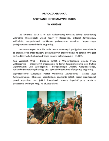 PRACA ZA GRANICĄ SPOTKANIE INFORMACYJNE EURES W KROŚNIE 25 kwietnia 2014 r. w auli Państwowej Wyższej Szkoły Zawodowej w Krośnie Wojewódzki Urząd Pracy w Rzeszowie, Oddział Zamiejscowy w Krośnie, zorganizował spotkanie poświęcone zasadom bezpiecznego podejmowania zatrudnienia za granicą. Istotnym wsparciem dla osób zainteresowanych podjęciem zatrudnienia za granicą oraz pracodawców poszukujących pracowników na terenie Unii jest sieć publicznych służb zatrudnienia państw członkowskich – EURES. Pan Wojciech Woś – Doradca EURES z Wojewódzkiego Urzędu Pracy w Rzeszowie - przedstawił prezentację na temat funkcjonowania sieci EURES w państwach Unii Europejskiej I Europejskiego Obszaru Gospodarczego, rodzajów świadczonych usług, oraz sposobów szukania ofert pracy za granicą. Zaprezentował Europejski Portal Mobilności Zawodowej i zasady jego funkcjonowania. Objaśniał uczestnikom spotkania jakich zasad przestrzegać przed wyjazdem oraz jakich formalności należy dopełnić przy zamiarze pozostania w danym kraju na dłuższy okres. Kolejnym punktem spotkania była prezentacja Pani Marty Russek – Doradcy EURES z WUP w Rzeszowie na temat zasad i przepisów dotyczących koordynacji systemów zabezpieczenia społecznego. Na podstawie tych regulacji, świadczenia z tytułu bezrobocia, niezdolności do pracy czy emerytury, mogą być obliczane z uwzględnieniem składek opłacanych we wszystkich krajach członkowskich UE. Zostały szczegółowo omówione przypadki z jakimi mogą się zetknąć osoby, które zamierzają zaliczać okresy zatrudnienia za granicą do celów nabycia prawa do zasiłku dla bezrobotnych, zasady transferu zasiłku za granicę czy też transferu zasiłku zagranicznego do Polski. Spotkanie cieszyło się dużym zainteresowaniem, uczestniczyło w nim ok. 130 osób. Pojawiły się również pytania skierowane do uczestniczącego w spotkaniu doradcy zawodowego. Zainteresowani pytali m. in. jak napisać życiorys w formacie europejskim, aby jak najlepiej odzwierciedlał posiadane przez nich umiejętności i przedstawiał zdobyte doświadczenie zawodowe.Na pytania odpowiadała Pani Małgorzata Dubis – Doradca Zawodowy z Wojewódzkiego Urzędu Pracy – Oddziału Zamiejscowego w Krośnie. Kolejną okazją do poznania zasad i przepisów regulujących podejmowanie zatrudnienia na terenie UE oraz dotyczących nabywania prawa do świadczeń w oparciu o składki opłacane w krajach członkowskich, będzie akcja „WAKACJE Z EURESem”. W okresie wakacyjnym, od czerwca do sierpnia, asystent EURES oraz doradcy zawodowi z Oddziału Zamiejscowego w Krośnie poprowadzą kampanię informacyjną na ten temat. Każda osoba zainteresowana będzie miała możliwość zapoznania się z bazą ofert pracy za granicą w ramach sieci EURES oraz zostaną jej przedstawione niezbędne informacje o bezpiecznych wyjazdach w poszukiwaniu zatrudnienia za granicą czy o formalnościach, jakie trzeba dopełnić po powrocie do kraju. Wszystkich chętnych, zainteresowanych tematyką poszukiwania pracy za granicą, zapraszamy do Oddziału Zamiejscowego w Krośnie, ul. Lewakowskiego 27B - tel.: 13 43 649 17, 13 43 634 26.