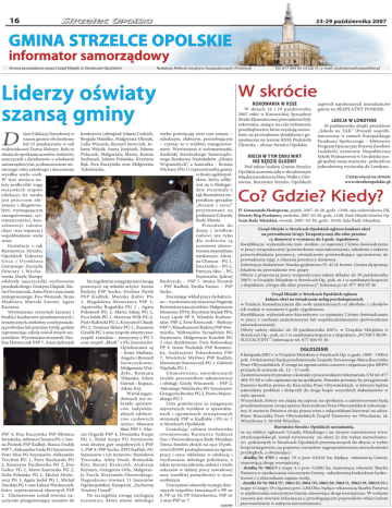 16 23-29 pa października aź 2007 GMINA STRZELCE OPOLSKIE informator samorządowy Strona prowadzona przez Urząd Miejski w Strzelcach Opolskich Redakcja: Referat Inicjatyw Gospodarczych i Promocji W skrócie Liderzy oświaty szansą gminy D zień Edukacji Narodowej w naszej gminie obchodzony był 15 października w sali widowiskowej Domu Kultury. Była to okazja do spotkania uczniów, rodziców, nauczycieli i dyrektorów z władzami samorządowymi, podsumowania minionego roku szkolnego i docenienia wysiłku wielu osób. W tym miejscu należy podkreślić wagę wszystkich etapów edukacji, bo nauka jest procesem złożonym i długotrwałym, wymagającym zaangażowania, systematyczności, konsekwencji, talentu, chęci oraz wsparcia i współdziałania wielu stron. Gratulacje z rąk Burmistrza Strzelec Opolskich Tadeusza Goca i Dyrektora Gminnego Zarządu Oświaty i Wychowania Józefa Kampy odebrały nauczycielki wychowania przedszkolnego: Grażyna Glapiak, Maria Owczarczak, Anna Pyto i nauczania zintegrowanego: Ewa Woźniak, Beata Madziara, Mariola Suwart, Agata Kaczmar. Wyróżnienia otrzymali laureaci i finaliści konkursów przedmiotowych i tematycznych, niektórzy z nich posiadają podwójne lub potrójne tytuły, godnie reprezentując szkołę wśród innych województw. Wyróżnienia otrzymali: Paulina Horoszczak PSP 7, Anna Jędrzejek PSP 4, Ewa Kuczyńska PSP Błotnica Strzelecka, Adriana Chmura PG 1, Iwona Piontek PSP Kadłub, Bianca Dudek PSP 7, Aleksandra Grela PG Szymiszów, Piotr Misz PG Szymiszów, Aleksander Trochim PG 1, Piotr Kucharski PG 2, Katarzyna Paczkowska PG 2, Ewa Golicz PG 2, Maria Kanturska PG 2, Zofia Polańska PG 2, Michał Michewicz PG 1, Agata Sudoł PG 1, Michał Zawilski PG 1 oraz Łukasz Wacławczyk, który reprezentował ekozespół PSP 2. Uhonorowani zostali również nauczyciele przygotowujący uczniów do konkursów i olimpiad: Jolanta Cedzich, Brygida Hadelko, Małgorzata Olesiak, Lidia Wieszala, Ryszard Szewczyk, Jolanta Wójcik, Aneta Junyszek, Jolanta Polaczek, Małgorzata Mania, Karina Suchanek, Jolanta Polańska, Krystyna Bąk, Ewa Raczyńska oraz Małgorzata Tułodziecka. Szczególnymi osiągnięciami mogą poszczycić się młodzi artyści: Iwona Radziej PSP Sucha, Ewelina Puzik PSP Kadłub, Monika Kubic PG 1, Magdalena Niemczura PSP 2, Agnieszka Rogulska PG 1 , Agata Połukord PG 2, Marta Sdzuj PG 2, Ewa Sołek PG 1, Martyna Wilk PG 2, Piotr Kaliński PG 2, Krzysztof Chudy PG 2, Damian Sklorz PG 1, Zuzanna Gawlik PG 1 oraz zespoły artystyczne: zespół teatralno – muzyczny z PG 1 oraz zespół „Blask” z PG Szymiszów. Opiekunami są : Anna Matheja, Angela i Ryszard Szewczykowie, Małgorzata Wojdyło, Romana Tokarska, Arleta Gornat – Kopacz, Adam Koj. Wśród nagrodzonych nie zabrakło sportowców: indywidualnych zdobywców czołowych miejsc: Mateusz Skut PSP 1, Marcin Orgacki PSP 4, Dominika Krupa PG 1, Rafał Szopa PG Szymiszów oraz drużyn gier zespołowych z PSP 1, PSP 4, PSP Sucha, ZPO Kadłub, PG Szymiszów i ich trenerów: Stanisława Trzeciaka, Aliny Siwek, Romualda Kity, Renaty Krawczyk, Andrzeja Kryszyn, Grzegorza Orła, Małgorzaty Froch, Krzysztofa Ostrowskiego. Nagrodzono również 11 laureatów Ogólnopolskiej Kampanii „Zachowaj Trzeźwy Umysł”. Na szczególną uwagę zasługują uczennice, które mimo młodego Tel. 077 404 93 53 lub 57, e-mail: [email protected] ROKOWANIA W KSSE wieku poświęcają swój czas innym – młodszym, słabszym, potrzebującym – czyniąc to z wielkim zaangażowaniem. Wyróżniono 4 wolontariuszki, finalistki Strzeleckiego Samorządowego Konkursu Nastolatków „Ośmiu Wspaniałych”, a laureatka - Renata Wichary (PG 1) reprezentantka gminy w finale ogólnopolskim, który odbywał się w Białogardzie otrzymała z rąk Burmistrza stypendium specjalne „Rozum i serce” przyznawane na podstawie Uchwały Rady Miasta. Powodem do dumy i źródłem radości nie tyko dla rodziców są uczniowie uhonorowani stypendium naukowym: Adriana Chmura - PG 1, Ewa Golicz – PG 2, Patrycja Muc – PG Szymiszów, Jędrzej Biedrzycki – PSP 7, Iwona Piontek – PSP Kadłub, Emilia Farion – PSP Sucha . Doceniając wkład pracy dydaktyczno – wychowawczej wręczono Nagrodę Burmistrza nauczycielom: Małgorzacie Morawiec PP10, Krystynie Stanek PP4, Łucji Lipok PP 9, Wandzie Karbowskiej PSP 2, Ewie Krawczuk – Bieleszy PSP 7, Klaudiuszowi Radziej PSP Rozmierka, Waltraudzie Szczędzinie PG Szymiszów, Małgorzacie Kozołub PG 2 oraz dyrektorom: Ewie Bukowskiej PP 9, Irenie Pachołek PSP Rozmierka, Andrzejowi Tokarskiemu PSP 7, Wiolettcie Myśliwy PSP Kadłub, Marzennie Staroszczyk PG 1, Gabrieli Wąchała PG 1. Uhonorowano, niewidocznych zwykle pracowników administracji i obsługi: Gizelę Wieczorek – PSP 2, Antoniego Malcherka PG Szymiszów, Grzegorza Burdzy PG 2, Piotra Majewskiego PG 1. Listy gratulacyjne za osiągnięcie najwyższych wyników w sprawdzianach i egzaminach zewnętrznych otrzymały PSP w Kadłubie i PG nr 1 w Strzelcach Opolskich. Gratulując całemu środowisku oświatowemu Burmistrz Tadeusz Goc i Przewodnicząca Rady Miejskiej Teresa Smoleń złożyli na ręce Dyrektora GZOiW podziękowania za ogrom pracy i serce wkładane w edukację i wychowanie młodego pokolenia, a także życzenia zdrowia, radości i wielu sukcesów w dalszej pracy zawodowej oraz wszelkiej pomyślności w życiu osobistym. Uroczystość ubarwiły występy dziecięcych zespołów tanecznych z PP nr 8, PP nr 10, PP Dziewkowice, PSP nr 2 oraz PSP nr 7. GZOIW W dniach 16 i 19 października 2007 roku w Katowickiej Specjalnej Strefie Ekonomicznej prowadzone były rokowania, mające na celu wyłonienie przedsiębiorstw, które uzyskają zezwolenie na prowadzenie działalności gospodarczej na terenie KSSE Podstrefa Gliwicka – obszar Strzelce Opolskie. NIECH W TYM DNIU NIKT NIE BĘDZIE GŁODNY Pod takim hasłem Gmina Strzelce Opolskie uczestniczyła w dwudziestym Międzynarodowym Dniu Walki z Ubóstwem. Burmistr