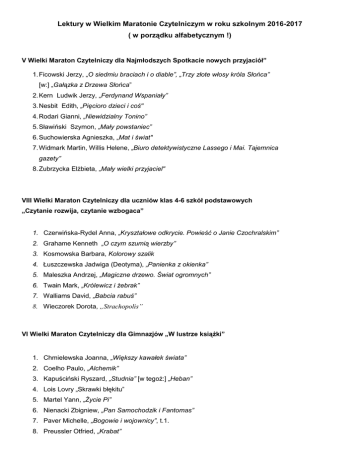 Lektury w Wielkim Maratonie Czytelniczym w roku szkolnym 2016-2017 ( w porządku alfabetycznym !) V Wielki Maraton Czytelniczy dla Najmłodszych Spotkacie nowych przyjaciół” 1. Ficowski Jerzy, „O siedmiu braciach i o diable”, „Trzy złote włosy króla Słońca” [w:] „Gałązka z Drzewa Słońca” 2. Kern Ludwik Jerzy, „Ferdynand Wspaniały” 3. Nesbit Edith, „Pięcioro dzieci i coś" 4. Rodari Gianni, „Niewidzialny Tonino” 5. Sławiński Szymon, „Mały powstaniec” 6. Suchowierska Agnieszka, „Mat i świat" 7. Widmark Martin, Willis Helene, „Biuro detektywistyczne Lassego i Mai. Tajemnica gazety” 8. Zubrzycka Elżbieta, „Mały wielki przyjaciel" VIII Wielki Maraton Czytelniczy dla uczniów klas 4-6 szkół podstawowych „Czytanie rozwija, czytanie wzbogaca” 1. Czerwińska-Rydel Anna, „Kryształowe odkrycie. Powieść o Janie Czochralskim” 2. Grahame Kenneth „O czym szumią wierzby” 3. Kosmowska Barbara, Kolorowy szalik 4. Łuszczewska Jadwiga (Deotyma), „Panienka z okienka” 5. Maleszka Andrzej, „Magiczne drzewo. Świat ogromnych” 6. Twain Mark, „Królewicz i żebrak” 7. Walliams David, „Babcia rabuś” 8. Wieczorek Dorota, „Strachopolis” VI Wielki Maraton Czytelniczy dla Gimnazjów „W lustrze książki” 1. Chmielewska Joanna, „Większy kawałek świata” 2. Coelho Paulo, „Alchemik” 3. Kapuściński Ryszard, „Studnia” [w tegoż:] „Heban” 4. Lois Lovry „Skrawki błękitu” 5. Martel Yann, „Życie Pi” 6. Nienacki Zbigniew, „Pan Samochodzik i Fantomas” 7. Paver Michelle, „Bogowie i wojownicy”, t.1. 8. Preussler Otfried, „Krabat” II Wielki Maraton Czytelniczy dla szkół ponadgimnazjalnych „Na literackim szlaku” 1. Erich Fromm, „O sztuce istnienia” (tylko Część I i Część II) 2. Glukohovsky Dmitry, „Metro 2034” 3. Schulz Bruno, „Sanatorium Pod Klepsydrą” 4. Tarjeji Vesas „Pałac lodowy" 5. Warda Małgorzata „5 sekund do Io" 6. Żukowska Izabela „Teufel”
