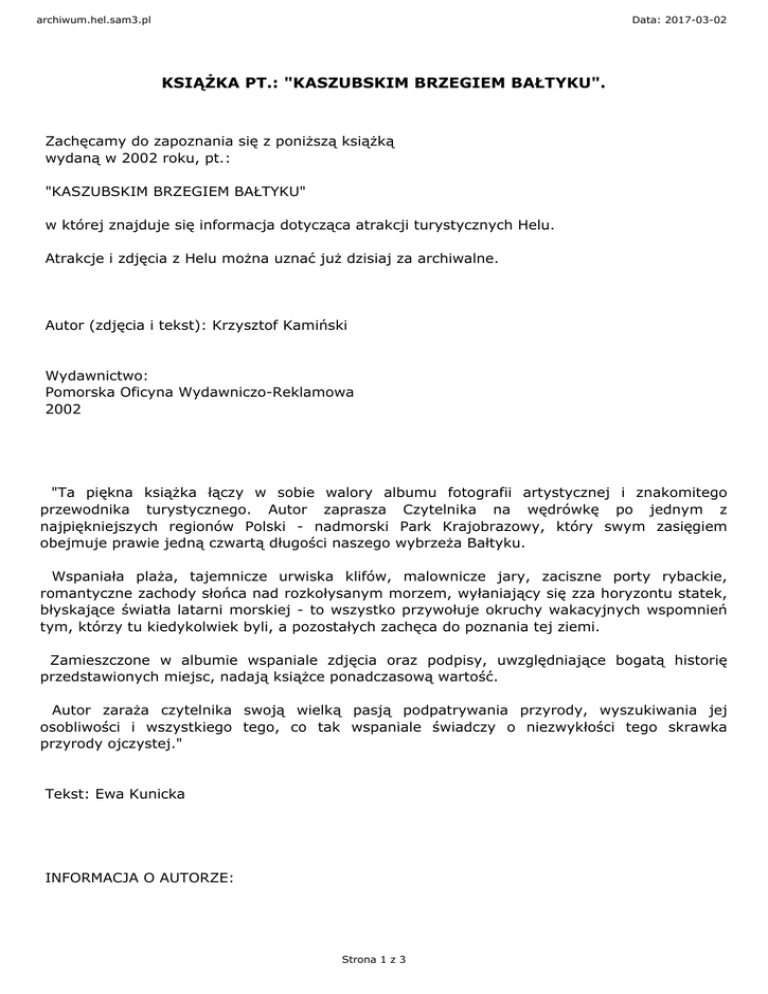 archiwum.hel.sam3.pl Data: 2017-03-02 KSIĄŻKA PT.: "KASZUBSKIM BRZEGIEM BAŁTYKU". Zachęcamy do zapoznania się z poniższą książką wydaną w 2002 roku, pt.: "KASZUBSKIM BRZEGIEM BAŁTYKU" w której znajduje się informacja dotycząca atrakcji turystycznych Helu. Atrakcje i zdjęcia z Helu można uznać już dzisiaj za archiwalne. Autor (zdjęcia i tekst): Krzysztof Kamiński Wydawnictwo: Pomorska Oficyna Wydawniczo-Reklamowa 2002 "Ta piękna książka łączy w sobie walory albumu fotografii artystycznej i znakomitego przewodnika turystycznego. Autor zaprasza Czytelnika na wędrówkę po jednym z najpiękniejszych regionów Polski - nadmorski Park Krajobrazowy, który swym zasięgiem obejmuje prawie jedną czwartą długości naszego wybrzeża Bałtyku. Wspaniała plaża, tajemnicze urwiska klifów, malownicze jary, zaciszne porty rybackie, romantyczne zachody słońca nad rozkołysanym morzem, wyłaniający się zza horyzontu statek, błyskające światła latarni morskiej - to wszystko przywołuje okruchy wakacyjnych wspomnień tym, którzy tu kiedykolwiek byli, a pozostałych zachęca do poznania tej ziemi. Zamieszczone w albumie wspaniale zdjęcia oraz podpisy, uwzględniające bogatą historię przedstawionych miejsc, nadają książce ponadczasową wartość. Autor zaraża czytelnika swoją wielką pasją podpatrywania przyrody, wyszukiwania jej osobliwości i wszystkiego tego, co tak wspaniale świadczy o niezwykłości tego skrawka przyrody ojczystej." Tekst: Ewa Kunicka INFORMACJA O AUTORZE: Strona 1 z 3 archiwum.hel.sam3.pl Data: 2017-03-02 KSIĄŻKA PT.: "KASZUBSKIM BRZEGIEM BAŁTYKU". ŹRÓDŁO: http://www.zpafgdansk.pl/galeria,kaminski-krzysztof.html Urodzony 11 czerwca 1939 roku w Opocznie. Pierwsze zdjęcie opublikowane w prasie - to portret Poli Raksy na okładce tygodnika studenckiego ITD w 1961 roku. Pierwszy większy artykuł opublikowany w prasie - to recenzja z wystawy fotografii o tematyce jazzowej Kuby Grabowieckiego w miesięczniku JAZZ w 1967 roku. Jest członkiem Stowarzyszenia Dziennikarzy Polskich od 1974 roku, obecnie Stowarzszenia Dziennikarzy Rzeczpospolitej Polskiej, Klubu Publicystów Morskich SDRP, Związku Polskich Artystów Fotografików od 1975 roku, Stowarzyszenia Marynistów Polskich, Klubu Małej Ojczyzny Kwidzynskiej. Fotografii uczył się od Edmunda Peplińskiego, twórcy słynnego zdjęcia z wydarzeń grudniowych w Gdyni. Przez cztery lata pracował w Stoczni Gdańskiej, gdzie założył pracownię fotografii barwnej. Kilka lat związany był etatowo z Polską Agencją Interpress w Warszawie, gdzie do zakresów jego obowiązków należało dostarczanie materiałów z północnych terenów Polski oraz zleconych zagranicznych. Przez wiele lat pracował w miesięczniku MORZE. Współpracownik wielu pism i wydawnictw krajowych oraz zagranicznych, w których opublikował kilkaset tekstów i fotoreportaży. Uczestnik 543 fotograficznych wystaw międzynarodowych i krajowych, zorganizowanych w 42 państwach. Jury tych wystaw przyznało zdjęciom Krzysztofa Kamińskiego 86 prestiżowych nagród. Grand prix, medale lub wyróżnienia otrzymał na wystawch w miastach m.in.: Budapeszt, Narvik, Hong Kong, Salerno, Haga, Taipei, Waszyngton, Grenoble, Santiago, Reus, Murray Bridge, Drezno, Seul, Rostock, Eindhoven, Bournemouth, Maitland, Rochester, Sao Paulo, Sydney, Southampton, Kuching, Berlin, Puyallup, Johannesburg, Rużomberok, Zadar, Matsuyama, Ryga, Pusan, Novy Sad, Safat. Jest autorem 10 wystaw indywidualnych. Wystawiał duże zestawy fotografii na wystawach autorów zaproszonych imiennie, m.in. na TOP FOTO 1970 w Zwevegem, Belgia, THE GREAT MASTERS OF PHOTOGRAPHY 1973 w Buenos Aires, Argentyna, WORLD EXHIBITION OF INVITATION PRINTS 1978 w Rawalpindi, Pakistan, MAN AND THE SEA 1986, Zadar, Jugosławia. Jest posiadaczem 11 tytułów honorowych, w tym ARTISTE FIAP (1965) i EXCELLENCE FIAP (1972), przyznanych przez organizacje fotograficzne w Polsce, USA, Szwajcarii i Niemczech. Jest honorowym członkiem Gdańskiego Towarzystwa Fotograficznego.Jest rzeczoznawcą d/s fotografii MKiS. Krzysztof Kamiński był jurorem wystaw krajowych i międzynarodowych m. in. pięciokrotnie podczas międzynarodowych wystaw fotografii VENUS w Krakowie, pięciokrotnie na Salonie Portretu w Gdańsku, czterokrotnie na DIA-POL w Radomiu, czterokrotnie na FOTOMONTAŻ w Grudziądzu, trzykrotnie na APOLLO w Olsztynie, na FOTO-EXPO w Poznaniu, na Biennale BŁ w Łodzi. Jest autorem książek/albumów: RATUSZ STAROMIEJSKI W GDAŃSKU (1967), ELBLĄG (1987), GDZIE LATARNIE MORSKIE MIGOCĄ... (1999), TRÓJMIEJSKI PARK KRAJOBRAZOWY - Cztery pory roku (2001), dodruk (2002), wydanie angielskie (2001), KASZUBSKIM BRZEGIEM BAŁTYKU - Nadmorski Park Krajobrazowy (2002), wydanie niemieckie (2002), GMINA WEJHEROWO (2009). Krzysztof Kamiński odbył szereg pełnomorskich rejsów na żaglowcach: "Dar Pomorza" 2x, "Kruzensztern", "Dar Młodzieży" 5x, "Zawisza Czarny", "Zew Morza", "Henryk Rutkowski", "Generał Zaruski", "Oceania", Mir", "Fryderyk Chopin" i innych oraz na statkach handlowych, rybackich i okrętach wojennych. Uczestniczył w Operation Sail 1974 na żaglowcu "Kruzensztern" i w Operation Sail 1982 na "Darze Młodzieży". Brał udział w wyprawie na Strona 2 z 3 archiwum.hel.sam3.pl Data: 2017-03-02 KSIĄŻKA PT.: "KASZUBSKIM BRZEGIEM BAŁTYKU". Spitsbergen w 1974 roku.Krzysztof Kamiński pełnił wiele funkcji społecznie. Był m.in. v-prezesem Federacji Amatorskich Stowarzyszeń Fotograficznych w Polsce (1966 - 1972), sekretarzem, v-prezesem i prezesem Gdańskiego Towarzystwa Fotograficznego (1960 - 1968), członkiem komisji artystycznej GTF (1964 - 1978), członkiem Komisji Fotografii Krajoznawczej ZG PTTK (1971 - 1975), v-prezesem okręgu gdańskiego Związku Polskich Artystów Fotografików (1976 - 1983), przewodniczącym komisji artystycznej/kwalifikacyjnej ZPAF w Gdańsku (1976 aż do jej likwidacji w roku 2005) i członkiem reaktywowanej komisji artystycznej od 2011 r