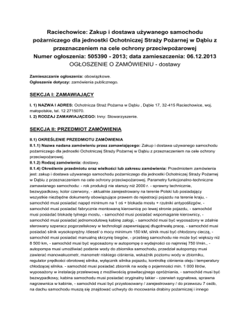 Raciechowice: Zakup i dostawa używanego samochodu pożarniczego dla jednostki Ochotniczej Straży Pożarnej w Dąbiu z przeznaczeniem na cele ochrony przeciwpożarowej Numer ogłoszenia: 505390 - 2013; data zamieszczenia: 06.12.2013 OGŁOSZENIE O ZAMÓWIENIU - dostawy Zamieszczanie ogłoszenia: obowiązkowe. Ogłoszenie dotyczy: zamówienia publicznego. SEKCJA I: ZAMAWIAJĄCY I. 1) NAZWA I ADRES: Ochotnicza Straż Pożarna w Dąbiu , Dąbie 17, 32-415 Raciechowice, woj. małopolskie, tel. 12 2715070. I. 2) RODZAJ ZAMAWIAJĄCEGO: Inny: Stowarzyszenie. SEKCJA II: PRZEDMIOT ZAMÓWIENIA II.1) OKREŚLENIE PRZEDMIOTU ZAMÓWIENIA II.1.1) Nazwa nadana zamówieniu przez zamawiającego: Zakup i dostawa używanego samochodu pożarniczego dla jednostki Ochotniczej Straży Pożarnej w Dąbiu z przeznaczeniem na cele ochrony przeciwpożarowej. II.1.2) Rodzaj zamówienia: dostawy. II.1.4) Określenie przedmiotu oraz wielkości lub zakresu zamówienia: Przedmiotem zamówienia jest: zakup i dostawa używanego samochodu pożarniczego dla jednostki Ochotniczej Straży Pożarnej w Dąbiu z przeznaczeniem na cele ochrony przeciwpożarowej. Parametry funkcjonalno-techniczne zamawianego samochodu: - rok produkcji nie starszy niż 2000 r. - sprawny technicznie, bezwypadkowy, kolor czerwony, - aktualnie zarejestrowany na terenie Polski lub posiadający wszystkie niezbędne dokumenty obowiązujące prawem do rejestracji pojazdu na terenie kraju, samochód musi posiadać napęd minimum na 1 oś + blokada mostu + rzutniki antypoślizgów, samochód musi posiadać fabrycznie montowaną kierownicę po lewej stronie pojazdu, - samochód musi posiadać blokadę tylnego mostu, - samochód musi posiadać wspomaganie kierownicy, samochód musi posiadać jednomodułową kabinę załogi, - samochód musi być wyposażony w zdalnie sterowany szperacz pogorzeliskowy w technologii zapewniającej długotrwałą pracę, - samochód musi posiadać silnik wysokoprężny /diesel/ o mocy minimum 150 kM, silnik musi być chłodzony cieczą, samochód musi posiadać manualną skrzynię biegów, - przebieg samochodu nie może być większy niż 8 500 km, - samochód musi być wyposażony w autopompę o wydajności co najmniej 750 l/min., autopompa musi umożliwiać podanie wody do zbiornika samochodu, przedział autopompy musi zawierać manowakuometr, manometr niskiego ciśnienia, wskaźnik poziomu wody w zbiorniku, regulator prędkości obrotowej silnika, wyłącznik silnika pojazdu, kontrolkę ciśnienia oleju i temperatury chłodzącej silnika. - samochód musi posiadać zbiornik na wodę o pojemności min. 1 000 litrów, wyposażony w instalację przelewową z możliwością grawitacyjnego opróżniania, - samochód musi być bezwypadkowy, kabina samochodu musi posiadać oryginalny lakier - czerwień sygnałowa, sprawna nagrzewnica w kabinie, - samochód musi być przystosowany / zarejestrowany / do przewozu 7 osób, na dachu samochodu muszą się znajdować uchwyty do mocowania drabiny pożarniczej i innego dodatkowego sprzętu technicznego, pożarniczego, - uchwyt na drabinę i węże ssawne musi być mocowany na zabudowie samochodu, zabudowa samochodu musi być wykonana ze stali nierdzewnej lub aluminium, - samochód musi posiadać urządzenia sygnalizacyjne pojazdu uprzywilejowanego świetlne (belka ostrzegawcza) i dźwiękowe, - samochód musi posiadać oświetlenie pola pracy w technologii zapewniającej długotrwałą pracę, - samochód musi posiadać linię szybkiego natarcia zakończony prądownicą o długości minimum 40m, - zużycie ogumienia max 30%, - samochód winien być wyposażony w drobny sprzęt gaśniczy, w tym agregat prądotwórczy o mocy min. 2,2 kVa, wciągarkę elektryczną o uciągu minimum 13000 Ibs, radiostację przewoźną z wgraną obsadą kanałową wg wytycznych Komendy Głównej PSP, pneumatycznie wysuwany maszt oświetleniowy wraz z najaśnicami o mocy min. 2x500W, drabinę aluminiową dwu przęsłową, dodatkowy sygnał pneumatyczny, 2 ładowalne latarki wraz ze stacjami dokującymi. - karoseria oraz zabudowa samochodu nie może posiadać żadnych widocznych miejsc korozji, - w przypadku samochodu sprowadzonego z zagranicy; samochód musi posiadać wszystkie niezbędne dokumenty obowiązujące prawem do rejestracji pojazdu na terenie kraju, oferent musi dołączyć do oferty dowód rejestracyjny pojazdu oraz kartę pojazdu, aktualne badanie techniczne pojazdu na terytorium kraju, tłumaczenie dokumentów. II.1.6) Wspólny Słownik Zamówień (CPV): 34.14.42.10-3. II.1.7) Czy dopuszcza się złożenie oferty częściowej: nie. II.1.8) Czy dopuszcza się złożenie oferty wariantowej: nie. II.2) CZAS TRWANIA ZAMÓWIENIA LUB TERMIN WYKONANIA: Zakończenie: 31.12.2013. SEKCJA III: INFORMACJE O CHARAKTERZE PRAWNYM, EKONOMICZNYM, FINANSOWYM I TECHNICZNYM III.1) WADIUM Informacja na temat wadium: Zamawiający nie wymaga wniesienia wadium III.2) ZALICZKI III.3) WARUNKI UDZIAŁU W POSTĘPOWANIU ORAZ OPIS SPOSOBU DOKONYWANIA OCENY SPEŁNIANIA TYCH WARUNKÓW III. 3.1) Uprawnienia do wykonywania określonej działalności lub czynności, jeżeli przepisy prawa nakładają obowiązek ich posiadania Opis sposobu dokonywania oceny spełniania tego warunku o Zamawiający nie opisuje, nie wyznacza szczegółowego warunku w tym zakresie. Wykonawca potwierdza spełnianie warunku poprzez złożenie oświadczenia (zał. Nr 2 do SIWZ); III.3.2) Wiedza i doświadczenie Opis sposobu dokonywania oceny spełniania tego warunku o Zamawiający nie opisuje, nie wyznacza szczegółowego warunku w tym zakresie. Wykonawca potwierdza spełnianie warunku poprzez złożenie oświadczenia (zał. Nr 2 do SIWZ) III.3.3) Potencjał techniczny Opis sposobu dokonywania oceny spełniania tego warunku o Zamawiający nie opisuje, nie wyznacza szczegółowego warunku w tym zakresie. Wykonawca potwierdza spełnianie warunku poprzez złożenie oświadczenia (zał. Nr 2 do SIWZ); III.3.4) Osoby zdolne do wykonania zamówienia Opis sposobu do