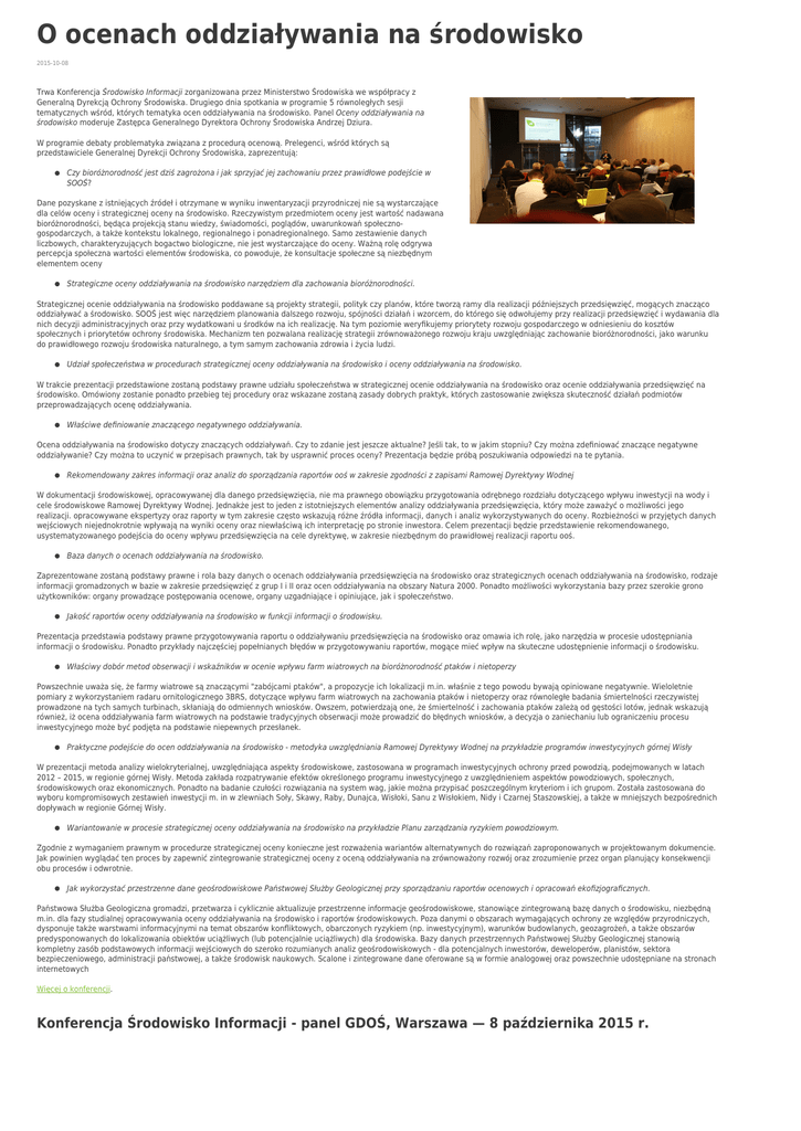 O ocenach oddziaływania na środowisko 2015-10-08 Trwa Konferencja Środowisko Informacji zorganizowana przez Ministerstwo Środowiska we współpracy z Generalną Dyrekcją Ochrony Środowiska. Drugiego dnia spotkania w programie 5 równoległych sesji tematycznych wśród, których tematyka ocen oddziaływania na środowisko. Panel Oceny oddziaływania na środowisko moderuje Zastępca Generalnego Dyrektora Ochrony Środowiska Andrzej Dziura. W programie debaty problematyka związana z procedurą ocenową. Prelegenci, wśród których są przedstawiciele Generalnej Dyrekcji Ochrony Środowiska, zaprezentują: Czy bioróżnorodność jest dziś zagrożona i jak sprzyjać jej zachowaniu przez prawidłowe podejście w SOOŚ? Dane pozyskane z istniejących źródeł i otrzymane w wyniku inwentaryzacji przyrodniczej nie są wystarczające dla celów oceny i strategicznej oceny na środowisko. Rzeczywistym przedmiotem oceny jest wartość nadawana bioróżnorodności, będąca projekcją stanu wiedzy, świadomości, poglądów, uwarunkowań społecznogospodarczych, a także kontekstu lokalnego, regionalnego i ponadregionalnego. Samo zestawienie danych liczbowych, charakteryzujących bogactwo biologiczne, nie jest wystarczające do oceny. Ważną rolę odgrywa percepcja społeczna wartości elementów środowiska, co powoduje, że konsultacje społeczne są niezbędnym elementem oceny Strategiczne oceny oddziaływania na środowisko narzędziem dla zachowania bioróżnorodności. Strategicznej ocenie oddziaływania na środowisko poddawane są projekty strategii, polityk czy planów, które tworzą ramy dla realizacji późniejszych przedsięwzięć, mogących znacząco oddziaływać a środowisko. SOOŚ jest więc narzędziem planowania dalszego rozwoju, spójności działań i wzorcem, do którego się odwołujemy przy realizacji przedsięwzięć i wydawania dla nich decyzji administracyjnych oraz przy wydatkowani u środków na ich realizację. Na tym poziomie weryfikujemy priorytety rozwoju gospodarczego w odniesieniu do kosztów społecznych i priorytetów ochrony środowiska. Mechanizm ten pozwalana realizację strategii zrównoważonego rozwoju kraju uwzględniając zachowanie bioróżnorodności, jako warunku do prawidłowego rozwoju środowiska naturalnego, a tym samym zachowania zdrowia i życia ludzi. Udział społeczeństwa w procedurach strategicznej oceny oddziaływania na środowisko i oceny oddziaływania na środowisko. W trakcie prezentacji przedstawione zostaną podstawy prawne udziału społeczeństwa w strategicznej ocenie oddziaływania na środowisko oraz ocenie oddziaływania przedsięwzięć na środowisko. Omówiony zostanie ponadto przebieg tej procedury oraz wskazane zostaną zasady dobrych praktyk, których zastosowanie zwiększa skuteczność działań podmiotów przeprowadzających ocenę oddziaływania. Właściwe definiowanie znaczącego negatywnego oddziaływania. Ocena oddziaływania na środowisko dotyczy znaczących oddziaływań. Czy to zdanie jest jeszcze aktualne? Jeśli tak, to w jakim stopniu? Czy można zdefiniować znaczące negatywne oddziaływanie? Czy można to uczynić w przepisach prawnych, tak by usprawnić proces oceny? Prezentacja będzie próbą poszukiwania odpowiedzi na te pytania. Rekomendowany zakres informacji oraz analiz do sporządzania raportów ooś w zakresie zgodności z zapisami Ramowej Dyrektywy Wodnej W dokumentacji środowiskowej, opracowywanej dla danego przedsięwzięcia, nie ma prawnego obowiązku przygotowania odrębnego rozdziału dotyczącego wpływu inwestycji na wody i cele środowiskowe Ramowej Dyrektywy Wodnej. Jednakże jest to jeden z istotniejszych elementów analizy oddziaływania przedsięwzięcia, który może zaważyć o możliwości jego realizacji. opracowywane ekspertyzy oraz raporty w tym zakresie często wskazują różne źródła informacji, danych i analiz wykorzystywanych do oceny. Rozbieżności w przyjętych danych wejściowych niejednokrotnie wpływają na wyniki oceny oraz niewłaściwą ich interpretację po stronie inwestora. Celem prezentacji będzie przedstawienie rekomendowanego, usystematyzowanego podejścia do oceny wpływu przedsięwzięcia na cele dyrektywę, w zakresie niezbędnym do prawidłowej realizacji raportu ooś. Baza danych o ocenach oddziaływania na środowisko. Zaprezentowane zostaną podstawy prawne i rola bazy danych o ocenach oddziaływania przedsięwzięcia na środowisko oraz strategicznych ocenach oddziaływania na środowisko, rodzaje informacji gromadzonych w bazie w zakresie przedsięwzięć z grup I i II oraz ocen oddziaływania na obszary Natura 2000. Ponadto możliwości wykorzystania bazy przez szerokie grono użytkowników: organy prowadzące postępowania ocenowe, organy uzgadniające i opiniujące, jak i społeczeństwo. Jakość raportów oceny oddziaływania na środowisko w funkcji informacji o środowisku. Prezentacja przedstawia podstawy prawne przygotowywania raportu o oddziaływaniu przedsięwzięcia na środowisko oraz omawia ich rolę, jako narzędzia w procesie udostępniania informacji o środowisku. Ponadto przykłady najczęściej popełnianych błędów w przygotowywaniu raportów, mogące mieć wpływ na skuteczne udostępnienie informacji o środowisku. Właściwy dobór metod obserwacji i wskaźników w ocenie wpływu farm wiatrowych na bioróżnorodność ptaków i nietoperzy Powszechnie uważa się, że farmy wiatrowe są znaczącymi "zabójcami ptaków", a propozycje ich lokalizacji m.in. właśnie z tego powodu bywają opiniowane negatywnie. Wieloletnie pomiary z wykorzystaniem radaru ornitologicznego 3BRS, dotyczące wpływu farm wiatrowych na zachowania ptaków i nietoperzy oraz równoległe badania śmiertelności rzeczywistej prowadzone na tych samych turbinach, skłaniają do odmiennych wniosków. Owszem, potwierdzają one, że śmiertelność i zachowania ptaków zależą od gęstości lotów, jednak wskazują również, iż ocena 
