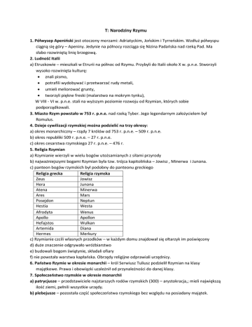 T: Narodziny Rzymu 1. Półwysep Apenioski jest otoczony morzami: Adriatyckim, Jooskim i Tyrreoskim. Wzdłuż półwyspu ciągną się góry – Apeniny. Jedynie na północy rozciąga się Nizina Padaoska nad rzeką Pad. Ma słabo rozwiniętą linię brzegową. 2. Ludność Italii a) Etruskowie – mieszkali w Etrurii na północ od Rzymu. Przybyli do Italii około X w. p.n.e. Stworzyli wysoko rozwinięta kulturę: znali pismo, potrafili wydobywad i przetwarzad rudy metali, umieli meliorowad grunty, tworzyli piękne freski (malarstwo na mokrym tynku), W VIII - VI w. p.n.e. stali na wyższym poziomie rozwoju od Rzymian, których sobie podporządkowali. 3. Miasto Rzym powstało w 753 r. p.n.e. nad rzeką Tyber. Jego legendarnym założycielem był Romulus. 4. Dzieje cywilizacji rzymskiej można podzielić na trzy okresy: a) okres monarchiczny – rządy 7 królów od 753 r. p.n.e. – 509 r. p.n.e. b) okres republiki 509 r. p.n.e. – 27 r. p.n.e. c) okres cesarstwa rzymskiego 27 r. p.n.e. – 476 r. 5. Religia Rzymian a) Rzymianie wierzyli w wielu bogów utożsamianych z siłami przyrody b) najważniejszymi bogami Rzymian była tzw. trójca kapitolioska – Jowisz , Minerwa i Junona. c) panteon bogów rzymskich był podobny do panteonu greckiego Religia grecka Religia rzymska Zeus Jowisz Hera Junona Atena Minerwa Ares Mars Posejdon Neptun Hestia Westa Afrodyta Wenus Apollo Apollon Hefajstos Wulkan Artemida Diana Hermes Merkury c) Rzymianie czcili własnych przodków – w każdym domu znajdował się ołtarzyk im poświęcony d) duże znaczenie odgrywało wróżbiarstwo e) budowali bogom świątynie, składali ofiary f) nie powstała warstwa kapłaoska. Obrzędy religijne odprawiali urzędnicy. 6. Paostwo Rzymie w okresie monarchii – król Serwiusz Tuliusz podzielił Rzymian na klasy majątkowe. Prawa i obowiązki uzależnił od przynależności do danej klasy. 7. Społeczeostwo rzymskie w okresie monarchii a) patrycjusze – przedstawiciele najstarszych rodów rzymskich (300) – arystokracja,; mieli największą ilośd ziemi, pełnili wszystkie urzędy. b) plebejusze – pozostała częśd społeczeostwa rzymskiego bez względu na posiadany majątek.