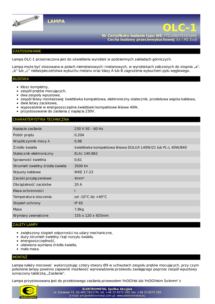 LAMPA OLC-1 Nr Certyfikatu badania typu WE: FTZU06ATEX0169X Cecha budowy przeciwwybuchowej: Ex I M2 Exdl ZASTOSOWANIE Lampa OLC-1 przeznaczona jest do oświetlania wyrobisk w podziemnych zakładach górniczych. Lampa może być stosowana w polach niemetanowych i metanowych, w wyrobiskach zaliczonych do stopnia „a”, „b” lub „c” niebezpieczeństwa wybuchu metanu oraz klasy A lub B zagrożenia wybuchem pyłu węglowego. BUDOWA Klosz kompletny, zespół prętów mocujących, dwa zespoły wpustowe, zespół listwy montażowej: świetlówka kompaktowa, elektroniczny statecznik, przelotowa wiązka kablowa, dwie listwy zaciskowe, wyposażenie w energooszczędne świetlówki kompaktowe liniowe 40W, przystosowanie do zasilania z napięcia 230V. CHARAKTERYSTYKA TECHNICZNA Napięcie zasilania 230 V 50 – 60 Hz Pobór prądu 0,20A Współczynnik mocy λ 0,98 Źródło światła świetlówka kompaktowa liniowa DULUX L40W/21 lub PL-L 40W/840 Statecznik elektroniczny ELXc 140.862 Sprawność świetlna 0,61 Strumień świetlny źródła światła 3500 lm Wpusty kablowe WKE 17-23 Zaciski przyłączeniowe 4mm² Obciążalność zacisków 20 A Klasa ochronności I Temperatura otoczenia od -10°C do +40°C Stopień ochrony IP 65 Masa 7,8kg Wymiary zewnętrzne 155 x 120 x 925mm ZALETY LAMPY zwiększony stopień odporności na udary mechaniczne, duży strumień świetlny i kąt rozsyłu światła, energooszczędność, ułatwiona wymiana źródła światła, mała masa. MONTAŻ Lampę należy mocować wykorzystując cztery otwory Ø9 w uchwytach zespołu prętów mocujących, przy czym położenie lampy powinno zapewnić możliwość wprowadzenia przewodu zasilającego poprzez zespół wpustowy oznaczony tabliczką „Zasilanie”. Lampa przystosowana jest do przelotowego zasilania przewodem YnOGYek lub YnOGYekm 5x4mm² z ELEKTROMETAL Spółka Akcyjna ul. Stawowa 71, 43-400 CIESZYN, tel. +48 33 8575 200; fax: +48 33 8575 205 e-mail: [email protected]; www.elektrometal.eu kopalnianego, ognioszczelnego zespołu transformatorowego. W przypadku wykorzystania lampy jako przelotowej należy zdemontować zaślepkę z zespołu wpustu kablowego oznaczonego tabliczką „Przelot”. W lampie końcowej należy w/w zaślepkę pozostawić. ELEKTROMETAL Spółka Akcyjna ul. Stawowa 71, 43-400 CIESZYN, tel. +48 33 8575 200; fax: +48 33 8575 205 e-mail: [email protected]; www.elektrometal.eu