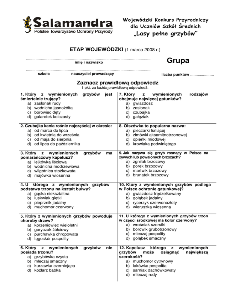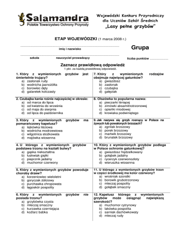 Wojewódzki Konkurs Przyrodniczy dla Uczniów Szkół Średnich „Lasy pełne grzybów” ETAP WOJEWÓDZKI (1 marca 2008 r.) ..................................................................................................................... imię i nazwisko ..................................................................................................................... szkoła nauczyciel prowadzący Grupa liczba punktów ...................... Zaznacz prawidłową odpowiedź 1 pkt. za każdą prawidłową odpowiedź. 1. Który z wymienionych śmiertelnie trujący? a) zasłonak rudy b) wodnicha jasnożółta c) borowiec dęty d) galaretek kolczasty grzybów jest 7. Który z wymienionych obejmuje najwięcej gatunków? a) gwiazdosz b) zasłonak c) czubajka d) gałęziak rodzajów 2. Czubajka kania rośnie najczęściej w okresie: a) od marca do lipca b) od kwietnia do września c) od maja do sierpnia d) od lipca do października 8. Olszówka to popularna nazwa: a) pieczarki lśniącej b) zimówki aksamitnotrzonowej c) opieńki miodowej d) krowiaka podwiniętego 3. Który z wymienionych grzybów pomarańczowy kapelusz? a) lejkówka liściowa b) wodnicha modrzewiowa c) wilgotnica stożkowata d) majówka wiosenna 9. Jak nazywa się grzyb rosnący w Polsce na żywych lub powalonych brzozach? a) zgnilak brzozowy b) porek brzozowy c) martwik brzozowy d) brunatek brzozowy ma 4. U którego z wymienionych grzybów podstawa trzonu na kształt bulwy? a) gąska niekształtna b) łuskwiak giętki c) pieprznik jadalny d) muchomor czerwony 10. Który z wymienionych grzybów podlega w Polsce ochronie gatunkowej? a) gwiazdosz frędzelkowany b) gołąbek jadalny c) rycerzyk czerwonozłoty d) wieruszka wiosenna 5. Który z wymienionych grzybów powoduje choroby drzew? a) korzeniowiec wieloletni b) goryczak żółciowy c) purchawka chropowata d) tęgoskór pospolity 11. U którego z wymienionych grzybów trzon w części środkowej ma kolor czerwony? a) wrośniak szorstki b) borowik grubotrzonowy c) mleczaj pospolity d) gołąbek smaczny 6. Który z wymienionych posiada trzonu? a) grzybówka czysta b) mleczaj smaczny c) kurzawka czerniejąca d) koźlarz babka 12. Kapelusz którego z wymienionych grzybów może osiągnąć największą szerokość? a) muchomor cytrynowy b) lakówka pospolita c) sarniak dachówkowaty d) mleczaj rudy grzybów nie Wojewódzki Konkurs Przyrodniczy dla Uczniów Szkół Średnich „Lasy pełne grzybów” 13. Pod jakimi głównie drzewami występuje pieczarka lśniąca? a) jodłami b) świerkami c) wiązami d) grabami 19. Który z wymienionych grzybów jest w Polsce najrzadszy? a) pieniążek dębowy b) modrzewnik (pniarek) lekarski c) muchomor plamisty d) włóknouszek promienisty 14. Który z wymienionych grzybów poraża zwykle stare i osłabione drzewa liściaste, wnikając poprzez rany i pęknięcia spowodowane przez mróz? a) piestrzyca zwyczajna b) klejówka plamista c) purchawka brunatna d) żagiew łuskowata 20. Nazwa „mleczaj” pochodzi od: a) mlecznobiałej barwy kapelusza b) mlecznobiałej barwy trzonu c) wydzielania przez owocniki tzw. mleczka d) wydzielania przez grzyb zapachu przypominającego przegotowane mleko 15. Jakie szkodliwe działanie mają trujące substancje zawarte w muchomorze sromotnikowym? a) uszkadzają głównie nerki b) uszkadzają głównie wątrobę c) uszkadzają głównie mózg d) uszkadzają głównie serce 21. Piestrzenicę kasztanowatą spotkamy najczęściej: a) na piaszczystych, suchych glebach, w lasach iglastych b) na rozkładającym się drewnie w ściółce lasów liściastych c) na wilgotnych glebach w lasach łęgowych d) na pniach w lasach iglastych 16. Maślak zwyczajny występuje głównie: a) w lasach mieszanych b) w lasach bukowych c) w lasach łęgowych d) w lasach sosnowych 22. Który z wymienionych grzybów jest jadalny? a) grzybówka czysta b) gąsówka naga c) borowik purpurowy d) kubek prążkowany 17. U którego z wymienionych grzybów trzon pokryty jest licznymi kosmkami? a) sromotnik bezwstydny b) lejkówka pachnąca c) koźlarz babka d) podgrzybek zajączek 23. Która z wymienionych cech dotyczy hełmówki obrzeżonej? a) zawiera śmiertelnie trującą substancję b) jest trująca, ale jej spożycie nie powoduje zgonu c) jest jadalna, ale niesmaczna d) jest smacznym grzybem jadalnym 18. Gąskę zielonkę można łatwo pomylić z: a) gąską niekształtną b) gąską siarkową c) gąską mydlaną d) gąską krowią 24. Gąsówka naga ma trzon koloru: a) białego b) żółtego c) czerwonego d) fioletowego