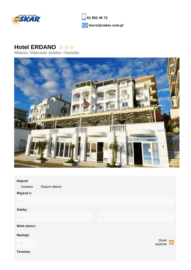61 852 45 72 [email protected] Hotel ERDANO Albania / Wybrzeże Jońskie / Saranda Dojazd: Autobus Dojazd własny Wyjazd z: Osoby: Wiek dzieci: Noclegi: Dzień wyjazdu Terminy: Pokój: Wyżywienie: Najtańsza oferta First Minute cena katalogowa do 5 marca 2017: 898,20 zł do 5 marca 2017: 898,20 zł do 30 marca 2017: 2095,80 zł do 30 marca 2017: 2095,80 zł Suma:2994,00 zł Suma: 2994,00 zł Opis oferty Miejscowość Atuty Wycieczki bliskość plaży fakultatywne piękny taras z widokiem na morze i na wyspę Korfu bezpłatne leżaki i parasole na plaży Opinie rodzinom z dziećmi przyjazny bezpłatny Internet Wi-Fi bezpłatna klimatyzacja Rozkład jazdy Położenie Hotel znajduje się w odległości około 400 m od promenady i centrum miejscowości w południowej części Sarandy. Prywatna plaża znajduję się przy sąsiednim kompleksie hotelowym (dzieli ją przejście przez ulicę w odległośi 50 metrów od hotelu). Plaża jest kamienista, a na niej do dyspozycji są bezpłatne parasole i leżaki. Istnieje możliwość korzystania z basenu za dodatkową opłatą. Na parterze hotelu znajduje się restauracja oraz taras widokowy. Zakwaterowanie Hotel posiada pokoje 2, 3 i 4 osobowe oraz apartamenty typu 2+2 oraz 2+2+2. Pokoje 2 osobowe - każdy pokój ma łazienkę z prysznicem oraz wyposażony jest w lodówkę, TV, bezpłatną klimatyzację i balkon. Większość pokoi jest z bezpośrednim widokiem na morze. Pokoje znajdujące się na ostatnim piętrze (IV - poddasze) mają widok na morze z tarasów o powierzchni od 15 do 25 m2. Pokój 3/4 osobowy - znajduje się na I piętrze budynku; pokój ma łazienkę z prysznicem i połączony jest z aneksem kuchennym. Wyposażony jest w TV, bezpłatną klimatyzację i salon z bocznym widokiem na morze. Apartament typu 2+2 - znajduje się na II piętrze; apartament składa się z dwóch osobnych sypialni i wspólnej łazienki z prysznicem. Każdy pokój w apartamencie ma własną lodówkę, TV, klimatyzację oraz balkon w widokiem na morze. Apartament typu 2+2+2 o pow. około 100 m2 - znajduje się na III piętrze; składa się z dużego salonu połączonego z kuchnią, gdzie znajduje się rozkładana kanapa i TV. Zarówno z salonu, jak i z kuchni jest wyjście na balkon z widokiem na morze. W apartamencie znajduje się wspólna łazienka z wanną z hydromasażem oraz dwie oddzielne sypialnie, z których każda ma klimatyzację oraz indywidualny balkon - w tym jedna bezpośredni widok na morze. Wszystkie pokoje i apartamenty wyposażone są w ręczniki oraz suszarki do włosów. Dostępne opcje zakwaterowania pokój 2 os pokój 2 os z widokiem na morze pokój 2 os. na 4. piętrze z tarasem i widokiem na morze pokój 3-4 os. z aneksem kuchennym apartament 4 os. [2+2] z widokiem na morze apartament 5-6 os [2+2+2] z kuchnią i widokiem na morze dokwaterowanie (bez dopłat*) lub pokój 1 osobowy (dopłata) * dokwaterowanie: osoby wybierając się pojedynczo, które w momencie rezerwacji nie dokonują dopłaty do pokoju jednoosobowego, mogą zostać zakwaterowanie z jedną lub kilkoma osobami tej samej płci w tzw. opcji dokwaterowania; jednakże w przypadku braku innej rezerwacji w opcji dokwaterowania w terminie do 7 dni przed rozpoczęciem imprezy wymagana jest dopłata do pokoju 1 osobowego Dostępne opcje wyżywienia śniadania - bufet (w cenie) obiadokolacje - serwowane (dopłata opcjonalna) Pakiet KOMFORT gwarancja wyboru miejsca w autokarze napoje w autokarze w cenie (6 x do wyboru: kawa, herbata, zimny napój 0,2l) cena: 50 zł/os Pakiet PRESTIGE gwarancja wyboru miejsca w autokarze napoje w autokarze w cenie (6 x do wyboru: kawa, herbata, zimny napój 0,2l) pierwszeństwo wejścia na pokład autokaru nadbagaż 5 kg w cenie suchy prowiant na drogę powrotną cena: 100 zł/os Karta Dużej Rodziny www.oskar.com.pl/zalaczniki/karta_duzej_rodziny Warunki promocji FIRST MINUTE www.oskar.com.pl/zalaczniki/warunki_promocji Ubezpieczenie Warunki ubezpieczenia Bezpieczne Podróże Signal Iduna dokument do pobrania www.oskar.com.pl/zalaczniki/owu Warunki ubezpieczenia Kosztów Imprezy Turystycznej Signal Iduna dokument do pobrania www.oskar.com.pl/zalaczniki/owurg Turystyczny Fundusz Gwarancyjny W związku z powołaniem do życia w dniu 26.11.2016 Turystycznego Funduszu Gwarancyjnego każdy klient Biura Podróży Oskar zobowiązany jest do zapłaty kwoty w wysokości 10zł/os. przy każdorazowej rezerwacji imprezy turystycznej (obowiązuje od dnia 26.11.2016). Kwota przeznaczona na Turystyczny Fundusz Gwarancyjny zostanie automatycznie doliczona do wartości rezerwacji (w momencie jej dokonania). Wyjątkiem są imprezy turystyczne odbywające się w krajach posiadających granicę z Rzeczpospolitą Polską. Składka nie jest przychodem biura. Udogodnienia Widok na morze Klimatyzacja Regulowane fotele Tacki Multimedia Nowoczesna flota Zawodowy kierowca Pasy bezpieczeństwa Toaleta w autokarze Podnóżki Wi-Fi Lodówka Blisko centrum Życie nocne Bez paszportu Restauracja hotelowa Region nadmorski Program ramowy Dzień 1 - 2 Wyjazd z Polski zgodnie z rozkładem jazdy autokarów. Przejazd przez Czechy, Słowację, Węgry, Serbię, Macedonię, Grecję. Dzień 3 Przyjazd do Sarandy w godzinach popołudniowych. Zakwaterowanie. Spotkanie informacyjne z rezydentem. Dzień 3 - 8 Pobyt na miejscu, możliwość korzystania z dodatkowych wycieczek fakultatywnych - Korfu, Butrint, wieczór albański, Ksamil i inne. Dzień 9 Wykwaterowanie do godz. 08.00. Wyjazd w drogę powrotną do Polski. Przejazd przez Grecję, Macedonię. Dzień 10 Kontynuacja przejazdu przez Serbię, Węgry, Słowację, Czechy. Przyjazd do Polski w godzinach późno wieczornych. Cena obejmuje przejazd autokarem klasy LUX (klimatyzacja, cafe - bar, DVD, WC) zakwaterowanie: 6 noclegów w Hotelu ERDANO *** wyżywienie BB: 6 śniadań opiekę pilota w czasie podróży opiekę rezydenta na miejscu ubezpieczenie KL 10000 euro, NNW 10000 zł, BP (utrata 500 zł) Cena nie obejmuje Dopłaty wymagane n