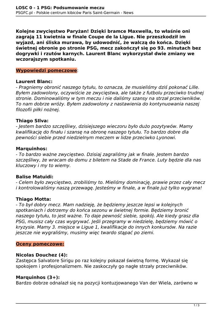 LOSC 0 - 1 PSG: Podsumowanie meczu PSGFC.pl - Polskie centrum kibiców Paris Saint-Germain - News Kolejne zwycięstwo Paryżan! Dzięki bramce Maxwella, to właśnie oni zagrają 11 kwietnia w finale Coupe de la Ligue. Nie przeszkodził im wyjazd, ani śliska murawa, by udowodnić, że walczą do końca. Dzięki świetnej obronie po stronie PSG, mecz zakończył się po 93. minutach bez dogrywki i rzutów karnych. Laurent Blanc wykorzystał dwie zmiany we wczorajszym spotkaniu. Wypowiedzi pomeczowe: Laurent Blanc: - Pragniemy obronić naszego tytułu, to oznacza, że musieliśmy dziś pokonać Lille. Byłem zadowolony, oczywiście ze zwycięstwa, ale także z futbolu przeciwko trudnej stronie. Dominowaliśmy w tym meczu i nie daliśmy szansy na strzał przeciwników. To nam dobrze wróży. Byłem zadowolony z nastawienia do kontynuowania naszej filozofii piłki nożnej. Thiago SIlva: - Jestem bardzo szczęśliwy, dzisiejszego wieczoru było dużo pozytywów. Mamy kwalifikację do finału i szansę na obronę naszego tytułu. To bardzo dobre dla pewności siebie przed niedzielnym meczem w lidze przeciwko Lyonowi. Marquinhos: - To bardzo ważne zwycięstwo. Dzisiaj zagraliśmy jak w finale. Jestem bardzo szczęśliwy, że wracam do domu z biletem na Stade de France. Luty będzie dla nas kluczowy i my to wiemy. Balise Matuidi: - Celem było zwycięstwo, zrobiliśmy to. Mieliśmy dominację, prawie przez cały mecz i kontrolowaliśmy naszą przewagę. Jesteśmy w finale, a w finale już tylko wygrana! Thiago Motta: - To był dobry mecz. Mam nadzieję, że będziemy jeszcze lepsi w kolejnych spotkaniach i dotrzemy do końca sezonu w świetnej formie. Będziemy bronić naszego tytułu, to jest ważne. To daje pewność siebie, spokój. Ale kiedy grasz dla PSG, musisz cały czas wygrywać. Jeśli przegramy w niedzielę, będziemy mówić o kryzysie. Mamy 3. miejsce w Ligue 1, kwalifikacje do innych konkursów. Na razie jeszcze nie wygraliśmy, musimy więc twardo stąpać po ziemi. Oceny pomeczowe: Nicolas Douchez (4): Zastępca Salvatore Sirigu po raz kolejny pokazał świetną formę. Wykazał się spokojem i profesjonalizmem. Nie zaskoczyły go nagłe strzały przeciwników. Marquinhos (3+): Bardzo dobrze odnalazł się na pozycji kontuzjowanego Van der Wiela, zarówno w 1/3 LOSC 0 - 1 PSG: Podsumowanie meczu PSGFC.pl - Polskie centrum kibiców Paris Saint-Germain - News ofensywie jak i defensywie miał swój wkład. Bardziej starał się jednak w pierwszej połowie, po przerwie notował straty oraz kilka nieudanych podań pod rząd. Thiago Silva (4+): Bardzo solidny w obronie, nie popełniał błędów, gdy była potrzeba defensywy. Bronił bramki swojej drużyny, jak na kapitana przystało. Kilka razy zagrał jako pomocnik. David Luiz (4+) Man of the Match: To on był gwiazdą wczorajszej obrony. Uratował drużynę przed kilkoma bramkami. Szczególnie dobrze grał głową. W 50. minucie zdobył żółtą kartkę, była to jednak przymusowa interwencja po nieudanym odbiorze Maxwella. Przyznałam mu tytuł gracza meczu, ponieważ miał spory wkład w defensywę. Na swój typ możecie zagłosować tutaj. Maxwell (4): To on wykorzystał podanie Cavaniego do Ibrahimovicia. Jego mocny, pewny strzał skierował piłkę do bramki z lewej pozycji. Brazylijczyk był również świetny w defensywie, dobrze współpracował ze Zlatanem. Minusem było kilka nieudanych odbiorów. Marco Verratti (3+): Jego akcje zakańczały się faulem - albo faulował, albo to on był faulowany. Napięta atmosfera między nim, a graczem Lille - Florentem Balmont, zakończyła się dla nich żółtymi kartkami (45. minuta). Poza tym był to udany mecz dla Verrattiego. W 59. minucie zastąpiony przez Yohana Cabaye. Thiago Motta (4-): Dobra gra Włocha, choć w defensywie dosyć agresywna. Nie pozwolił na odbiór piłki, starał się pomóc drużynie, a jego powrót do formy ma się coraz lepiej. Blaise Matuidi (3+): Świetny okazał się w obronie już w pierwszych minutach meczu. Był to dla niego udany mecz, robił wszystko, by przyczynić się do kwalifikacji. Lucas Moura (4-): Widoczna poprawa Brazylijczyka. Zabrakło jedynie zdecydowania. Podczas meczu dał kibicom pokaz w postaci dryblingów i swojej szybkości. W 34. minucie sędzia pokazał mu żółtą kartkę za próbę odbioru piłki. W pierwszej połowie bardzo widoczny, w drugiej był mniej aktywny, dlatego został zastąpiony przez Lavezziego w 76. minucie. Zlatan Ibrahimović (4-): Jego podania dawały szanse na gole. Wczoraj był bardziej pomocnikiem, niż napastnikiem i poradził sobie naprawdę dobrze. Nie można mówić o złym występie Szweda, to on kierował grą w ataku. 2/3 LOSC 0 - 1 PSG: Podsumowanie meczu PSGFC.pl - Polskie centrum kibiców Paris Saint-Germain - News Edinson Cavani (3+): Już w 3. minucie Urugwajczyk podjął próbę strzału, który okazał się niecelny. W 27. minucie w strzeleniu bramki przeszkodziła mu śliska murawa, podał do "Ibry", lecz piłka kierowała się do Maxwella - w ten sposób Edinson notuje asystę. Na początku drugiej połowy miał kolejną okazję, nie zdążył jednak dobiec do piłki po podaniu Zlatana. W 58. minucie znajduje się na pozycji spalonej. Podsumowując, był bardzo aktywny i chętny na gola, zabrakło mu tylko szczęścia. Zawodnicy rezerwowi: Yohan Cabaye (3): W 59. minucie zastępuje Verrattiego. Był niestety prawie niewidoczny. Ezequiel Lavezzi (3): W drugiej połowie piłka znajdowała się na połowie Paryżan, dlatego Argentyńczyk starał się przenieść akcje pod pole karne przeciwników. Kończyło się to stratą, lecz nie była to jego wina. Miał zbyt mało czasu, by cokolwiek zmienić, ponieważ na murawę wbiegł w 76. minucie za Lucasa. Ocena końcowa dla całej drużyny (4): Jeśli PSG grałoby cały mecz tak jak w pierwszej połowie, byłaby szansa na bardziej efektowne zwycięstwo, lecz po przerwie to Lille podjęło próbę pressingu. Obrona z Paryża zagrała jednak 