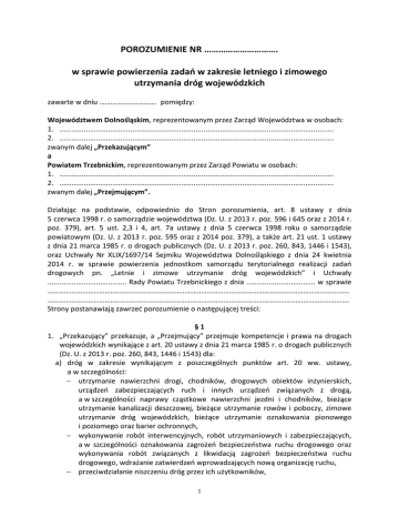 POROZUMIENIE NR …………………………. w sprawie powierzenia zadań w zakresie letniego i zimowego utrzymania dróg wojewódzkich zawarte w dniu …………………………. pomiędzy: Województwem Dolnośląskim, reprezentowanym przez Zarząd Województwa w osobach: 1. ....................................................................................................................................... 2. ....................................................................................................................................... zwanym dalej „Przekazującym” a Powiatem Trzebnickim, reprezentowanym przez Zarząd Powiatu w osobach: 1. ....................................................................................................................................... 2. ....................................................................................................................................... zwanym dalej „Przejmującym”. Działając na podstawie, odpowiednio do Stron porozumienia, art. 8 ustawy z dnia 5 czerwca 1998 r. o samorządzie województwa (Dz. U. z 2013 r. poz. 596 i 645 oraz z 2014 r. poz. 379), art. 5 ust. 2,3 i 4, art. 7a ustawy z dnia 5 czerwca 1998 roku o samorządzie powiatowym (Dz. U. z 2013 r. poz. 595 oraz z 2014 poz. 379), a także art. 21 ust. 1 ustawy z dnia 21 marca 1985 r. o drogach publicznych (Dz. U. z 2013 r. poz. 260, 843, 1446 i 1543), oraz Uchwały Nr XLIX/1697/14 Sejmiku Województwa Dolnośląskiego z dnia 24 kwietnia 2014 r. w sprawie powierzenia jednostkom samorządu terytorialnego realizacji zadań drogowych pn. „Letnie i zimowe utrzymanie dróg wojewódzkich” i Uchwały ....................................... Rady Powiatu Trzebnickiego z dnia .................................. w sprawie …………………………………………………………………………………………………………….………………………………… ………………………………………………………………………………………………………………………………………………. Strony postanawiają zawrzeć porozumienie o następującej treści: §1 1. „Przekazujący” przekazuje, a „Przejmujący” przejmuje kompetencje i prawa na drogach wojewódzkich wynikające z art. 20 ustawy z dnia 21 marca 1985 r. o drogach publicznych (Dz. U. z 2013 r. poz. 260, 843, 1446 i 1543) dla: a) dróg w zakresie wynikającym z poszczególnych punktów art. 20 ww. ustawy, a w szczególności: − utrzymanie nawierzchni drogi, chodników, drogowych obiektów inżynierskich, urządzeń zabezpieczających ruch i innych urządzeń związanych z drogą, a w szczególności naprawy cząstkowe nawierzchni jezdni i chodników, bieżące utrzymanie kanalizacji deszczowej, bieżące utrzymanie rowów i poboczy, zimowe utrzymanie dróg wojewódzkich, bieżące utrzymanie oznakowania pionowego i poziomego oraz barier ochronnych, − wykonywanie robót interwencyjnych, robót utrzymaniowych i zabezpieczających, a w szczególności oznakowania zagrożeń bezpieczeństwa ruchu drogowego oraz wykonywania robót związanych z likwidacją zagrożeń bezpieczeństwa ruchu drogowego, wdrażanie zatwierdzeń wprowadzających nową organizację ruchu, − przeciwdziałanie niszczeniu dróg przez ich użytkowników, 1 − sadzenie, utrzymanie oraz usuwanie drzew i krzewów oraz pielęgnacja zieleni w pasie drogowym, a w szczególności koszenie traw i chwastów oraz wycinka krzaków z pasa drogowego. b) drogowych obiektów inżynierskich w zakresie: − utrzymania przepustów o średnicy do ø 60 cm, a w szczególności udrażnianie i odmulanie przepustów 2. Zadania związane z bieżącym utrzymaniem dróg wojewódzkich mające wpływ na bezpieczeństwo uczestników ruchu drogowego zostaną wykonane przez „Przejmującego” bez zbędnej zwłoki, a pozostałe w terminie do 5 dni. 3. Dotacja celowa roczna zostanie przeznaczona na roboty związane z bieżącym utrzymaniem dróg wojewódzkich w wysokości: - co najmniej 5% dotacji na odnowę oznakowania poziomego, - co najmniej 7% dotacji na koszenie poboczy i wycinkę krzaków z pasa drogowego, - co najmniej 10% dotacji na ustawianie, poprawianie oraz mycie znaków, słupków prowadzących oraz elementów bezpieczeństwa ruchu drogowego. 4. Pozostały udział dotacji zostanie przeznaczony na inne roboty związane z letnim i zimowym utrzymaniem dróg wojewódzkich. Minimalny zakres robót związanych z odnową oznakowania, koszeniem oraz ustawianiem, poprawianiem i myciem znaków może zostać zmniejszony lub zwiększony przez Inspektora DSDiK odpowiedzialnego za realizację porozumienia. 5. Zadania przekazane „Przejmującemu” realizuje Zarząd Dróg Powiatowych w Trzebnicy, który będzie równocześnie upoważniony przez „Przejmującego” do wykonywania niniejszego porozumienia. 6. Utrzymaniem konstrukcji drogowych obiektów inżynierskich na całej sieci dróg wojewódzkich zajmuje się Dolnośląska Służba Dróg i Kolei we Wrocławiu. 7. W uzasadnionych przypadkach - na wniosek Zarządu Dróg Powiatowych w Trzebnicy skierowany do Dolnośląskiej Służby Dróg i Kolei we Wrocławiu - Dolnośląska Służba Dróg i Kolei może wyrazić zgodę na realizację w ramach środków z dotacji celowej zadania o charakterze remontowym, pod warunkiem, że nie wpłynie to na jakość prowadzenia robót utrzymaniowych. 8. Drogi wojewódzkie są ubezpieczane od odpowiedzialności cywilnej zarządcy drogi przez Dolnośląską Służbę Dróg i Kolei we Wrocławiu. 9. „Przejmujący” ma obowiązek współdziałania w zakresie postępowania dotyczącego ustalenia odpowiedzialności zarządcy drogi. 10. Wykaz dróg wojewódzkich położonych w granicach administracyjnych Powiatu Trzebnickiego i odcinków dróg wojewódzkich przebiegających poza powiatem w zakresie letniego i zimowego utrzymania przez „Przejmującego” określony jest w załączniku nr 1 do nin