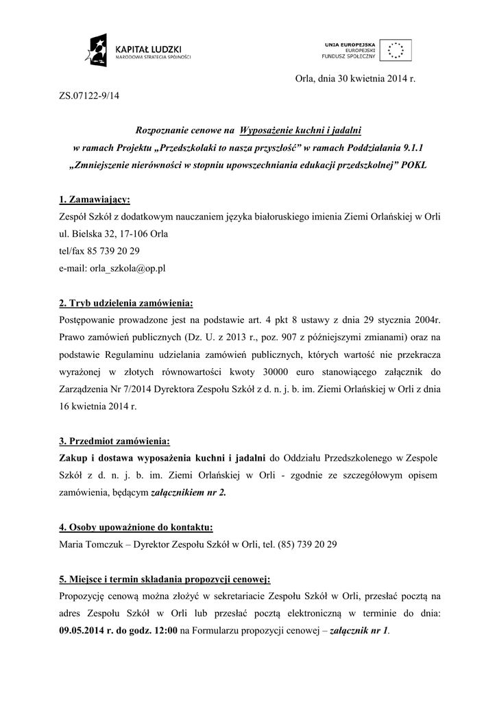 Orla, dnia 30 kwietnia 2014 r. ZS.07122-9/14 Rozpoznanie cenowe na Wyposażenie kuchni i jadalni w ramach Projektu „Przedszkolaki to nasza przyszłość” w ramach Poddziałania 9.1.1 „Zmniejszenie nierówności w stopniu upowszechniania edukacji przedszkolnej” POKL 1. Zamawiający: Zespół Szkół z dodatkowym nauczaniem języka białoruskiego imienia Ziemi Orlańskiej w Orli ul. Bielska 32, 17-106 Orla tel/fax 85 739 20 29 e-mail: [email protected] 2. Tryb udzielenia zamówienia: Postępowanie prowadzone jest na podstawie art. 4 pkt 8 ustawy z dnia 29 stycznia 2004r. Prawo zamówień publicznych (Dz. U. z 2013 r., poz. 907 z późniejszymi zmianami) oraz na podstawie Regulaminu udzielania zamówień publicznych, których wartość nie przekracza wyrażonej w złotych równowartości kwoty 30000 euro stanowiącego załącznik do Zarządzenia Nr 7/2014 Dyrektora Zespołu Szkół z d. n. j. b. im. Ziemi Orlańskiej w Orli z dnia 16 kwietnia 2014 r. 3. Przedmiot zamówienia: Zakup i dostawa wyposażenia kuchni i jadalni do Oddziału Przedszkolenego w Zespole Szkół z d. n. j. b. im. Ziemi Orlańskiej w Orli - zgodnie ze szczegółowym opisem zamówienia, będącym załącznikiem nr 2. 4. Osoby upoważnione do kontaktu: Maria Tomczuk – Dyrektor Zespołu Szkół w Orli, tel. (85) 739 20 29 5. Miejsce i termin składania propozycji cenowej: Propozycję cenową można złożyć w sekretariacie Zespołu Szkół w Orli, przesłać pocztą na adres Zespołu Szkół w Orli lub przesłać pocztą elektroniczną w terminie do dnia: 09.05.2014 r. do godz. 12:00 na Formularzu propozycji cenowej – załącznik nr 1. 6. Termin wykonania zamówienia: Przedmiot zamówienia Wykonawca ma dostarczyć do 11.07.2014 r. 7. Opis sposobu obliczenia ceny propozycji cenowej: 1) Cena podana w propozycji cenowej winna obejmować wszystkie koszty i składniki związane z wykonaniem zamówienia oraz warunkami stawianymi przez Zamawiającego, w szczególności: należny podatek od towarów i usług. 2) Cena opisana w ust. 1 jest ceną ostateczną, jaką zapłaci Zamawiający. 8. Kryteria oceny propozycji cenowej: 1) Kryterium wyboru jest cena (cena – 100%). 2) Najkorzystniejszą propozycją cenową będzie propozycja z najniższą ceną, spełniająca wymagania Zamawiającego. 9. Unieważnienie postępowania: Zamawiający zastrzega sobie prawo do unieważnienia niniejszego postępowania. Załączniki: 1. Załącznik Nr 1 – Formularz propozycji cenowej. 2. Załącznik Nr 2 – Szczegółowy opis zamówienia. Załącznik Nr 1 FORMULARZ PROPOZYCJI CENOWEJ NA WYPOSAŻENIE KUCHNI I JADALNI Dane dotyczące Wykonawcy Nazwa: ............................................................................................................................. Siedziba: ............................................................................................................................... Numer telefonu/faxu: …………….................................. E-mail: ………………………………………………… Numer REGON: ..................................................... Numer NIP: ………………………………… Zobowiązania Wykonawcy W odpowiedzi na rozpoznanie cenowe oferuję wykonanie przedmiotu zamówienia za cenę: Cena netto …………..……….zł. (słownie: ……………………………………………………………………………..………. ) Podatek VAT ( …….. %) …………….…….zł Cena brutto ………………….zł. (słownie: …………………………………………………………….………………………) Oświadczam, że: Wykonam zamówienie w terminie do dnia:……………………………… Zapoznałem się z warunkami przedmiotu zamówienia i nie wnoszę do nich żadnych zastrzeżeń. Załączniki: - Szczegółowy opis zamówienia. ___________________________ Czytelny podpis ( pieczątka) Załącznik Nr 2 Wyposażenie kuchni i jadalni ID Nazwa 13 Lodówka 14 Zmywarka uniwersalna z funkcją wyparzania Zestaw naczyń dla dzieci Termos stalowy z pompką Sztućce dla dzieci Obieraczka do ziemniaków. 15 16 17 18 19 Szafa przelotowa Szczegółowy opis zamówienia Szafa mroźnicza 350 l., wnętrze z abs, stal nierdzewna. Parametry: Napięcie - U: 230 V, Zasilanie: prąd, Pojemność V: 350 l, Moc elektryczna: 0,11 kW, Temperatura min.: -25 °C, Karta gwarancyjna: tak, Temperatura max.: -10 °C, Linia chłodnictwa: ECO. W komplecie 4 półki, nośność półek do 8 kg, obudowa urządzenia wykonana ze stali nierdzewnej, szafa mroźnicza wyposażona w półki mrożące, pojemność brutto 350 litrów cichy agregat, elektroniczny wyświetlacz temperatury, możliwość regulacji temperatury wbudowany zamek na klucz. Zmywarka gastronomiczna wykonana ze stali nierdzewnej. napięcie 400V, wym. 56,5 x 62,5 x 82,5 cm Funkcja automatycznego wyparzania po zakończonym procesie mycia. W wyposażeniu kosz to talerzy, kosz uniwersalny i kosz na sztućce. Ilość Cena jedn. brutto 1 szt 1 szt. Zestaw zawiera 18 szt., w tym: kubek 0,25 l - 6 szt., talerz płytki 195 - 6 szt., salaterka 120 - 6 szt. Szkło hartowane. 9 zestawów Termos stalowy z pompką wyposażony w wkład stalowy, pokrywa i uchwyt z polipropylenu, Pojemność: 5,0 l, Wysokość: 450 mm Zestaw zawiera 48 elementów.: łyżka 12 szt., widelec 12 szt., nóż 12 szt., łyżeczka 12 szt. inox 18/0 5 szt. Obieraczka do ziemniaków wykonana ze stali nierdzewnej, wyposażona w poliwęglanową pokrywę z wyłącznikiem bezpieczeństwa, czasomierz z regulacją do 5 minut. Wymiary: 390x770x940 mm. Moc: 0,37 kW. Zasilanie: 400 V. Wydajność: 60 kg / godz. Jednorazowy wsad: 6 kg 1 szt. Szafa przelotowa z drzwiami przesuwanymi. Wykonana w ze stali nierdzewnej. Atesty PZH. Drzwi suwane, podwójne. 3 półki na naczynia. Długość 1200 mm, Głębokość 600 mm, wysokość 1800 mm. 2 szt. 5 zestawów. RAZEM Wartość brutto