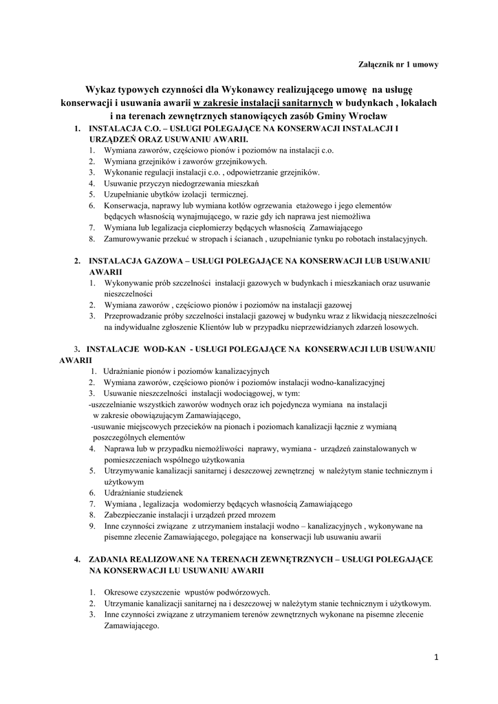 Załącznik nr 1 umowy Wykaz typowych czynności dla Wykonawcy realizującego umowę na usługę konserwacji i usuwania awarii w zakresie instalacji sanitarnych w budynkach , lokalach i na terenach zewnętrznych stanowiących zasób Gminy Wrocław 1. INSTALACJA C.O. – USŁUGI POLEGAJĄCE NA KONSERWACJI INSTALACJI I URZĄDZEŃ ORAZ USUWANIU AWARII. 1. Wymiana zaworów, częściowo pionów i poziomów na instalacji c.o. 2. Wymiana grzejników i zaworów grzejnikowych. 3. Wykonanie regulacji instalacji c.o. , odpowietrzanie grzejników. 4. Usuwanie przyczyn niedogrzewania mieszkań 5. Uzupełnianie ubytków izolacji termicznej. 6. Konserwacja, naprawy lub wymiana kotłów ogrzewania etażowego i jego elementów będących własnością wynajmującego, w razie gdy ich naprawa jest niemożliwa 7. Wymiana lub legalizacja ciepłomierzy będących własnością Zamawiającego 8. Zamurowywanie przekuć w stropach i ścianach , uzupełnianie tynku po robotach instalacyjnych. 2. INSTALACJA GAZOWA – USŁUGI POLEGAJĄCE NA KONSERWACJI LUB USUWANIU AWARII 1. Wykonywanie prób szczelności instalacji gazowych w budynkach i mieszkaniach oraz usuwanie nieszczelności 2. Wymiana zaworów , częściowo pionów i poziomów na instalacji gazowej 3. Przeprowadzanie próby szczelności instalacji gazowej w budynku wraz z likwidacją nieszczelności na indywidualne zgłoszenie Klientów lub w przypadku nieprzewidzianych zdarzeń losowych. 3. INSTALACJE WOD-KAN - USŁUGI POLEGAJĄCE NA KONSERWACJI LUB USUWANIU AWARII 1. Udrażnianie pionów i poziomów kanalizacyjnych 2. Wymiana zaworów, częściowo pionów i poziomów instalacji wodno-kanalizacyjnej 3. Usuwanie nieszczelności instalacji wodociągowej, w tym: -uszczelnianie wszystkich zaworów wodnych oraz ich pojedyncza wymiana na instalacji w zakresie obowiązującym Zamawiającego, -usuwanie miejscowych przecieków na pionach i poziomach kanalizacji łącznie z wymianą poszczególnych elementów 4. Naprawa lub w przypadku niemożliwości naprawy, wymiana - urządzeń zainstalowanych w pomieszczeniach wspólnego użytkowania 5. Utrzymywanie kanalizacji sanitarnej i deszczowej zewnętrznej w należytym stanie technicznym i użytkowym 6. Udrażnianie studzienek 7. Wymiana , legalizacja wodomierzy będących własnością Zamawiającego 8. Zabezpieczanie instalacji i urządzeń przed mrozem 9. Inne czynności związane z utrzymaniem instalacji wodno – kanalizacyjnych , wykonywane na pisemne zlecenie Zamawiającego, polegające na konserwacji lub usuwaniu awarii 4. ZADANIA REALIZOWANE NA TERENACH ZEWNĘTRZNYCH – USŁUGI POLEGAJĄCE NA KONSERWACJI LU USUWANIU AWARII 1. 2. 3. Okresowe czyszczenie wpustów podwórzowych. Utrzymanie kanalizacji sanitarnej na i deszczowej w należytym stanie technicznym i użytkowym. Inne czynności związane z utrzymaniem terenów zewnętrznych wykonane na pisemne zlecenie Zamawiającego. 1