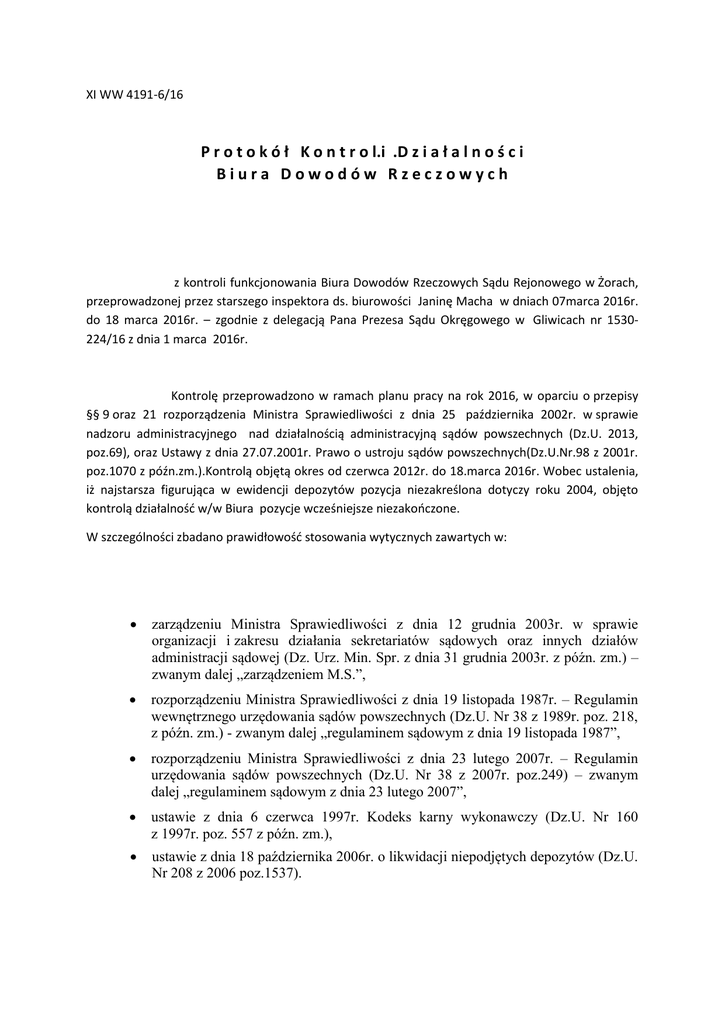 XI WW 4191-6/16 P r o t o k ó ł K o n t r o l.i .D z i a ł a l n o ś c i Biura Dowodów Rzeczowych z kontroli funkcjonowania Biura Dowodów Rzeczowych Sądu Rejonowego w Żorach, przeprowadzonej przez starszego inspektora ds. biurowości Janinę Macha w dniach 07marca 2016r. do 18 marca 2016r. – zgodnie z delegacją Pana Prezesa Sądu Okręgowego w Gliwicach nr 1530224/16 z dnia 1 marca 2016r. Kontrolę przeprowadzono w ramach planu pracy na rok 2016, w oparciu o przepisy §§ 9 oraz 21 rozporządzenia Ministra Sprawiedliwości z dnia 25 października 2002r. w sprawie nadzoru administracyjnego nad działalnością administracyjną sądów powszechnych (Dz.U. 2013, poz.69), oraz Ustawy z dnia 27.07.2001r. Prawo o ustroju sądów powszechnych(Dz.U.Nr.98 z 2001r. poz.1070 z późn.zm.).Kontrolą objętą okres od czerwca 2012r. do 18.marca 2016r. Wobec ustalenia, iż najstarsza figurująca w ewidencji depozytów pozycja niezakreślona dotyczy roku 2004, objęto kontrolą działalność w/w Biura pozycje wcześniejsze niezakończone. W szczególności zbadano prawidłowość stosowania wytycznych zawartych w: zarządzeniu Ministra Sprawiedliwości z dnia 12 grudnia 2003r. w sprawie organizacji i zakresu działania sekretariatów sądowych oraz innych działów administracji sądowej (Dz. Urz. Min. Spr. z dnia 31 grudnia 2003r. z późn. zm.) – zwanym dalej „zarządzeniem M.S.”, rozporządzeniu Ministra Sprawiedliwości z dnia 19 listopada 1987r. – Regulamin wewnętrznego urzędowania sądów powszechnych (Dz.U. Nr 38 z 1989r. poz. 218, z późn. zm.) - zwanym dalej „regulaminem sądowym z dnia 19 listopada 1987”, rozporządzeniu Ministra Sprawiedliwości z dnia 23 lutego 2007r. – Regulamin urzędowania sądów powszechnych (Dz.U. Nr 38 z 2007r. poz.249) – zwanym dalej „regulaminem sądowym z dnia 23 lutego 2007”, ustawie z dnia 6 czerwca 1997r. Kodeks karny wykonawczy (Dz.U. Nr 160 z 1997r. poz. 557 z późn. zm.), ustawie z dnia 18 października 2006r. o likwidacji niepodjętych depozytów (Dz.U. Nr 208 z 2006 poz.1537). 4. Podsumowanie wyników kontroli Przeprowadzona kontrola wykazała, iż osoba której powierzono prowadzenie Biura Dowodów Rzeczowych Sądu Rejonowego w Żorach – a to pracownik Oddziału Administracyjnego, wykonuje powierzone jej w tym zakresie czynności , starając się całość zadań wykonywać starannie, dokładnie i terminowo. Na pochwałę niewątpliwie zasługuje sposób prowadzenia samego magazynu dowodów, gdzie wszystkie złożone do poszczególnych spraw dowody rzeczowe są bardzo starannie ułożone, należycie opisane. Również w należytym porządku prowadzona jest sporządzana przez pracownika Oddziału Administracyjnego dokumentacja dotycząca czynności związanych z dowodami rzeczowymi, przechowywana w Oddziale Administracyjnym. Niewątpliwie na bardzo wielkie uznanie zasługuje zaangażowanie Kierownika Oddziału Administracyjnego w czasie nieobecności pracownika zajmującego się dowodami rzeczowymi. Który podczas nieobecności w/w pracownika , podejmował wszelkie działania niezbędne do zapewnienia jak najlepszego funkcjonowania biura dowodów rzeczowych, mimo bardzo wielkiego obciążenia obowiązkami. Nie mniej, w zakresie postępowania z dowodami rzeczowymi w kontrolowanej jednostce stwierdzono pewne uchybienia i niedokładności. Szczegółowo zostały one opisane w niniejszym sprawozdaniu i niewątpliwie należy podjąć kroki zmierzające do ich wyeliminowania. Nie wszystkie czynności, które mają związek z dowodami rzeczowymi, są możliwe do wykonania przez pracownika Oddziału Administracyjnego – nie ma on wpływu na sposób i terminowość wykonywania czynności należących do zadań sądu, sekretariatów wydziałów merytorycznych jak i sekcji wykonawczej, brak możliwości wglądu do systemu informatycznego w poszczególnych sprawach w wydziałach merytorycznych jak i sekcji wykonawczej. A dopiero w sytuacji, gdy wszystkie osoby mające jakikolwiek wpływ na postępowanie z dowodami rzeczowymi, będą czynności w tym zakresie wykonywać rzetelnie i terminowo, możliwym będzie uzyskanie wymiernej poprawy na tym odcinku. W celu wyeliminowania stwierdzonych nieprawidłowości i niedokładności oraz usprawnienia postępowania z dowodami rzeczowymi należy: wyegzekwować od Kierowników Sekretariatów wywiązywanie się z obowiązku nałożonego przepisem § 9 ust.1 pkt 8 zarządzenia M.S., z którego wynika jednoznacznie, iż do ich obowiązków należy: „… niezwłoczne przedstawianie akt dla wydania dodatkowego orzeczenia, jeżeli w wydanym orzeczeniu brak jest rozstrzygnięcia co do dowodów rzeczowych …” wyegzekwować od Kierowników Sekretariatu traktowanie pism i zapytań kierowanych do Wydziału przez osobę prowadzącą Biuro Dowodów Rzeczowych na ogólnych zasadach, tzn. opatrywanie pism tych adnotacją o dacie wpływu i bezzwłoczne ich przedstawianie Przewodniczącemu Wydziału wraz z aktami, o ile załatwienie pism wykracza poza zakres samodzielnego działania kierownika sekretariatu (§ 9 ust. 1 pkt 1 zarządzenia M.S., § 16 ust. 1 zarządzenia M.S.), na pisemne zapytanie odnośnie stanu sprawy, winna być każdorazowo udzielona również pisemna odpowiedź; po uprawomocnieniu się orzeczenie dotyczącego złożonych przedmiotów, dalsze przewidziane w konkretnej sprawie czynności podejmować bezzwłocznie – obowiązek ten wynika zarówno z treści art. 9 § 1 kkw: „Postępowanie wykonawcze wszczyna się bezzwłocznie, gdy orzeczenie stało się wykonalne” jak i z treści § 357 ust. 1 regulaminu sądowego z dnia 23 lutego 2007r.:obowiązujących do 31.12.2015r. a od dnia 01.01.2016r., § 369 ust 1 „Każde orzeczenie, które staje się wykonalne z chwilą uprawomocnienia, kieruje się do wykonania bezzwłocznie, nie później niż 14 dni od daty uprawomocnienia lub od daty zwrotu akt sądowi pierwszej instancji. (…)”; po wykonaniu ostatniej przewidzianej dla danego