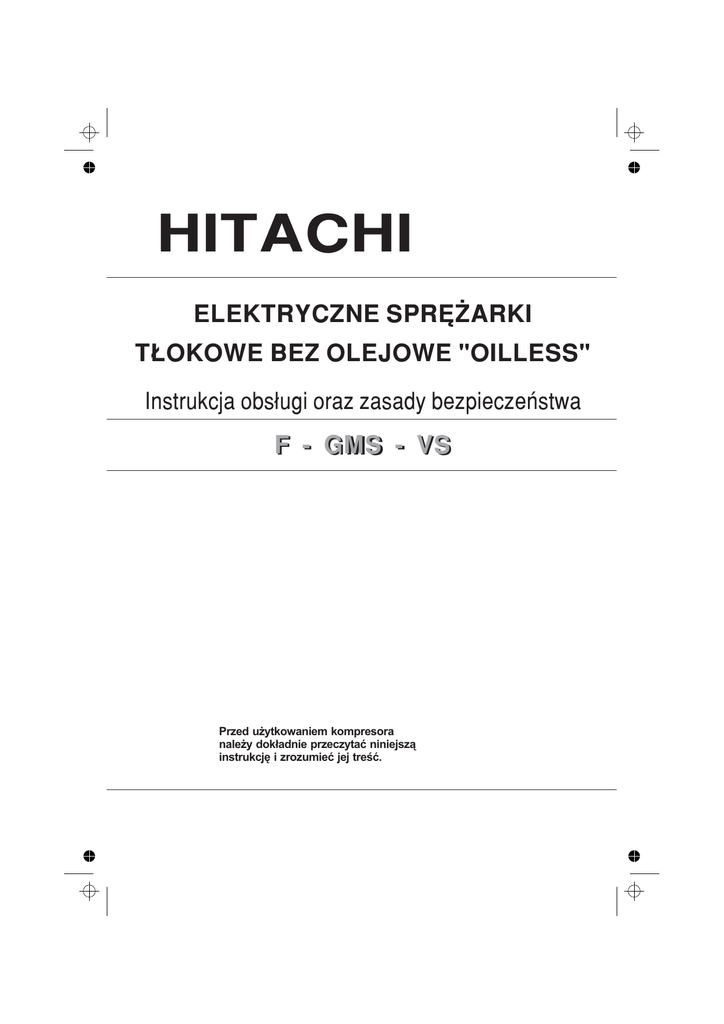 HITACHI ELEKTRYCZNE SPRĘŻARKI TŁOKOWE BEZ OLEJOWE "OILLESS" Instrukcja obsługi oraz zasady bezpieczeństwa F - GMS - VS Przed użytkowaniem kompresora należy dokładnie przeczytać niniejszą instrukcję i zrozumieć jej treść. PRZECZYTAĆ INSTRUKCJĘ OBSŁUGI Przed ustawieniem, uruchomieniem lub czynnościami serwisowymi, należy dokładnie zaznajomić się z instrukcją obsługi NIEBEZPIECZEŃSTWO PORAŻENIA PRĄDEM ELEKTRYCZNYM Uwaga przed przystąpieniem do wykonywania przeglądów, konserwacji, czyszczenia, wymiany lub kontroli w sprężarce konieczne jest odłączenie zasilania elektrycznego od urządzenia. NIEBEZPIECZEŃSTWO WYSOKICH TEMPERATUR Uwaga: niektóre części znajdujące się w sprężarce mogą osiągać wysokie temperatury. NIEBEZPIECZEŃSTWO PRZYPADKOWEGO WŁĄCZENIA Uwaga: sprężarka może włączyć się w przypadku zaciemnienia (black-out), w następstwie przywrócenia zasilania. 1 2A 2 2B 3 4A 5 7 8 4 6 9 9 10 11 12 13 14 15 16 16A 18 13 19 17 20 23 22 24 21 25 26 Model FX 1 2 3 4 5 6 7 8 9 10 Zbiornik Osuszacz Kó ka Os ona Filtr powietrza W cznik ci nienia Reduktor ci nienia Wylot spr onego powietrza Manometr Uchwyt Model F1 1 2 3 Os ona Filtr powietrza Reduktor ci nienia Model ECU 1 2 3 4 5 6 Zbiornik Osuszacz Os ona Zawór bezpiecze stwa Filtr powietrza W cznik ci nienia Model F 1 2 3 Os ona Filtr powietrza Reduktor ci nienia Model S-MAGNUM VS 1 2 3 4 5 6 7 Zbiornik Osuszacz Kó ka Filtr powietrza Uchwyt Os ona Zawór zwrotny Model AIRCLIK 1 2 3 4 5 6 7 8 9 Zbiornik Osuszacz Wylot spr onego powietrza Reduktor ci nienia Uchwyt W cznik ci nienia Os ona Kó ka Manometr WAŻNE INFORMACJE Zapoznaj się dokładnie ze wszystkimi instrukcjami dotyczącymi działania urządzenia, wskazówkami odnośnie bezpieczeństwa oraz ostrzeżeniami zawartymi w niniejszej instrukcji obsługi. Większość wypadków przy pracy spowodowana jest nieprzestrzeganiem lub lekceważeniem podstawowych zasad bezpieczeństwa pracy. Wypadków można uniknąć przewidując ewentualne sytuacje, które mogą zagrozić życiu lub zdrowiu ponadto ściśle przestrzegając procedur bezpieczeństwa. Sprężarkę należy używać zgodnie z zaleceniami producenta. Procedury te wyszczególnione są w części "BEZPIECZEŃSTWO" w niniejszej instrukcji obsługi, jak również w części dotyczącej użytkowania i eksploatacji kompresora. Sytuacje, które ze względu na ryzyko zranienia lub uszkodzenia urządzenia są wskazane przez napis "OSTRZEŻENIE". Informacje te znajdują się zarówno na kompresorze jak i w niniejszej instrukcji obsługi. Nigdy nie używaj sprężarki w sposób inny niż zalecany przez HITACHI, chyba że jesteś absolutnie pewny że nie będzie to stwarzało niebezpieczeństwa tobie jak i innym osobom przebywającym w pobliżu pracującego kompresora. ZNACZENIA WAŻNYCH SŁÓW OSTRZEŻENIE: wskazuje sytuację potencjalnie niebezpieczną, która jeżeli będzie ignorowana, może spowodować śmierć lub ciężkie obrażenia. UWAGA: wskazuje sytuację potencjalnie niebezpieczną, której jeżeli nie jest w stanie się uniknąć może spowodować nieznaczne lub umiarkowane obrażenia ciała oraz uszkodzenia urządzenia. WAŻNE: wskazuje na istotne informacje. BEZPIECZEŃSTWO WAŻNE INFORMACJE DLA UŻYTKOWNIKÓW KOMPRESORA OSTRZEŻENIE Niewłaściwe użytkowanie oraz nieprawidłowa konserwacja kompresora może spowodować obrażenia lub śmierć. Aby tego uniknąć należy dokładnie przeczytać niniejszą instrukcję obsługi i zrozumieć jej treść. PRZECZYTAJ CAŁĄ INSTRUKCJĘ 1. 2. NIGDY NIE DOTYKA RUCHOMYCH CZ CI Nigdy nie wk ada r k i innych cz ci cia a w ruchome cz ci kompresora. Nigdy nie wk ada palców ani adnych przedmiotów do rodka os ony wirnika. NIE URUCHAMIA KOMPRESORA BEZ ZAINSTALOWANYCH OS ON LUB INNYCH NIEZB DNYCH ZABEZPIECZE Nigdy nie uruchamia kompresora, kiedy wszystkie os ony nie s zainstalowane. Nale y zwróci uwag aby by y one prawid owo zamontowane. W przypadku gdy prace konserwacyjno-serwisowe wymagaj usuni cia cz ci os on mo na je zdj , lecz pami ta nale y aby przed ponownym uruchomieniem urz dzenia by y na swoich miejscach. 3. NALE Y ZAK ADA OKULARY OCHRONNE Zawsze przed przyst pieniem do pracy z kompresorem zak adaj gogle ochronne. Pami taj aby nie kierowa spr onego powietrza z kompresora w adne cz ci swojego cia a. 4. ZABEZPIECZ SI PRZED PORA ENIEM PR DEM Zapobiegaj i unikaj kontaktu cz ci cia a z przedmiotami, które s uziemione; nale do nich rury, grzejniki, lodówki. Niniejsza spr arka musi zosta prawid owo pod czona do uziemienia. Nigdy nie u ywaj kompresora w obecno ci wody czy wilgoci. Nie pracowa spr ark w pomieszczeniach wilgotnych czy zalanych. Nie wystawia urz dzenia na deszcz. 5. ROZ CZ KOMPRESOR Przed przyst pieniem do jakichkolwiek prac konserwacyjno-serwisowych nale y ZAWSZE od czy urz dzenie od ród a pr du i opró ni zbiornik ze spr onym powietrzem. Dotyczy to równie czyszczenia kompresora. 6. UNIKAJ PRZYPADKOWYCH W CZE Nie przeno kompresora gdy jest pod czony do ród a pr du lub gdy zbiornik jest nape niony spr onym powietrzem. Przed pod czeniem urz dzenia do ród a pr du, upewnij si czy wy cznik jest w pozycji OFF "WY CZONY" 7. PRZECHOWUJ KOMPRESOR W ODPOWIEDNIM MIEJSCU Gdy spr arka nie jest u ywana, powinna by przechowywana w suchym i zamkni tym pomieszczeniu z dala od czynników atmosferycznych. Kompresor musi by przechowywany z dala od dzieci. 8. UTRZYMUJ MIEJSCE PRACY W NALE YTEJ CZYSTO CI Ba agan i nieporz dek w miejscu pracy zwi ksza ryzyko wyst pienia wypadków. Oczy miejsce pracy z niepotrzebnych przedmiotów, gruzu, sprz tu, itp. 9. TRZYMA Z DALA DZIECI Uwa aj, aby dzieci lub osoby postronne nie dotyka y kabla zasilaj cego kompresor. Osoby trzecie powinny znajdowa si w bezpiecznej odleg o ci od urz dzenia. 10. UBIERAJ SI PRAWID OWO Nie ubieraj lu nych rzeczy i nie no bi uterii podczas pracy, mog zosta one wci gni te przez ruchome cz ci kompresora. W razie konieczno ci za ó okrycie w osów. 11. NIE NISZCZ PRZEWODU Nie 