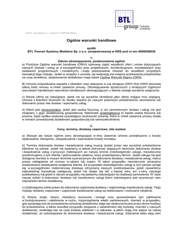 Ogólne warunki handlowe spółki BTL Poznań Systemy Medialne Sp. z o.o. zarejestrowanej w KRS pod nr-em 0000058636 1. Zakres obowiązywania, postanowienia ogólne a) Poniższe Ogólne warunki handlowe (OWH) stanowią część wszelkich ofert i umów dotyczących naszych dostaw i usług (a w szczególności prac projektowych, konstrukcyjnych, montażowych oraz zestawień programowych i medialnych) i mają zastosowanie również do wszelkich przyszłych transakcji tego rodzaju. Jeżeli w związku z umową i jej realizacją ma miejsce przekazanie przedmiotów na czas określony, zastosowanie dodatkowo mają nasze Ogólne Warunki Najmu (OWN. B) Umowa indywidualna zawarta z klientem oraz włączone w nią niniejsze OWH i/lub OWN stanowią pełną treść umowy w chwili zawarcia umowy. Obowiązywanie sprzecznych z niniejszymi Ogólnymi warunkami handlowymi warunków handlowych obowiązujących u klienta zostaje wyraźnie wyłączone. c) Nasze oferty są niewiążące, jeżeli nie są wyraźnie określone jako oferty mające moc wiążącą. Umowa z klientem dochodzi do skutku dopiero po naszym pisemnym potwierdzeniu zamówienia lub dokonaniu przez nas dostaw i wykonaniu usług. d) Klient jest konsumentem, jeżeli jest osobą fizyczną, a cel zamówionych dostaw i usług nie jest związany z jego działalnością gospodarczą. Natomiast przedsiębiorca to każda osoba fizyczna lub prawna, bądź spółka osobowa posiadająca osobowość prawną, która w chwili zawarcia umowy działa w ramach prowadzonej działalności gospodarczej lub samozatrudnienia. 2. Ceny, terminy, dostawy częściowe, siła wyższa a) Stosuje się nasze ogólne ceny obowiązujące w dniu zawarcia umowy powiększone o koszty opakowania, transportu, ubezpieczenia i ewentualne koszty montażu. b) Terminy dokonania dostaw i świadczenia usług muszą zostać przez nas wyraźnie potwierdzone klientowi na piśmie. Jeżeli nie będziemy w stanie dotrzymać wiążących terminów dokonania dostaw i świadczenia usług z przyczyn nieleżących po naszej stronie (niedostępność usługi), niezwłocznie poinformujemy o tym klienta i jednocześnie ustalimy nowy przewidywany termin. Jeżeli usługa nie jest dostępna również w nowym terminie wyznaczonym dla dokonania dostawy i świadczenia usługi, mamy prawo odstąpienia od umowy w całości lub części. W takim przypadku niezwłocznie zwracamy zrealizowane świadczenie wzajemne klienta. Za przypadek niedostępności usługi w tym sensie uznaje się w szczególności nieterminową dostawę otrzymaną naszych poddostawców, jeżeli zawarliśmy odpowiednią transakcję zastępczą, jeżeli nie dzieje się tak z naszej winy ani z winy naszego poddostawcy lub jeżeli w danym przypadku nie jesteśmy zobowiązani do realizacji zamówienia. W razie naszej zwłoki w dokonaniu dostawy lub świadczeniu usługi klient zobowiązany jest wyznaczyć nam odpowiedni termin dodatkowy. c) Zastrzegamy sobie prawo do dokonania częściowej dostawy i częściowego świadczenia usługi. Tego rodzaju dostawy częściowe i częściowe świadczenie usług są realizowane i rozliczane odrębnie. d) Wojna, strajk, lokaut, niedobory surowców i energii oraz spowodowane tym zakłócenia w funkcjonowaniu i zakłócenia w ruchu, rozporządzenia władz państwowych, również w przypadku, gdy sprawiają one że prowadzenie odnośnej działalności staje się nieekonomiczne przez okres możliwy do przewidzenia, a także wszelkie przypadki związane z zaistnieniem siły wyższej, również u naszych dostawców, zwalniają nas na czas trwania zakłóceń i w zakresie, w jakim mają one wpływ na naszą działalność, ze zobowiązania do dokonania dostawy i świadczenia usługi. Zdarzenia takie dają nam prawo do odstąpienia od umowy w całości lub w części, przy czym klient nie ma w takim przypadku prawa do odszkodowania. 3. Wysyłka, opakowanie, ponoszenie ryzyka, ubezpieczenie a) Towary dostarczane są wyłącznie w opakowaniach standardowych. Jeżeli dostawa dokonywana jest na żądanie przedsiębiorcy do miejsca innego, niż miejsce wykonania świadczenia, ryzyko przechodzi na firmę transportową z chwilą przekazania towarów lub na klienta w przypadku załadunku towaru na własne pojazdy klienta celem transportu do klienta. Dotyczy to również sytuacji, w której uzgodniono dostawę wolną od opłaty za przewóz lub transport naszymi środkami transportu. Trasa wysyłki i środki transportu są ustalane przez nas, chyba że uzgodniono inaczej. W razie zwłoki w wysyłce z przyczyn leżących po stronie klienta, ryzyko przechodzi na klienta z dniem przekazania informacji o gotowości do wysyłki. b) Klient zobowiązany jest zgłosić szkody wyrządzone podczas transportu bezpośrednio firmie transportowej niezwłocznie po ich wykryciu, w konkretnych terminach wyznaczonych dla tego typu zgłoszeń, a także poinformować nas o tym. Ograniczenie praw konsumenta w zakresie reklamacji wad nie ma związku z niniejszym postanowieniem. c) Umowy o ubezpieczenia transportowe i inne zawieramy jedynie na wyraźne życzenie klienta i wyłącznie na jego koszt. 4. Wystawianie faktur, płatności a) Z zastrzeżeniem innych ustaleń zawartych w umowie indywidualnej świadczenie wzajemne za dokonane przez nas dostawy i świadczone przez nas usługi jest należne niezwłocznie, a kwota wskazana na fakturze jest płatna bez możliwości jakichkolwiek potrąceń w terminie 30 dni od dnia dostawy lub odbioru. b) Nie jesteśmy zobowiązani do akceptowania czeków ani weksli. Czeki i weksle akceptowane są wyłącznie w celu spełnienia zobowiązania. c) Jeżeli klient zalega z płatnością, do której dokonania jest zobowiązany, mamy prawo, bez uszczerbku dla dochodzenia dalszego odszkodowania z tytułu szkody, w przypadku transakcji z konsumentami naliczyć odsetki z tytułu zwłoki w wysokości odsetek maksymalnych określonych w art. 359 § 2 1 kodeksu cywilnego. d) Kompensacja roszczeń wzajemnych jest wykluczona,