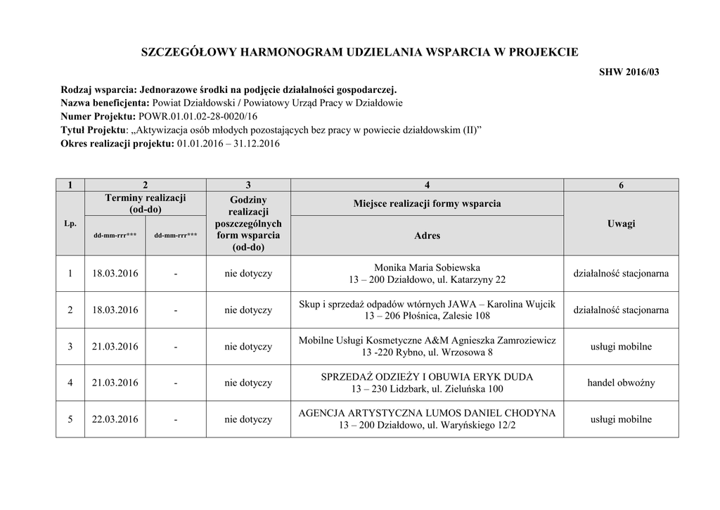 SZCZEGÓŁOWY HARMONOGRAM UDZIELANIA WSPARCIA W PROJEKCIE SHW 2016/03 Rodzaj wsparcia: Jednorazowe środki na podjęcie działalności gospodarczej. Nazwa beneficjenta: Powiat Działdowski / Powiatowy Urząd Pracy w Działdowie Numer Projektu: POWR.01.01.02-28-0020/16 Tytuł Projektu: „Aktywizacja osób młodych pozostających bez pracy w powiecie działdowskim (II)” Okres realizacji projektu: 01.01.2016 – 31.12.2016 1 2 Terminy realizacji (od-do) Lp. 3 Godziny realizacji poszczególnych form wsparcia (od-do) 4 6 Miejsce realizacji formy wsparcia Uwagi Adres dd-mm-rrr*** dd-mm-rrr*** 1 18.03.2016 - nie dotyczy Monika Maria Sobiewska 13 – 200 Działdowo, ul. Katarzyny 22 działalność stacjonarna 2 18.03.2016 - nie dotyczy Skup i sprzedaż odpadów wtórnych JAWA – Karolina Wujcik 13 – 206 Płośnica, Zalesie 108 działalność stacjonarna 3 21.03.2016 - nie dotyczy Mobilne Usługi Kosmetyczne A&M Agnieszka Zamroziewicz 13 -220 Rybno, ul. Wrzosowa 8 usługi mobilne 4 21.03.2016 - nie dotyczy SPRZEDAŻ ODZIEŻY I OBUWIA ERYK DUDA 13 – 230 Lidzbark, ul. Zieluńska 100 handel obwoźny 5 22.03.2016 - nie dotyczy AGENCJA ARTYSTYCZNA LUMOS DANIEL CHODYNA 13 – 200 Działdowo, ul. Waryńskiego 12/2 usługi mobilne 6 22.03.2016 - nie dotyczy WARM-FLEX Paweł Szewczak 13 – 230 Lidzbark, ul. Jeleńska 13/8 usługi mobilne działalność stacjonarna 7 23.03.2016 - nie dotyczy Firma Handlowo – Usługowa „RADRUK” Radosław Wasilewski 13 – 220 Rybno, ul. Wrzosowa 8 8 23.03.2016 - nie dotyczy Robert Koplin „ROKO” 13 – 200 Działdowo, ul. Dębowa 5/15 usługi mobilne 9 23.03.2016 - nie dotyczy Szafa smyka Ewelina Czerwińska 13 – 240 Iłowo – Osada, Mławka 45 sprzedaż przez Internet 10 24.03.2016 - nie dotyczy Usługi Remontowo-Budowlane Bartłomiej Grosz 13 – 220 Rybno, Żabiny 18 usługi budowlane 11 29.03.2016 - nie dotyczy 12 06.04.2016 - nie dotyczy 13 07.04.2016 - nie dotyczy Dawid Burchel Usługi Hydrauliczne A.D. Instal 13 – 230 Lidzbark, ul. Kraziewicza 8 usługi mobilne 14 07.04.2016 - nie dotyczy „Lejdiza-mobilne usługi kosmetyczne” IZABELA JANICKA 13 – 220 Rybno, Żabiny 167 usługi mobilne 15 11.04.2016 - nie dotyczy PD Rafał Roman 13 – 200 Działdowo, ul. Świerkowa 25/25 usługi mobilne 16 12.04.2016 - nie dotyczy Emilia Ogrodowczyk-Wiosna EmmySweetCakes – Pracownia Tortów Artystycznych 13 – 206 Płośnica, Gródki 78 działalność stacjonarna 17 12.04.2016 - nie dotyczy STYL-MEB DANIEL RUCIŃSKI 13 – 220 Rybno, Groszki 30 usługi mobilne MARCIN CZAJKOWSKI „BODY BALANCE” KOMPLEKSOWA REHABILITACJA 13 – 200 Działdowo, Filice 30a SKLEP INTERNETOWY „ZAKUPOHOLICZKA” Monika Milena Orzechowska 13 – 200 Działdowo, ul. Robotnicza 1 usługi mobilne sprzedaż przez Internet 18 14.04.2016 - nie dotyczy Regroup Rafał Bańka 13 – 230 Lidzbark, Kiełpiny 6 sprzedaż przez Internet 19 18.04.2016 - nie dotyczy PAZNOKCIE PERI Paulina Perczak 13 – 200 Działdowo, ul. Malewskiej 1/21 usługi mobilne 20 19.04.2016 - nie dotyczy StudioBRA Małgorzata Ludwiczak 13 – 200 Działdowo, ul. Wł. Jagiełły 26 działalność stacjonarna 21 27.04.2016 - nie dotyczy „4FUN” Paulina Rehmus 13 -230 Lidzbark, ul. Piaski 13 usługi mobilne 22 09.05.2016 - nie dotyczy „DARIZA” Daria Zawadzka 13 – 206 Płośnica, Gródki 113 sprzedaż przez Internet Data sporządzenia: 21.06.2016r. Sporządziła: Maria Cherkowska