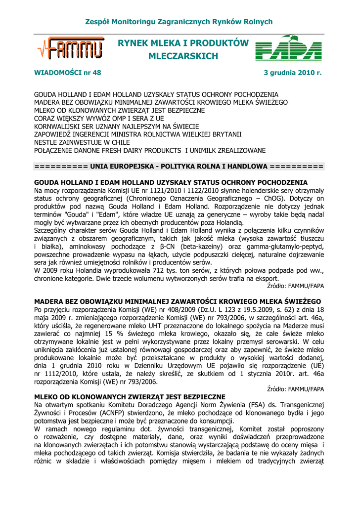 Zespół Monitoringu Zagranicznych Rynków Rolnych RYNEK MLEKA I PRODUKTÓW MLECZARSKICH WIADOMOŚCI nr 48 3 grudnia 2010 r. GOUDA HOLLAND I EDAM HOLLAND UZYSKAŁY STATUS OCHRONY POCHODZENIA MADERA BEZ OBOWIĄZKU MINIMALNEJ ZAWARTOŚCI KROWIEGO MLEKA ŚWIEśEGO MLEKO OD KLONOWANYCH ZWIERZĄT JEST BEZPIECZNE CORAZ WIĘKSZY WYWÓZ OMP I SERA Z UE KORNWALIJSKI SER UZNANY NAJLEPSZYM NA ŚWIECIE ZAPOWIEDŹ INGERENCJI MINISTRA ROLNICTWA WIELKIEJ BRYTANII NESTLE ZAINWESTUJE W CHILE POŁĄCZENIE DANONE FRESH DAIRY PRODUKCTS I UNIMILK ZREALIZOWANE ========== UNIA EUROPEJSKA - POLITYKA ROLNA I HANDLOWA ========== GOUDA HOLLAND I EDAM HOLLAND UZYSKAŁY STATUS OCHRONY POCHODZENIA Na mocy rozporządzenia Komisji UE nr 1121/2010 i 1122/2010 słynne holenderskie sery otrzymały status ochrony geograficznej (Chronionego Oznaczenia Geograficznego – ChOG). Dotyczy on produktów pod nazwą Gouda Holland i Edam Holland. Rozporządzenie nie dotyczy jednak terminów "Gouda" i "Edam", które władze UE uznają za generyczne – wyroby takie będą nadal mogły być wytwarzane przez ich obecnych producentów poza Holandią. Szczególny charakter serów Gouda Holland i Edam Holland wynika z połączenia kilku czynników związanych z obszarem geograficznym, takich jak jakość mleka (wysoka zawartość tłuszczu i białka), aminokwasy pochodzące z β-CN (beta-kazeiny) oraz gamma-glutamylo-peptyd, powszechne prowadzenie wypasu na łąkach, uŜycie podpuszczki cielęcej, naturalne dojrzewanie sera jak równieŜ umiejętności rolników i producentów serów. W 2009 roku Holandia wyprodukowała 712 tys. ton serów, z których połowa podpada pod ww., chronione kategorie. Dwie trzecie wolumenu wytworzonych serów trafia na eksport. Źródło: FAMMU/FAPA MADERA BEZ OBOWIĄZKU MINIMALNEJ ZAWARTOŚCI KROWIEGO MLEKA ŚWIEśEGO Po przyjęciu rozporządzenia Komisji (WE) nr 408/2009 (Dz.U. L 123 z 19.5.2009, s. 62) z dnia 18 maja 2009 r. zmieniającego rozporządzenie Komisji (WE) nr 793/2006, w szczególności art. 46a, który uściśla, Ŝe regenerowane mleko UHT przeznaczone do lokalnego spoŜycia na Maderze musi zawierać co najmniej 15 % świeŜego mleka krowiego, okazało się, Ŝe całe świeŜe mleko otrzymywane lokalnie jest w pełni wykorzystywane przez lokalny przemysł serowarski. W celu uniknięcia zakłócenia juŜ ustalonej równowagi gospodarczej oraz aby zapewnić, Ŝe świeŜe mleko produkowane lokalnie moŜe być przekształcane w produkty o wysokiej wartości dodanej, dnia 1 grudnia 2010 roku w Dzienniku Urzędowym UE pojawiło się rozporządzenie (UE) nr 1112/2010, które ustala, Ŝe naleŜy skreślić, ze skutkiem od 1 stycznia 2010r. art. 46a rozporządzenia Komisji (WE) nr 793/2006. Źródło: FAMMU/FAPA MLEKO OD KLONOWANYCH ZWIERZĄT JEST BEZPIECZNE Na otwartym spotkaniu Komitetu Doradczego Agencji Norm śywienia (FSA) ds. Transgenicznej śywności i Procesów (ACNFP) stwierdzono, Ŝe mleko pochodzące od klonowanego bydła i jego potomstwa jest bezpieczne i moŜe być przeznaczone do konsumpcji. W ramach nowego regulaminu dot. Ŝywności transgenicznej, Komitet został poproszony o rozwaŜenie, czy dostępne materiały, dane, oraz wyniki doświadczeń przeprowadzone na klonowanych zwierzętach i ich potomstwu stanowią wystarczającą podstawę do oceny mięsa i mleka pochodzącego od takich zwierząt. Komisja stwierdziła, Ŝe badania te nie wykazały Ŝadnych róŜnic w składzie i właściwościach pomiędzy mięsem i mlekiem od tradycyjnych zwierząt Zespół Monitoringu Zagranicznych Rynków Rolnych a Ŝywnością od klonów, dlatego jest mało prawdopodobne, aby mleko pozyskiwane od klonowanych zwierząt było niebezpieczne. Komisja dodała takŜe, Ŝe obecne dowody dot. składu mleka i mięsa są stosunkowo ograniczone i wymagane są kolejne informacje na temat wpływu hodowli w róŜnych warunkach środowiskowych na mleko i mięso. Komisja stwierdziła równieŜ, Ŝe ewentualne róŜnice pomiędzy bydłem tradycyjnym a transgenicznym, najprawdopodobniej znikają juŜ od drugiego pokolenia. Zapowiedziano równieŜ, Ŝe ewentualne wprowadzenie mleka, czy mięsa od zwierząt transgenicznych oraz ich potomstwa do powszechnej sprzedaŜy wymagałoby specjalnego etykietowania. Źródło: FAMMU/FAPA ============= UNIA EUROPEJSKA – SYTUACJA RYNKOWA ============= CORAZ WIĘKSZY WYWÓZ OMP I SERA Z UE Według danych Komisji EuEksport przetw orów m lecznych z UE-27 po 9 ropejskiej, w ciągu pierwm iesiącach roku (tys. ton) szych dziewięciu miesięcy 2010 roku z krajów Unii Eu600 ropejskiej wyeksportowano 2009 2010 500 więcej przetworów mlecznych niŜ w tym samym okresie 400 poprzedniego roku. Na rynku 300 światowym odnotowano wysoki popyt na odtłuszczone 200 mleko w proszku (OMP) 100 i sery z UE. W ciągu pierwszych 9 miesięcy 2010 roku 0 eksport OMP wzrósł o 89% Masło Kazeina Ser PMP OMP Mleko względem tego samego skondenokresu roku 2009, do 291 -sow ane tys. ton. W samym wrześniu poza UE wywieziono rekordową miesięczną ilość OMP: 40 tys. ton. W ciągu pierwszych trzech kwartałów 2010 roku, duŜy wzrost odnotowano takŜe w eksporcie serów poza UE, 494,5 tys. ton wobec 419,7 tys. ton w analogicznym okresie ubiegłego roku (+18%). Mniejsze zwyŜki odnotowano na wywozie kazeiny (27,4 tys. ton, +13,5%) i skondensowanego mleka (173,2 tys. ton, +2%). Natomiast pełne mleko w proszku (PMP) i masło odnotowały spadek eksportu względem analogicznego okresu roku 2009, odpowiednio o 5,6% i 1,7%. KORNWALIJSKI SER UZNANY NAJLEPSZYM NA ŚWIECIE Po raz kolejny sędziowie World Cheese Awards przyznali tytuł najlepszego sera świata. Nagroda została przyznana brytyjskiemu pleśniowemu serowi "Cornish Blue". Jest to ser z mleka krów rasy fryzyjskiej, produkowany przez kornwalijską spółkę Cornish Cheese Company w Liskeard w Kornwalii od 2001 roku. Dojrzewa on od 12 do 14 tygodni. Charakterystyczne niebieskie pleśniowe pasma sera uzyskiwane są przez nakłuwanie serów prętami ze 