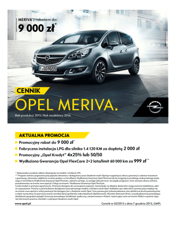 MERIVA z rabatem do: 9 000 zł * CENNIK OPEL MERIVA. Rok produkcji 2015 / Rok modelowy 2016. AKTUALNA PROMOCJA Promocyjny rabat do 9 000 zł* Fabryczna instalacja LPG dla silnika 1.4 120 KM za dopłatą 2 000 zł Promocyjny „Opel Kredyt” 4x25% lub 50/50 Wydłużona Gwarancja Opel FlexCare 2+2 lata/limit 60 000 km za 999 zł** * Maksymalna wysokość rabatu obowiązuje na modele z silnikiem LPG. ** Program ochrony pogwarancyjnej pojazdu oferowany i obsługiwany przez Dealerów marki Opel po wygaśnięciu okresu gwarancji o zakresie tożsamym z gwarancją, oferowany odpłatnie na okres podany w Certyfikacie Wydłużonej Gwarancji Opel FlexCare lub do osiągnięcia przebiegu maksymalnego podanego w Certyfikacie Wydłużonej Gwarancji Opel FlexCare, zależnie od tego, co nastąpi jako pierwsze. Szczegóły programu i inne warianty okresu ochrony przedstawiamy na stronie www.opel.pl / Usługi serwisowe / Wydłużona Gwarancja Opel FlexCare. Liczba modeli w promocji ograniczona. Promocja dostępna do wyczerpania zapasów. Samochody na składzie dealerskim mogą zawierać dodatkowe, płatne wyposażenie. Prosimy o potwierdzenie dostępności poszukiwanego modelu u Dealera marki Opel. Dokładny opis całej oferty promocyjnej znajduje się na stronie www.opel.pl w sekcji promocje lub dostępny jest u Dealerów marki Opel. Ceny promocyjne (rekomendowane ceny detaliczne brutto pomniejszone o rabat wymieniony na pierwszej stronie cennika) dotyczą klientów indywidualnych (detalicznych). Klientów flotowych (firmy i przedsiębiorstwa prowadzące działalność gospodarczą bądź instytucje prowadzące działalność społeczną, zarejestrowane w Polsce i rejestrujące auto na terenie Polski) w sprawie zapytań ofertowych prosimy o kontakt z wybranym Dealerem marki Opel. www.opel.pl Cennik nr 02/2015 z dnia 7 grudnia 2015, GMPL Cennik – Opel Meriva Rok produkcji 2015, rok modelowy 2016 Ceny promocyjne* Essentia Enjoy Design Edition Cosmo 1.4 (100 KM) M5 49 300 53 000 56 050 60 550 1.4 Turbo (120 KM) M5 53 150 56 850 59 900 64 400 1.4 Turbo (120 KM) Start/Stop M5 54 350 58 050 61 100 65 600 1.4 Turbo (120 KM) M6 54 050 57 750 60 800 65 300 1.4 Turbo (120 KM) A6 – 63 750 66 800 71 300 1.4 Turbo (120 KM) LPGTEC M5 – 58 850 61 900 66 400 1.4 Turbo (140 KM) M6 – 60 850 63 900 68 400 1.4 Turbo (140 KM) A6 – 67 750 70 800 75 300 1.6 CDTI (95 KM) ecoFLEX Start/Stop M5 61 700 65 400 68 450 72 950 1.6 CDTI (110 KM) Start/Stop M6 65 000 68 700 71 750 76 250 1.6 CDTI (136 KM) Start/Stop M6 – 73 100 76 150 80 650 * Liczba modeli w promocji ograniczona. Promocja dostępna do wyczerpania zapasów. Samochody na składzie dealerskim mogą zawierać dodatkowe, płatne wyposażenie. Prosimy o potwierdzenie dostępności poszukiwanego modelu u Dealera marki Opel. Dokładny opis całej oferty promocyjnej znajduje się na stronie www.opel.pl w sekcji promocje lub dostępny jest u Dealerów marki Opel. Ceny promocyjne (rekomendowane ceny detaliczne brutto pomniejszone o rabat wymieniony na pierwszej stronie cennika) dotyczą klientów indywidualnych (detalicznych). Klientów flotowych (firmy i przedsiębiorstwa prowadzące działalność gospodarczą bądź instytucje prowadzące działalność społeczną, zarejestrowane w Polsce i rejestrujące auto na terenie Polski) w sprawie zapytań ofertowych prosimy o kontakt z wybranym Dealerem marki Opel. Ceny katalogowe Essentia Enjoy Design Edition Cosmo 1.4 (100 KM) M5 55 300 59 000 62 050 66 550 1.4 Turbo (120 KM) M5 59 150 62 850 65 900 70 400 1.4 Turbo (120 KM) Start/Stop M5 60 350 64 050 67 100 71 600 1.4 Turbo (120 KM) M6 60 050 63 750 66 800 71 300 1.4 Turbo (120 KM) A6 – 69 750 72 800 77 300 1.4 Turbo (120 KM) LPG M5 – 67 850 70 900 75 400 1.4 Turbo (140 KM) M6 – 66 850 69 900 74 400 1.4 Turbo (140 KM) A6 – 73 750 76 800 81 300 1.6 CDTI (95 KM) ecoFLEX Start/Stop M6 67 700 71 400 74 450 78 950 1.6 CDTI (110 KM) Start/Stop M6 71 000 74 700 77 750 82 250 1.6 CDTI (136 KM) Start/Stop M6 – 79 100 82 150 86 650 Cennik Opla Merivy, rok produkcji 2015, rok modelowy 2016, nr 02/2015 z dnia 7 grudnia 2015 1/4 Essentia Enjoy Design Edition Cosmo S S S S S S S S S S S/– –/S S S S S S S S S S S S S – S S S S S S S S S S S S S – – S S – S S S – S S S S S – – S S AQ6 S S S S AJ7 S S S S 950 S S S S S S S S S S S S S S S AY0 1 800/P S S S AJF U68 400 – S S S S S S D7F – S S S S S S S S 4 200 – – 700 – 1 500/P 1 950 2 700 1 400/P – – 750 500/P 850/P 500/P S S S S S S S S S – 1 500/P 1 950 – 1 400/P – – 750 500/P 850/P 500/P S S S S S 1 500 – – S S S S S S S S S S S S CFD D8G QN1 PWD RT1 N65 UGE 2 100 – – – – – – 400 – 2 100 – 2 950 3 200 700/P 5 700 – 400/P 1 000 2 100 500/P 2 950 3 200 – 1 500 2 000 400/P 1 000 2 100 – 2 950 3 200 – 3 000 3 500 400/P 1 000 TAAT – 6 500 6 500 6 500 J2O 800 800 800 800 J31 1 000 1 000 1 000 1 000 SR1 – 1 600 1 600 1 600 SRY – 2 100 2 100 2 100 KC8 – 100 100 100 Wyposażenie standardowe Tapicerka materiałowa czarna Układ stabilizacji toru jazdy ESP® z systemem Traction Control System Hill Start Assist - wspomaganie ruszania na pochyłościach Przednie poduszki powietrzne kierowcy i pasażera Klimatyzacja sterowana ręcznie z układem recyrkulacji Radioodtwarzacz CD/MP3 300, 4 głośniki Elektrycznie sterowane szyby przednie Elektrycznie sterowane i podgrzewane lusterka zewnętrzne Zdalnie sterowany centralny zamek Hamulec postojowy sterowany elektrycznie Stalowe obręcze kół 15” (niedostępne z 1.6 CDTI) Stalowe obręcze kół 16” (w Essentia standard tylko z 1.6 CDTI) System monitorujący ciśnienie w oponach Tylne fotele z systemem składania i przesuwania FlexSpace® Fotel kierowcy z regulacją w 6 kierunkach (wzdłużną, wysokości, pochylenia oparcia), fotel pasażera z regulacją w 4 kierunkach (wzdłużną, pochylenia oparcia) Kolumna kierownicy regulowana w pionie i poziomie Tylne drzwi FlexDoors® z elektroniczną blokadą otwarcia w 