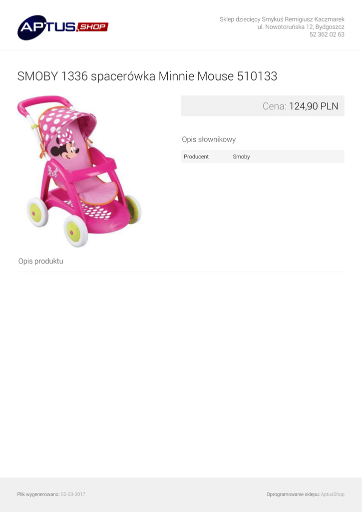 Sklep dziecięcy Smykuś Remigiusz Kaczmarek ul. Nowotoruńska 12, Bydgoszcz 52 362 02 63 SMOBY 1336 spacerówka Minnie Mouse 510133 Cena: 124,90 PLN Opis słownikowy Producent Smoby Opis produktu Plik wygenerowano: 02-03-2017 Powered by TCPDF (www.tcpdf.org) Oprogramowanie sklepu: AptusShop