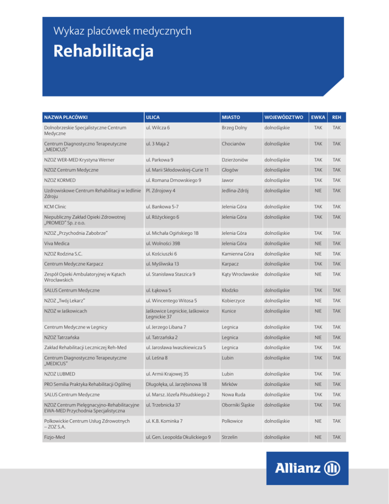 Wykaz placówek medycznych Rehabilitacja NAZWA PLACÓWKI ULICA MIASTO WOJEWÓDZTWO EWKA REH Dolnobrzeskie Specjalistyczne Centrum Medyczne ul. Wilcza 6 Brzeg Dolny dolnośląskie TAK TAK Centrum Diagnostyczno Terapeutyczne „MEDICUS” ul. 3 Maja 2 Chocianów dolnośląskie TAK TAK NZOZ WER-MED Krystyna Werner ul. Parkowa 9 Dzierżoniów dolnośląskie TAK TAK NZOZ Centrum Medyczne ul. Marii Skłodowskiej-Curie 11 Głogów dolnośląskie TAK TAK NZOZ KORMED ul. Romana Dmowskiego 9 Jawor dolnośląskie TAK TAK Uzdrowiskowe Centrum Rehabilitacji w Jedlinie Pl. Zdrojowy 4 Zdroju Jedlina-Zdrój dolnośląskie NIE TAK KCM Clinic ul. Bankowa 5-7 Jelenia Góra dolnośląskie TAK TAK Niepubliczny Zakład Opieki Zdrowotnej „PROMED” Sp. z o.o. ul. Różyckiego 6 Jelenia Góra dolnośląskie TAK TAK NZOZ „Przychodnia Zabobrze” ul. Michała Ogińskiego 1B Jelenia Góra dolnośląskie TAK TAK Viva Medica ul. Wolności 39B Jelenia Góra dolnośląskie NIE TAK NZOZ Rodzina S.C. ul. Kościuszki 6 Kamienna Góra dolnośląskie NIE TAK Centrum Medyczne Karpacz ul. Myśliwska 13 Karpacz dolnośląskie TAK TAK Zespół Opieki Ambulatoryjnej w Kątach Wrocławskich ul. Stanisława Staszica 9 Kąty Wrocławskie dolnośląskie NIE TAK SALUS Centrum Medyczne ul. Łąkowa 5 Kłodzko dolnośląskie TAK TAK NZOZ „Twój Lekarz” ul. Wincentego Witosa 5 Kobierzyce dolnośląskie NIE TAK NZOZ w Jaśkowicach Jaśkowice Legnickie, Jaśkowice Legnickie 37 Kunice dolnośląskie NIE TAK Centrum Medyczne w Legnicy ul. Jerzego Libana 7 Legnica dolnośląskie TAK TAK NZOZ Tatrzańska ul. Tatrzańska 2 Legnica dolnośląskie NIE TAK Zakład Rehabilitacji Leczniczej Reh-Med ul. Jarosława Iwaszkiewicza 5 Legnica dolnośląskie TAK TAK Centrum Diagnostyczno Terapeutyczne „MEDICUS” ul. Leśna 8 Lubin dolnośląskie TAK TAK NZOZ LUBMED ul. Armii Krajowej 35 Lubin dolnośląskie TAK TAK PRO Semilia Praktyka Rehabilitacji Ogólnej Długołęka, ul. Jarzębinowa 18 Mirków dolnośląskie NIE TAK SALUS Centrum Medyczne ul. Marsz. Józefa Piłsudskiego 2 Nowa Ruda dolnośląskie TAK TAK NZOZ Centrum Pielęgnacyjno-Rehabilitacyjne EWA-MED Przychodnia Specjalistyczna ul. Trzebnicka 37 Oborniki Śląskie dolnośląskie TAK TAK Polkowickie Centrum Usług Zdrowotnych – ZOZ S.A. ul. K.B. Kominka 7 Polkowice dolnośląskie NIE TAK Fizjo-Med ul. Gen. Leopolda Okulickiego 9 Strzelin dolnośląskie NIE TAK 1 –1– NAZWA PLACÓWKI ULICA MIASTO WOJEWÓDZTWO EWKA REH „Medyk” ul. Gdyńska 25 m.A Świdnica dolnośląskie TAK TAK NZOZ MARCONI ul. Rzeźnicza 13 Świdnica dolnośląskie NIE TAK NZOZ RAJ-MED Małgorzata Rajewska ul. Westerplatte 53 Świdnica dolnośląskie TAK TAK Gminne Centrum Medyczne TRZEBNICA-ZDRÓJ ul. Tadeusza Kościuszki 10 Trzebnica dolnośląskie TAK TAK Klinika Medyczna LUX MED ul. Uczniowska 16 Wałbrzych dolnośląskie NIE TAK NZOZ „Przychodnia Piaskowa Góra” sp. z o.o. ul. Główna 4 Wałbrzych dolnośląskie TAK TAK Ośrodek Diagnostyczno-Leczniczy przy Górniczej Fundacji Ochrony Zdrowia ul. Jana Matejki 5A Wałbrzych dolnośląskie TAK TAK Przychodnia Specjalistyczna Regina i Walenty Śliwa ul. Grodzka 73 Wałbrzych dolnośląskie NIE TAK Artemed Centrum Medzcyne ul. Zygmunta Krasińskiego 29 Wrocław dolnośląskie NIE TAK Centrum Medyczne Body Balance ul. Pawła Eluarda 7 Wrocław dolnośląskie NIE TAK Centrum Medyczne ENEL-MED Oddział Arkady Wrocławskie ul. Powstańców Śląskich 2-4 Wrocław dolnośląskie NIE TAK Centrum Medyczne „Zatorska” ul. Zatorska 55A Wrocław dolnośląskie TAK TAK Centrum Medyczne „Zdrowa Kobieta” ul. Kamiennogórska 10 Wrocław dolnośląskie TAK TAK EMC Instytut Medyczny S.A. Przychodnia przy Łowieckiej ul. Łowiecka 24 Wrocław dolnośląskie TAK TAK Klinika Medyczna LUX MED ul. Swobodna 1 Wrocław dolnośląskie NIE TAK Medycyna Rodzinna (MR) ul. Swobodna 1 Wrocław dolnośląskie NIE TAK Multi-Med Henryka Sienkiewicza 110 Wrocław dolnośląskie TAK TAK Sygnumedica Centrum Rehabilitacji ul. Jerzego Kukuczki 5/15 Wrocław dolnośląskie NIE TAK Wrocławskie Centrum SPA ul. Teatralna 10-12 Wrocław dolnośląskie TAK TAK Centrum Medyczne Gizińscy ul. Leśna 9 Bydgoszcz kujawsko-pomorskie TAK TAK CENTRUM ONKOLOGII im. prof. F.Łukaszczyka w Bydgoszczy ul. Dr. Izabeli Romanowskiej 2 Bydgoszcz kujawsko-pomorskie TAK TAK Centrum Rehabilitacji SYMAMED ul. Jaskółcza 18/1 Bydgoszcz kujawsko-pomorskie TAK TAK CRD MED ul. Grunwaldzka 123A m.DELTA Bydgoszcz kujawsko-pomorskie NIE TAK Fontes-Med sp. z o.o. ul. Marii Curie-Skłodowskiej 26 Bydgoszcz kujawsko-pomorskie NIE TAK OMEGA Medical Clinics ul. Ks. Zygmunta Trybowskiego 14 Bydgoszcz kujawsko-pomorskie NIE TAK Promedica GP ul. Ewy Szelburg-Zarembiny 19 Bydgoszcz kujawsko-pomorskie TAK TAK Remedium Clinic ul. Gdańska 80A Bydgoszcz kujawsko-pomorskie TAK TAK „SANITAS” Lekarze Specjaliści ul. Karola Libelta 2 Bydgoszcz kujawsko-pomorskie NIE TAK Wojskowa Specjalistyczna Przychodnia Lekarska Samodzielny Publiczny ZOZ ul. Legionów 57 Grudziądz kujawsko-pomorskie NIE TAK Centrum Medyczne Sir Med ul. Staropoznańska 131-133 Inowrocław kujawsko-pomorskie TAK TAK CIVIS VITA Centrum Medyczne ul. Warszawska 20 Toruń kujawsko-pomorskie TAK TAK Lecznice Citomed-Przychodnia nr.1 ul. Marii Skłodowskiej-Curie 73 Toruń kujawsko-pomorskie TAK TAK Niepubliczny Zakład Opieki Zdrowotnej Remedis Sp. z o.o. Pl. 18 Stycznia 4 Toruń kujawsko-pomorskie NIE TAK Specjalistyczne Centrum Diagnostyczno Rehabilitacyjne „Synapsa” ul. Adama Mickiewicza 130 Toruń kujawsko-pomorskie NIE TAK Activ Med – Centrum Odnowy Biologicznej i Rehabilitacji ul. Barska 13A Włocławek kujawsko-pomorskie TAK TAK 2 –2– NAZWA PLACÓWKI ULICA MIASTO WOJEWÓDZTWO EWKA REH Specjalistyczna Przychodnia Przemysłowa PROF-MED ul. Polna 26 Włocławek kujawsko-pomorskie NIE TAK Specjalistyczna Przychodnia Przemysłowa PROF-MED ul. Toruńska 222 Włocławek kujawsko-pomorskie NIE TAK Specjalistyczny Szpital Rehabilitacyjny BARSKA ul. 