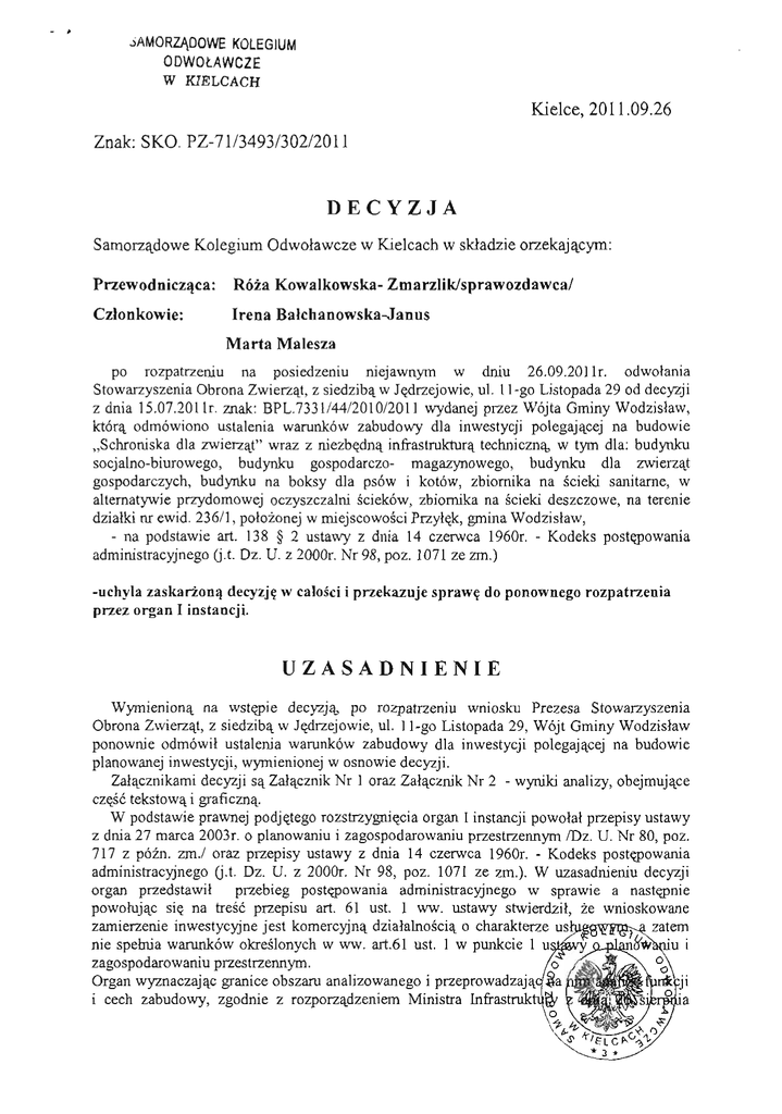 oAMORZĄDOWE KOLEGIUM ODWOŁAWCZE W KIELCACH Kielce, 2011.09.26 Znak: SKO. PZ-71/3493/302/2011 DECYZJA Samorządowe Kolegium Odwoławcze w Kielcach w składzie orzekającym: Przewodnicząca: Róża Kowalkowska- Zmarzlik/sprawozdawca/ Członkowie: Irena Bałchanowska-Janus Marta Malesza po rozpatrzeniu na posiedzeniu niejawnym w dniu 26.09.201 Ir. odwołania Stowarzyszenia Obrona Zwierząt, z siedzibą w Jędrzejowie, ul. 11-go Listopada 29 od decyzji z dnia 15.07.201 Ir. znak: BPL.7331/44/2010/2011 wydanej przez Wójta Gminy Wodzisław, którą odmówiono ustalenia warunków zabudowy dla inwestycji polegającej na budowie „Schroniska dla zwierząt" wraz z niezbędną infrastrukturą techniczną, w tym dla: budynku socjalno-biurowego, budynku gospodarczo- magazynowego, budynku dla zwierząt gospodarczych, budynku na boksy dla psów i kotów, zbiornika na ścieki sanitarne, w alternatywie przydomowej oczyszczalni ścieków, zbiornika na ścieki deszczowe, na terenie działki nr ewid. 236/1, położonej w miejscowości Przyłęk, gmina Wodzisław, - na podstawie art. 138 § 2 ustawy z dnia 14 czerwca 1960r. - Kodeks postępowania administracyjnego (j .t. Dz. U. z 2000r. Nr 98, póz. 1071 ze zm.) -uchyla zaskarżoną decyzję w całości i przekazuje sprawę do ponownego rozpatrzenia przez organ I instancji. UZASADNIENIE Wymienioną na wstępie decyzją, po rozpatrzeniu wniosku Prezesa Stowarzyszenia Obrona Zwierząt, z siedzibą w Jędrzejowie, ul. 11-go Listopada 29, Wójt Gminy Wodzisław ponownie odmówił ustalenia warunków zabudowy dla inwestycji polegającej na budowie planowanej inwestycji, wymienionej w osnowie decyzji. Załącznikami decyzji są Załącznik Nr l oraz Załącznik Nr 2 - wyniki analizy, obejmujące część tekstową i graficzną. W podstawie prawnej podjętego rozstrzygnięcia organ I instancji powołał przepisy ustawy z dnia 27 marca 2003r. o planowaniu i zagospodarowaniu przestrzennym /Dz. U. Nr 80, póz. 717 z późn. zm./ oraz przepisy ustawy z dnia 14 czerwca 1960r. - Kodeks postępowania administracyjnego (j .t. Dz. U. z 2000r. Nr 98, póz. 1071 ze zm.). W uzasadnieniu decyzji organ przedstawił przebieg postępowania administracyjnego w sprawie a następnie powołując się na treść przepisu art. 61 ust. l ww. ustawy stwierdził, że wnioskowane zamierzenie inwestycyjne jest komercyjną działalnością o charakterze usługgwpjt^ą zatem nie spełnia warunków określonych w ww. art. 61 ust. l w punkcie l zagospodarowaniu przestrzennym. Organ wyznaczając granice obszaru analizowanego i przeprowadzając i cech zabudowy, zgodnie z rozporządzeniem Ministra Infrastrukt 2003r. w sprawie sposobu ustalania wymagań dotyczących nowej zabudowy i zagospodarowania terenu w przypadku braku miejscowego planu zagospodarowania przestrzennego (Dz. U. z 2003r. Nr 164, póz. 1588), wskazał, że na obszarze analizowanym nie ma istniejącej zabudowy umożliwiającej ustalenie cech dla nowej zabudowy, ponieważ występuje tutaj zabudowa mieszkalno-gospodarcza. Planowana inwestycja nie posiada charakteru obiektu towarzyszącego istniejącej zabudowie i nie stanowi też uzupełnienia lub wzbogacenia funkcji podstawowej. Mając na uwadze powyższe organ I instancji stwierdził, że brak jest podstaw prawnych do wydania pozytywnej decyzji o warunkach zabudowy w niniejszej sprawie. Od ww. decyzji odwołanie wniosła Pani Agnieszka Lechowicz Prezes Stowarzyszenia Obrona Zwierząt, wnosząc o ustalenie warunków zabudowy dla wnioskowanej inwestycji lub przekazanie sprawy do ponownego rozpatrzenia przez organ I instancji. W uzasadnieniu odwołania podniesiono, że schronisko dla bezdomnych zwierząt nie jest przedsięwzięciem o działalności gospodarczo - komercyjnej o charakterze usługowym. W dalszej części odwołania przedstawiono analizę funkcji schroniska jako całości. Wskazano, że zwierzęta domowe i gospodarskie są, w odróżnieniu od wolno żyjących /dzikich zwierząt/ przedmiotem najdalej idących zobowiązań ze strony człowieka, tj. zobowiązania do opieki, co wynika wprost z ustawowej definicji tej kategorii zwierząt. W odniesieniu do zwierząt domowych i gospodarskich wprowadza się więc generalny stosunek nazwany opieką. Konkretyzacją generalnego stosunku opieki wobec zwierząt domowych wynikającego z art. l ustawy o ochronie zwierząt jest określone w art. 11 ust. l publiczne zadanie gmin wobec zwierząt bezdomnych (domowych i gospodarskich) polegające na zapewnianiu im opieki oraz ich wyłapywaniu. W tym miejscu wyjaśniono, że wyłapywanie bezdomnych zwierząt uregulowane rozporządzeniem wykonawczym ma charakter środka do celu, jakim jest zapewnienie opieki. Zgodnie z rozporządzeniem Ministra Spraw Wewnętrznych i Administracji z dnia 26.08.1998r. w sprawie zasad i warunków wyłapywania bezdomnych zwierząt zapewnianie przez gminę wyłapywanym zwierzętom może odbywać się wyłącznie w schroniskach. Zdaniem strony odwołującej się, zarówno schronisko dla zwierząt jak i każde gospodarstwo domowe, w którym utrzymywane są zwierzęta pełnią tę samą funkcję opiekuńczą wobec zwierząt z tą różnicą, że w przypadku schroniska jest to jego funkcja główna i najważniejsza. W dalszej części odwołania wyrażono pogląd, że nie ma racji Wójt Gminy twierdząc, że budowa schroniska nie będzie stanowiła kontynuacji funkcji, ponieważ jest przeciwnie. Zarówno planowane budynki jak i cała infrastruktura odpowiadają w swej istocie zabudowie już istniejącej. W odwołaniu zarzucono, że wg toku rozumowania przyjętego przez organ, lokalizacja schroniska mogłaby mieć miejsce wyłącznie w przypadku już istniejącego takiego samego obiektu w obszarze analizowanym. Zatem oczekiwanie ciągłości szczególnej funkcji schroniska dla zwierząt na danym obszarze jest w rzeczywistości niemożliwym. Zatem pojęcia ładu przestrzennego nie można, zdaniem Stowarzyszenia, rozumieć w taki sposób, że na danym terenie możliwa b