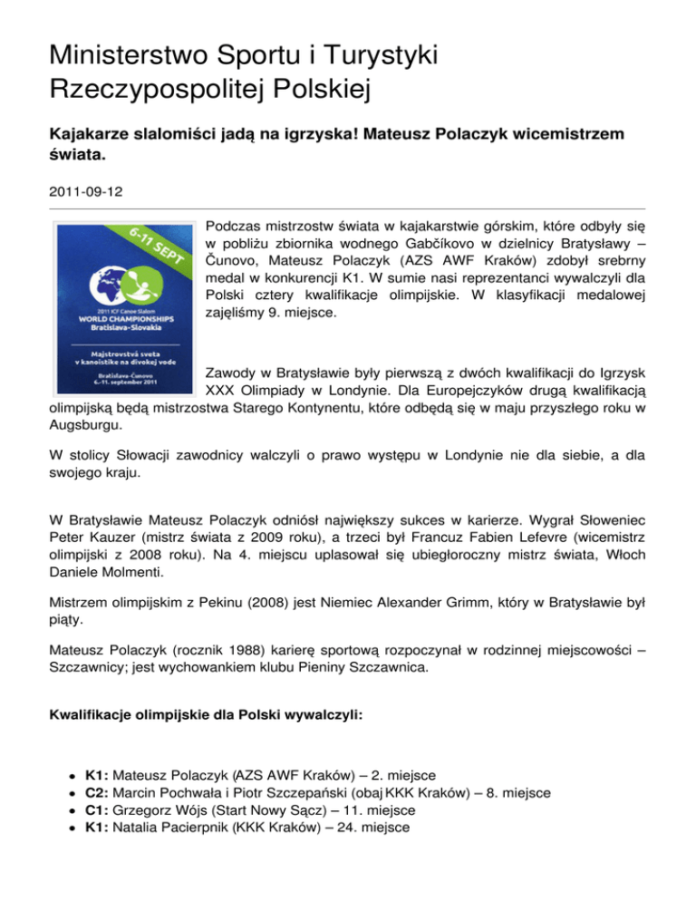 Ministerstwo Sportu i Turystyki Rzeczypospolitej Polskiej Kajakarze slalomiści jadą na igrzyska! Mateusz Polaczyk wicemistrzem świata. 2011-09-12 Podczas mistrzostw świata w kajakarstwie górskim, które odbyły się w pobliżu zbiornika wodnego Gabčíkovo w dzielnicy Bratysławy – Čunovo, Mateusz Polaczyk (AZS AWF Kraków) zdobył srebrny medal w konkurencji K1. W sumie nasi reprezentanci wywalczyli dla Polski cztery kwalifikacje olimpijskie. W klasyfikacji medalowej zajęliśmy 9. miejsce. Zawody w Bratysławie były pierwszą z dwóch kwalifikacji do Igrzysk XXX Olimpiady w Londynie. Dla Europejczyków drugą kwalifikacją olimpijską będą mistrzostwa Starego Kontynentu, które odbędą się w maju przyszłego roku w Augsburgu. W stolicy Słowacji zawodnicy walczyli o prawo występu w Londynie nie dla siebie, a dla swojego kraju. W Bratysławie Mateusz Polaczyk odniósł największy sukces w karierze. Wygrał Słoweniec Peter Kauzer (mistrz świata z 2009 roku), a trzeci był Francuz Fabien Lefevre (wicemistrz olimpijski z 2008 roku). Na 4. miejscu uplasował się ubiegłoroczny mistrz świata, Włoch Daniele Molmenti. Mistrzem olimpijskim z Pekinu (2008) jest Niemiec Alexander Grimm, który w Bratysławie był piąty. Mateusz Polaczyk (rocznik 1988) karierę sportową rozpoczynał w rodzinnej miejscowości – Szczawnicy; jest wychowankiem klubu Pieniny Szczawnica. Kwalifikacje olimpijskie dla Polski wywalczyli: K1: Mateusz Polaczyk (AZS AWF Kraków) – 2. miejsce C2: Marcin Pochwała i Piotr Szczepański (obaj KKK Kraków) – 8. miejsce C1: Grzegorz Wójs (Start Nowy Sącz) – 11. miejsce K1: Natalia Pacierpnik (KKK Kraków) – 24. miejsce W K1 kwalifikację olimpijską wywalczyło pierwszych piętnaście państw (Natalia Pacierpnik w półfinale zajęła 24. miejsce i zakończyła udział w zawodach; mimo to zapewniła reprezentantce Polski prawo startu w Londynie, gdyż przed nią znalazły się zawodniczki z 11 państw, a kwalifikacje wywalczyło 15 krajów). Wśród C2 do zdobycia było osiem olimpijskich kwalifikacji, w tym jedna dla gospodarzy przyszłorocznych igrzysk w Londynie. Z każdego kraju brana była pod uwagę tylko jedna osada; przed Polakami uplasowały się dwa duety ze Słowacji i W. Brytanii. W jedynkach kanadyjkowych kwalifikację olimpijską wywalczyło pierwszych dziesięć (w tej puli zarezerwowano miejsca dla jednej osady W. Brytanii). Klasyfikacja medalowa MŚ w kajakarstwie górskim 2011: 1. Słowacja 3 złote – 2 srebrne – 3 brązowe; RAZEM: 8 2. Francja 2 złote – 2 srebrne – 1 brązowy;RAZEM: 5 3. Niemcy 1 złoty – 2 srebrne – 2 brązowe;RAZEM: 5 4. Czechy 1 złoty – 1 srebrny – 1 brązowy;RAZEM: 3 5. Australia 1 złoty – 0 srebrnych – 0 brązowych;RAZEM: 1 Austria 1 złoty – 0 srebrnych – 0 brązowych; RAZEM: 1 Słowenia 1 złoty – 0 srebrnych – 0 brązowych; RAZEM: 1 8. Chiny 0 złotych – 2 srebrne – 0 brązowych; RAZEM: 2 9. POLSKA 0 złotych – 1 srebrny – 0 brązowych; RAZEM: 1 10. Hiszpania 0 złotych – 0 srebrnych – 1 brązowy;RAZEM: 1 W. Brytania 0 złotych – 0 srebrnych – 1 brązowy; RAZEM: 1 Włochy 0 złotych – 0 srebrnych – 1 brązowy; RAZEM: 1 Po raz ostatni medal mistrzostw świata Polacy wywalczyli w 2006 roku, w Pradze – brązowy w konkurencji kajaków drużynowo: Grzegorz Polaczyk, Mateusz Polaczyk i Dariusz Popiela (wygrali wówczas Francuzi przed Włochami).