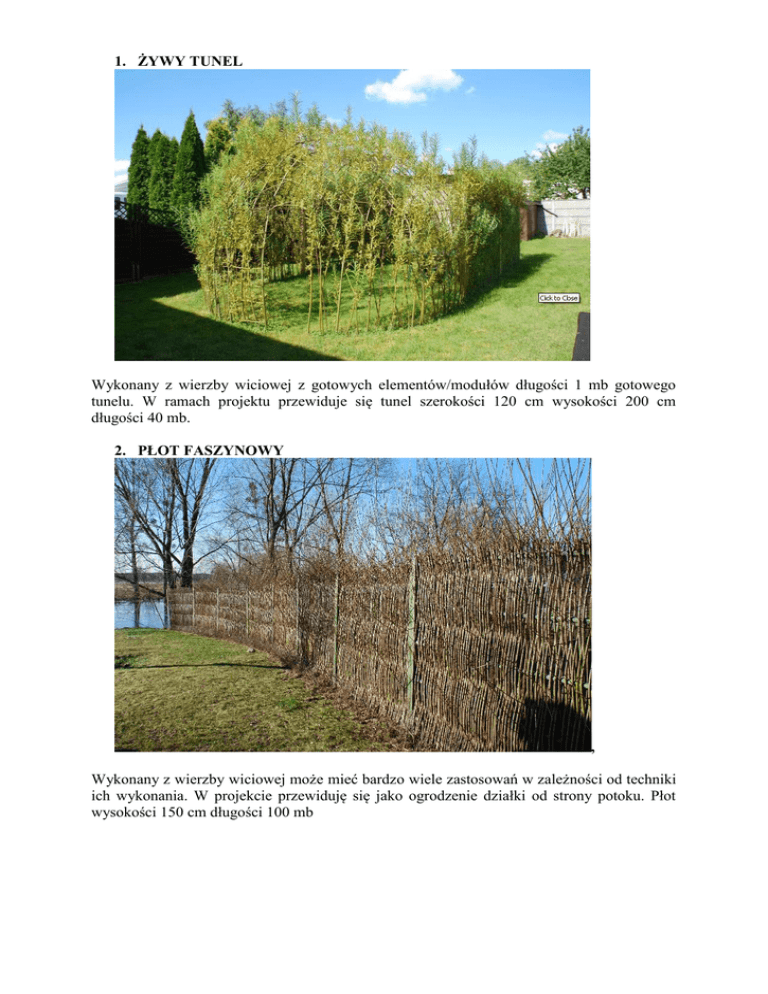 1. ŻYWY TUNEL Wykonany z wierzby wiciowej z gotowych elementów/modułów długości 1 mb gotowego tunelu. W ramach projektu przewiduje się tunel szerokości 120 cm wysokości 200 cm długości 40 mb. 2. PŁOT FASZYNOWY , Wykonany z wierzby wiciowej może mieć bardzo wiele zastosowań w zależności od techniki ich wykonania. W projekcie przewiduję się jako ogrodzenie działki od strony potoku. Płot wysokości 150 cm długości 100 mb