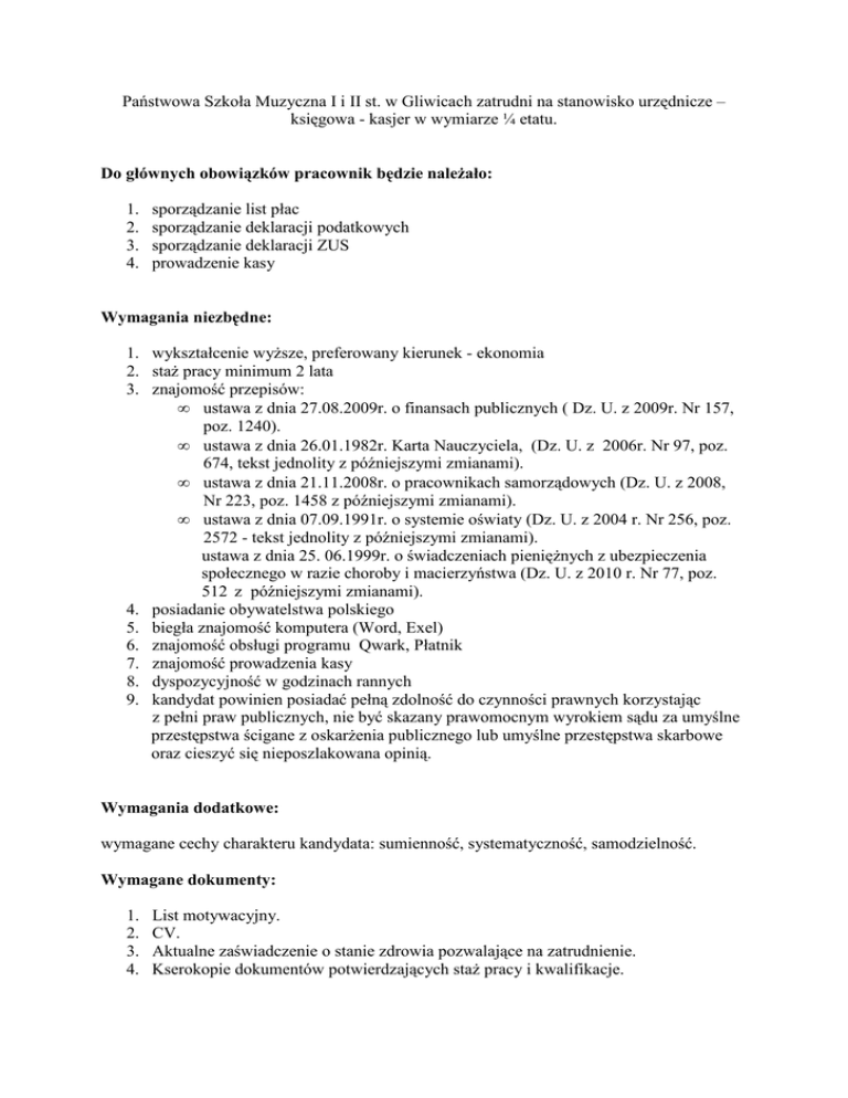 Państwowa Szkoła Muzyczna I i II st. w Gliwicach zatrudni na stanowisko urzędnicze – księgowa - kasjer w wymiarze ¼ etatu. Do głównych obowiązków pracownik będzie naleŜało: 1. 2. 3. 4. sporządzanie list płac sporządzanie deklaracji podatkowych sporządzanie deklaracji ZUS prowadzenie kasy Wymagania niezbędne: 1. wykształcenie wyŜsze, preferowany kierunek - ekonomia 2. staŜ pracy minimum 2 lata 3. znajomość przepisów: • ustawa z dnia 27.08.2009r. o finansach publicznych ( Dz. U. z 2009r. Nr 157, poz. 1240). • ustawa z dnia 26.01.1982r. Karta Nauczyciela, (Dz. U. z 2006r. Nr 97, poz. 674, tekst jednolity z późniejszymi zmianami). • ustawa z dnia 21.11.2008r. o pracownikach samorządowych (Dz. U. z 2008, Nr 223, poz. 1458 z późniejszymi zmianami). • ustawa z dnia 07.09.1991r. o systemie oświaty (Dz. U. z 2004 r. Nr 256, poz. 2572 - tekst jednolity z późniejszymi zmianami). ustawa z dnia 25. 06.1999r. o świadczeniach pienięŜnych z ubezpieczenia społecznego w razie choroby i macierzyństwa (Dz. U. z 2010 r. Nr 77, poz. 512 z późniejszymi zmianami). 4. posiadanie obywatelstwa polskiego 5. biegła znajomość komputera (Word, Exel) 6. znajomość obsługi programu Qwark, Płatnik 7. znajomość prowadzenia kasy 8. dyspozycyjność w godzinach rannych 9. kandydat powinien posiadać pełną zdolność do czynności prawnych korzystając z pełni praw publicznych, nie być skazany prawomocnym wyrokiem sądu za umyślne przestępstwa ścigane z oskarŜenia publicznego lub umyślne przestępstwa skarbowe oraz cieszyć się nieposzlakowana opinią. Wymagania dodatkowe: wymagane cechy charakteru kandydata: sumienność, systematyczność, samodzielność. Wymagane dokumenty: 1. 2. 3. 4. List motywacyjny. CV. Aktualne zaświadczenie o stanie zdrowia pozwalające na zatrudnienie. Kserokopie dokumentów potwierdzających staŜ pracy i kwalifikacje. 5. Kwestionariusz osobowy dla osoby ubiegającej się o zatrudnienie (opublikowany na stronie internetowej www.psmgliwice.pl). 6. Formularz oświadczeń (opublikowany na stronie internetowej www.psmgliwice.pl). Oświadczenie, CV oraz list motywacyjny powinien być własnoręcznie podpisane. Wszystkie dokumenty zawarte w ofercie muszą być sporządzone w języku polskim w formie umoŜliwiającej ich do odczytu. Dokumenty wydane w języku obcym powinny zostać złoŜone wraz z tłumaczeniem. Inne informacje: 1. Dokumenty naleŜy składać do 24.09.2012r. do godziny 12:00 w sekretariacie Państwowej Szkoły Muzycznej I i II st. w Gliwicach, ul. Wieczorka 6, w zaklejonej kopercie opatrzonej napisem „Nabór na stanowisko księgowa – kasjer” oraz numer ogłoszenia. Aplikacje, które wpłyną po wyŜej określonym terminie, nie będą rozpatrywane. W przypadku przesłania oferty za pośrednictwem poczty decyduje data jej wpływu. Do oferty mogą być dołączone inne dokumenty, w tym opinie lub referencje z poprzednich miejsc pracy. 2. Rekrutacja składać się będzie z II etapów: I. test merytoryczny dla osób , które spełniły wymogi formalne – 27.09.2012 godz. 11oo II. rozmowa kwalifikacyjna. 3. Kandydaci nie będą informowani indywidualnie o terminie testu merytorycznego. 4. Dodatkowe informacje moŜna uzyskać bezpośrednio w sekretariacie PSM I i II st. w Gliwicach , ul. Wieczorka 6 lub telefonicznie pod numerem 32 231 31 23 . 5. Dyrektor zastrzega prawo do odwołania konkursu bez podania przyczyn. 6. Oferty nie będą odsyłane – osoby zainteresowane zwrotem dokumentów będą mogły je odebrać w sekretariacie PSM I i II st. w Gliwicach, zgłaszając się osobiście. 7. W miesiącu poprzedzającym datę publikacji niniejszego ogłoszenia wskaźnik zatrudnienia osób niepełnosprawnych w PSM I i II st. w Gliwicach, w rozumieniu przepisów rehabilitacji zawodowej i społecznej oraz zatrudnieniu osób niepełnosprawnych nie przekroczył 6%, 8. JeŜeli wskaźnik zatrudnienia osób niepełnosprawnych, o którym mowa powyŜej miesiącu poprzedzającym datę publikacji niniejszego ogłoszenia o naborze jest niŜszy niŜ 6 %, pierwszeństwo w zatrudnieniu na stanowiskach urzędniczych przysługuje osobie niepełnosprawnej o ile spełnia wymagania niezbędne i dodatkowe. 9. Kandydat, który zamierza skorzystać z powyŜszego uprawnienia zobowiązany jest do złoŜenia wraz z dokumentami kopii dokumentu potwierdzającego niepełnosprawność. KWESTIONARIUSZ OSOBOWY (część A) DLA OSOBY UBIEGAJĄCEJ SIĘ O ZATRUDNIENIE NAZWISKO: IMIONA: IMIONA RODZICÓW: DATA URODZENIA: OBYWATELSTWO: Miejsce zamieszkania (miejscowość) ADRES DO KORESPONDENCJI: (miejscowość, kod, ulica nr domu i mieszkania, gmina) TELEFON, E-MAIL: WYKSZTAŁCENIE: PODSTAWOWE, ŚREDNIE, WYśSZE* (*niepotrzebne skreślić) NAZWA SZKOŁY I ROK JEJ UKOŃCZENIA: ..................................................................................................................................................................................................................... ..................................................................................................................................................................................................................... WYDZIAŁ: .................................................................................................................................................................................................. KIERUNEK: SPECJALNOŚĆ: STOPIEŃ, TYTUŁ ZAWODOWY, NAUKOWY: ZAWÓD: WYKSZTAŁCENIE UZUPEŁNIAJĄCE, STUDIA PODYPLOMOWE, KURSY UPRAWNIENIA, (data ukończenia lub rozpoczęcia nauki w przypadku jej trwania): ............................................................................................................................................................................................................ .................................................................................................................................................................