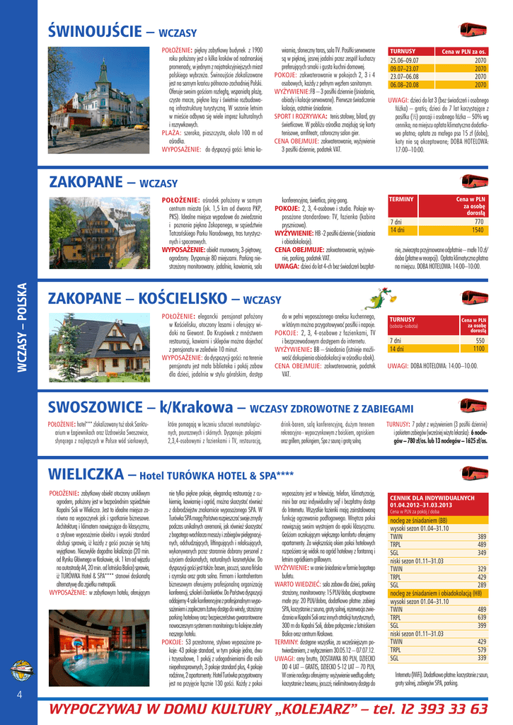 ŚWINOUJŚCIE – WCZASY POŁOŻENIE: piękny zabytkowy budynek z 1900 roku położony jest o kilka kroków od nadmorskiej promenady, w jednym z najatrakcyjniejszych miast polskiego wybrzeża. Świnoujście zlokalizowane jest na samym krańcu północno-zachodniej Polski. Oferuje swoim gościom rozległą, wspaniałą plażę, czyste morze, piękne lasy i świetnie rozbudowaną infrastrukturę turystyczną. W sezonie letnim w mieście odbywa się wiele imprez kulturalnych i rozrywkowych. PLAŻA: szeroka, piaszczysta, około 100 m od ośrodka. WYPOSAŻENIE: do dyspozycji gości: letnia ka- wiarnia, słoneczny taras, sala TV. Posiłki serwowane są w pięknej, jasnej jadalni przez zespół kucharzy preferujących smaki i gusta kuchni domowej. POKOJE: zakwaterowanie w pokojach 2, 3 i 4 osobowych, każdy z pełnym węzłem sanitarnym. WYŻYWIENIE:FB – 3 posiłki dziennie (śniadania, obiady i kolacje serwowane). Pierwsze świadczenie kolacja, ostatnie śniadanie. SPORT I ROZRYWKA: tenis stołowy, bilard, gry świetlicowe. W pobliżu ośrodka znajdują się korty tenisowe, amfiteatr, całoroczny salon gier. CENA OBEJMUJE: zakwaterowanie, wyżywienie 3 posiłki dziennie, podatek VAT. TURNUSY Cena w PLN za os. 25.06–09.07 09.07–23.07 23.07–06.08 06.08–20.08 2070 2070 2070 2070 UWAGI: dzieci do lat 3 (bez świadczeń i osobnego łóżka) – gratis; dzieci do 7 lat korzystające z posiłku (½) porcaji i osobnego łóżka – 50% wg cennika; na miejscu opłata klimatyczna dodatkowo płatna; opłata za małego psa 15 zł (doba), koty nie są akceptowane; DOBA HOTELOWA: 17:00–10:00. ZAKOPANE – WCZASY WCZASY – POLSKA POŁOŻENIE: ośrodek położony w samym centrum miasta (ok. 1,5 km od dworca PKP, PKS). Idealne miejsce wypadowe do zwiedzania i poznania piękna Zakopanego, w sąsiedztwie Tatrzańskiego Parku Narodowego, tras turystycznych i spacerowych. WYPOSAŻENIE: obiekt murowany, 3-piętrowy, ogrodzony. Dysponuje 80 miejscami. Parking niestrzeżony monitorowany. jadalnia, kawiarnia, sala konferencyjna, świetlica, ping-pong. POKOJE: 2, 3, 4-osobowe i studia. Pokoje wyposażone standardowo: TV, łazienka (kabina prysznicowa). WYŻYWIENIE: HB -2 posiłki dziennie ( śniadania i obiadokolacje). CENA OBEJMUJE: zakwaterowanie, wyżywienie, parking, podatek VAT. UWAGA: dzieci do lat 4-ch bez świadczeń bezpłat- TERMINY 7 dni 14 dni Cena w PLN za osobę dorosłą 770 1540 nie, zwierzęta przyjmowane odpłatnie – małe 10 zł/ doba (płatne w recepcji). Opłata klimatyczna płatna na miejscu. DOBA HOTELOWA: 14:00–10:00. ZAKOPANE – KOŚCIELISKO – WCZASY POŁOŻENIE: elegancki pensjonat położony w Kościelisku, otoczony lasami i oferujący widoki na Giewont. Do Krupówek z mnóstwem restauracji, kawiarni i sklepów można dojechać z pensjonatu w zaledwie 10 minut. WYPOSAŻENIE: do dyspozycji gości: na terenie pensjonatu jest mała biblioteka i pokój zabaw dla dzieci, jadalnia w stylu góralskim, dostęp do w pełni wyposażonego aneksu kuchennego, w którym można przygotowywać posiłki i napoje. POKOJE: 2, 3, 4-osobowe z łazienkami, TV i bezprzewodowym dostępem do internetu. WYŻYWIENIE: BB – śniadania (istnieje możliwość dokupienia obiadokolacji w ośrodku obok). CENA OBEJMUJE: zakwaterowanie, podatek VAT. TURNUSY (sobota–sobota) 7 dni 14 dni Cena w PLN za osobę dorosłą 550 1100 UWAGI: DOBA HOTELOWA: 14:00–10:00. SWOSZOWICE – k/Krakowa – WCZASY ZDROWOTNE Z ZABIEGAMI POŁOŻENIE: hotel*** zlokalizowany tuż obok Sanktuarium w Łagiewnikach oraz Uzdrowiska Swoszowice, słynącego z najlepszych w Polsce wód siarkowych, które pomagają w leczeniu schorzeń reumatologicznych, pourazowych i skórnych. Dysponuje: pokojami 2,3,4-osobowymi z łazienkami i TV, restauracją, drink-barem, salą konferencyjną, dużym terenem rekreacyjno - wypoczynkowym z boiskiem, ogniskiem oraz grillem, parkingiem, Spa z sauną i grotą solną. TURNUSY: 7 pobyt z wyżywieniem (3 posiłki dziennie) i pakietem zabiegów (wcześniej wizyta lekarska): 6 noclegów – 780 zł/os. lub 13 noclegów – 1625 zł/os. WIELICZKA – Hotel TURÓWKA HOTEL & SPA**** POŁOŻENIE: zabytkowy obiekt otoczony urokliwym ogrodem, położony jest w bezpośrednim sąsiedztwie Kopalni Soli w Wieliczce. Jest to idealne miejsce zarówno na wypoczynek jak i spotkanie biznesowe. Architekturą i klimatem nawiązujące do klasycyzmu, a stylowe wyposażenie obiektu i wysoki standard obsługi sprawią, iż każdy z gości poczuje się tutaj wyjątkowo. Niezwykle dogodna lokalizacja (20 min. od Rynku Głównego w Krakowie, ok. 1 km od wjazdu na autostradę A4, 20 min. od lotniska Balice) sprawia, iż TURÓWKA Hotel & SPA**** stanowi doskonałą alternatywę dla zgiełku metropolii. WYPOSAŻENIE: w zabytkowym hotelu, oferującym 4 nie tylko piękne pokoje, elegancką restaurację z cukiernią, kawiarnię i ogród, można skorzystać również z dobrodziejstw znakomicie wyposażonego SPA. W Turówka SPA mogą Państwo rozpieszczać swoje zmysły podczas unikalnych ceremonii, jak również skorzystać z bogatego wachlarza masaży i zabiegów pielęgnacyjnych, odchudzających, liftingujących i relaksujących, wykonywanych przez starannie dobrany personel z użyciem doskonałych, naturalnych kosmetyków. Do dyspozycji gości jest także: basen, jacuzzi, sauna fińska i rzymska oraz grota solna. Firmom i kontrahentom biznesowym oferujemy profesjonalną organizację konferencji, szkoleń i bankietów. Do Państwa dyspozycji oddajemy 4 sale konferencyjne z profesjonalnym wyposażeniem i zapleczem.Łatwy dostęp do windy, strzeżony parking hotelowy oraz bezpieczeństwo gwarantowane nowoczesnym systemem monitoringu to kolejne zalety naszego hotelu. POKOJE: 53 przestronne, stylowo wyposażone pokoje: 43 pokoje standard, w tym pokoje jedno, dwu i trzyosobowe, 1 pokój z udogodnieniami dla osób niepełnosprawnych, 3 pokoje standard plus, 4 pokoje rodzinne, 2 apartamenty. Hotel Turówka przygotowany jest na przyjęcie ł