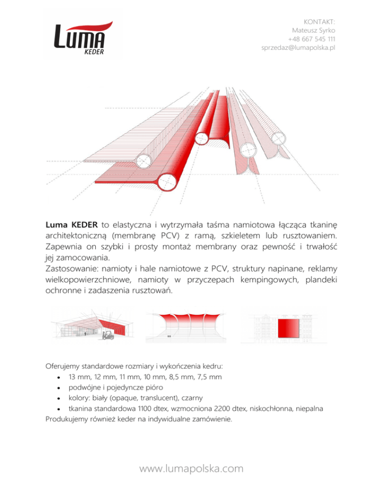 KONTAKT: Mateusz Syrko +48 667 545 111 [email protected] Luma KEDER to elastyczna i wytrzymała taśma namiotowa łącząca tkaninę architektoniczną (membranę PCV) z ramą, szkieletem lub rusztowaniem. Zapewnia on szybki i prosty montaż membrany oraz pewność i trwałość jej zamocowania. Zastosowanie: namioty i hale namiotowe z PCV, struktury napinane, reklamy wielkopowierzchniowe, namioty w przyczepach kempingowych, plandeki ochronne i zadaszenia rusztowań. Oferujemy standardowe rozmiary i wykończenia kedru: 13 mm, 12 mm, 11 mm, 10 mm, 8,5 mm, 7,5 mm podwójne i pojedyncze pióro kolory: biały (opaque, translucent), czarny tkanina standardowa 1100 dtex, wzmocniona 2200 dtex, niskochłonna, niepalna Produkujemy również keder na indywidualne zamówienie. www.lumapolska.com KONTAKT: Mateusz Syrko +48 667 545 111 [email protected] OFERTA Rodzaje kedru: 13 mm, 12 mm, 11 mm, 10 mm Podwójne pióro Wymiary: A – 13 mm / B – 10 mm / C – 30 mm / D – 40 mm 8,5 mm, 7,5 mm Podwójne pióro, pojedyncze pióro Wymiary: A – 7,5 mm / B – 10 mm / C – 20 mm / D – 30 mm Tkaniny, z których wykonujemy każdy rodzaj kedru: 1100 dtex Biały Czarny Biały/niskochłonny Biały/niskochłonny/niepalny Biały/niskochłonny/niepalny/opaque 550 g/m2 550 g/m2 680 g/m2 680 g/m2 680 g/m2 2200 dtex Biały/opaque Biały/niskochłonny Biały/niskochłonny/opaque www.lumapolska.com 750 g/m2 830 g/m2 830 g/m2