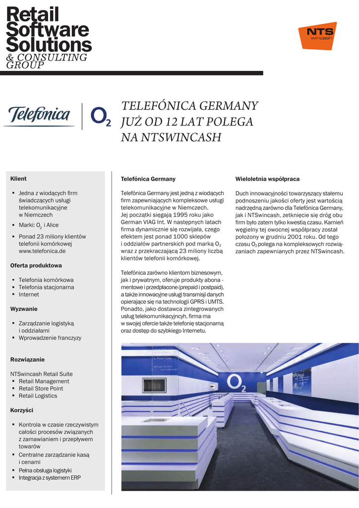 TELEFÓNICA GERMANY JUŻ OD 12 LAT POLEGA NA NTSWINCASH Klient Jedna z wiodących firm świadczących usługi telekomunikacyjne w Niemczech Marki: O2 i Alice Ponad 23 miliony klientów telefonii komórkowej www.telefonica.de Telefónica Germany Wieloletnia współpraca Telefónica Germany jest jedną z wiodących firm zapewniających kompleksowe usługi telekomunikacyjne w Niemczech. Jej początki sięgają 1995 roku jako German VIAG Int. W następnych latach firma dynamicznie się rozwijała, czego efektem jest ponad 1000 sklepów i oddziałów partnerskich pod marką O2 wraz z przekraczającą 23 miliony liczbą klientów telefonii komórkowej. Duch innowacyjności towarzyszący stałemu podnoszeniu jakości oferty jest wartością nadrzędną zarówno dla Telefónica Germany, jak i NTSwincash, zetknięcie się dróg obu firm było zatem tylko kwestią czasu. Kamień węgielny tej owocnej współpracy został położony w grudniu 2001 roku. Od tego czasu O2 polega na kompleksowych rozwiązaniach zapewnianych przez NTSwincash. Oferta produktowa Telefonia komórkowa Telefonia stacjonarna Internet Wyzwanie Zarządzanie logistyką i oddziałami Wprowadzenie franczyzy Rozwiązanie NTSwincash Retail Suite Retail Management Retail Store Point Retail Logistics Korzyści Kontrola w czasie rzeczywistym całości procesów związanych z zamawianiem i przepływem towarów Centralne zarządzanie kasą i cenami Pełna obsługa logistyki Integracja z systemem ERP Telefónica zarówno klientom biznesowym, jak i prywatnym, oferuje produkty abona mentowe i przedpłacone (prepaid i postpaid), a także innowacyjne usługi transmisji danych opierające się na technologii GPRS i UMTS. Ponadto, jako dostawca zintegrowanych usług telekomunikacyjncyh, firma ma w swojej ofercie także telefonię stacjonarną oraz dostęp do szybkiego Internetu. Innowacyjne oprogramowanie NTS - Najważniejsze informacje Telefónica Germany zdecydowała się na wczesnym etapie na wdrożenie rozwiązań systemu NTSwincash Retail Management w zakresie logistyki towarowej oraz zarządzania oddziałami. Decydującą rolę odegrał tu szeroki wachlarz opcji dostępnych w tym innowacyjnym oprogramowaniu, m.in. zarządzanie w czasie rzeczywistym zamówieniami i przepływami towarów wewnątrz całej sieci. NTS rozwija i wdraża kompleksowe rozwiązania branżowe dla sieci handlowych. NTSwincash Retail Suite zapewnia tej prężnie rozwijającej się firmie centralne zarządzanie wszystkimi kasami, których ilość przekracza już 1500. Umożliwia zmianę nie tylko danych podstawowych, ale także parametrów systemowych każdej kasy, co pozwala na szybkie i proste reagowanie na potrzeby klientów. Najważniejsza logistyka Telefónica Germany, jako przedsiębiorstwo o dużej liczbie oddziałów, kładzie największy nacisk na perfekcyjne działanie systemu logistycznego. Zastosowanie modułu Retail Logistics NTSwincash umożliwiło kompleksowe śledzenie całego przepływu towarów i bezproblemowe przeprowadzanie związanych z tym procesów. NTSwincash zapewnił Telefónice Germany elastyczny system w pełni spełniający wysokie wymagania tej firmy. System NTSwincash Retail Management zapewnia funkcjonalności szczególnie istotne dla sieci franczyzowych oraz posiadających rozbudowaną strukturę, takie jak komfortowe centralne zarządzanie sklepami, czy efektywne i oszczędne zarządzanie towarem. Rozwiązania NTSwincash są stosowane przez sieci handlowe z branży telekomunikacji, RTV/AGD, czy artykułów luksusowych, w krajach Europy, Rosji, na Bliskim Wschodzie i w Afryce. System NTSwincash jest rozwiązaniem, na którym polegają takie firmy jak Vodafone, Orange, Telefónica, Etisalat, Swisscom, czy M.video. W ofercie NTSwincash znajdują się: Rozwiązania dla punktów sprzedaży detalicznej i punktów obsługi serwisowej Centralne zarządzanie oddziałami Wsparcie sprzedaży wielokanałowej Centralne zarządzanie danymi Obsługa posprzedażowa Logistyka oddziałów z centralnym zarządzaniem przepływu towaru Sprzedaż i obsługa mobilna Ustandaryzowane interfejsy dla systemów ERP, CRM, bilingowania itp. Informacje dla zarządu dostępne centralnie Zarządzanie prowizjami Indywidualne rozwiązania dla sklepów “TELEFÓNICA GERMANY JUŻ OD 12 LAT STOSUJE W ZARZĄDZANIU SIECIĄ SPRZEDAŻY NAJLEPSZE, SPRAWDZONE I PRZY TYM INNOWACYJNE ROZWIĄZANIA NTSWINCASH” Michael Rauch / Senior Project Manager Telefónica Germany GmbH & Co. OHG NTSwincash Commit Polska Sp. z o.o. / ul. Załęska 44 / 35 - 322 Rzeszów / www.commit.pl 850 74 01