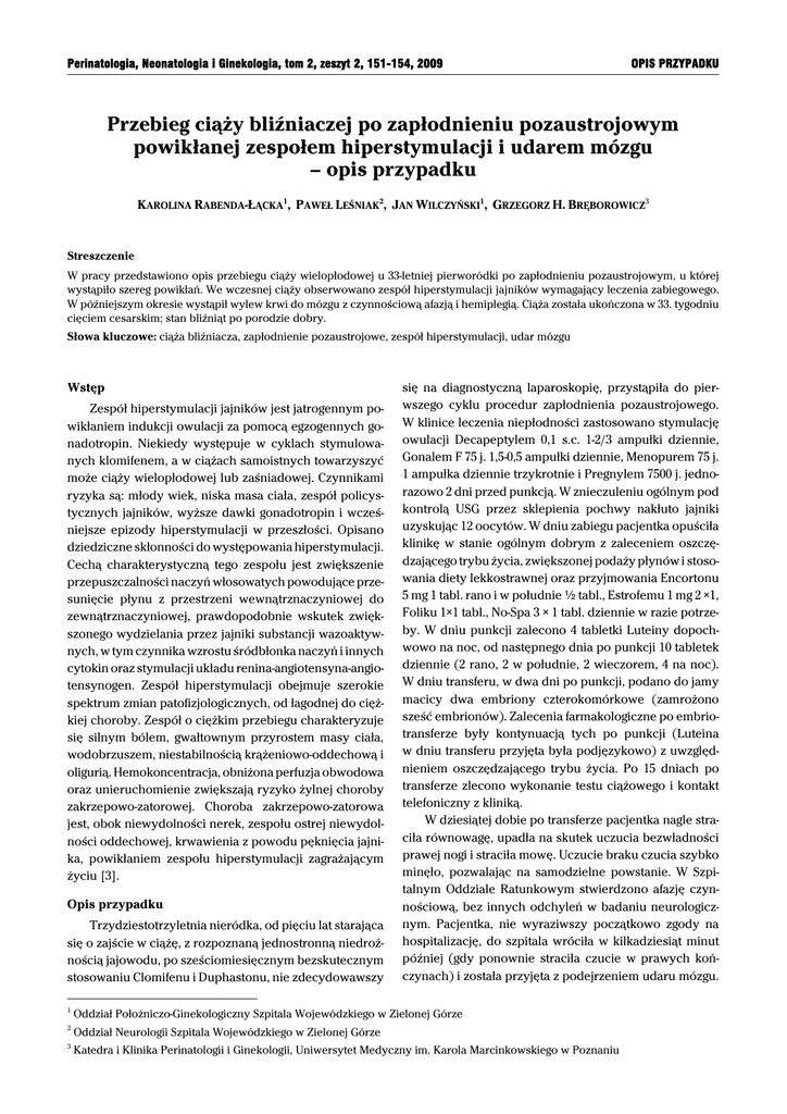 Perinatologia, Neonatologia i Ginekologia, tom 2, zeszyt 2, 151-154, 2009 OPIS PRZYPADKU Przebieg ciąży bliźniaczej po zapłodnieniu pozaustrojowym powikłanej zespołem hiperstymulacji i udarem mózgu – opis przypadku KAROLINA RABENDA-ŁĄCKA1, PAWEŁ LEŚNIAK2, JAN WILCZYŃSKI1, GRZEGORZ H. BRĘBOROWICZ3 Streszczenie W pracy przedstawiono opis przebiegu ciąży wielopłodowej u 33-letniej pierworódki po zapłodnieniu pozaustrojowym, u której wystąpiło szereg powikłań. We wczesnej ciąży obserwowano zespół hiperstymulacji jajników wymagający leczenia zabiegowego. W późniejszym okresie wystąpił wylew krwi do mózgu z czynnościową afazją i hemiplegią. Ciąża została ukończona w 33. tygodniu cięciem cesarskim; stan bliźniąt po porodzie dobry. Słowa kluczowe: ciąża bliźniacza, zapłodnienie pozaustrojowe, zespół hiperstymulacji, udar mózgu Wstęp Zespół hiperstymulacji jajników jest jatrogennym powikłaniem indukcji owulacji za pomocą egzogennych gonadotropin. Niekiedy występuje w cyklach stymulowanych klomifenem, a w ciążach samoistnych towarzyszyć może ciąży wielopłodowej lub zaśniadowej. Czynnikami ryzyka są: młody wiek, niska masa ciała, zespół policystycznych jajników, wyższe dawki gonadotropin i wcześniejsze epizody hiperstymulacji w przeszłości. Opisano dziedziczne skłonności do występowania hiperstymulacji. Cechą charakterystyczną tego zespołu jest zwiększenie przepuszczalności naczyń włosowatych powodujące przesunięcie płynu z przestrzeni wewnątrznaczyniowej do zewnątrznaczyniowej, prawdopodobnie wskutek zwiększonego wydzielania przez jajniki substancji wazoaktywnych, w tym czynnika wzrostu śródbłonka naczyń i innych cytokin oraz stymulacji układu renina-angiotensyna-angiotensynogen. Zespół hiperstymulacji obejmuje szerokie spektrum zmian patofizjologicznych, od łagodnej do ciężkiej choroby. Zespół o ciężkim przebiegu charakteryzuje się silnym bólem, gwałtownym przyrostem masy ciała, wodobrzuszem, niestabilnością krążeniowo-oddechową i oligurią. Hemokoncentracja, obniżona perfuzja obwodowa oraz unieruchomienie zwiększają ryzyko żylnej choroby zakrzepowo-zatorowej. Choroba zakrzepowo-zatorowa jest, obok niewydolności nerek, zespołu ostrej niewydolności oddechowej, krwawienia z powodu pęknięcia jajnika, powikłaniem zespołu hiperstymulacji zagrażającym życiu [3]. Opis przypadku Trzydziestotrzyletnia nieródka, od pięciu lat starająca się o zajście w ciążę, z rozpoznaną jednostronną niedrożnością jajowodu, po sześciomiesięcznym bezskutecznym stosowaniu Clomifenu i Duphastonu, nie zdecydowawszy się na diagnostyczną laparoskopię, przystąpiła do pierwszego cyklu procedur zapłodnienia pozaustrojowego. W klinice leczenia niepłodności zastosowano stymulację owulacji Decapeptylem 0,1 s.c. 1-2/3 ampułki dziennie, Gonalem F 75 j. 1,5-0,5 ampułki dziennie, Menopurem 75 j. 1 ampułka dziennie trzykrotnie i Pregnylem 7500 j. jednorazowo 2 dni przed punkcją. W znieczuleniu ogólnym pod kontrolą USG przez sklepienia pochwy nakłuto jajniki uzyskując 12 oocytów. W dniu zabiegu pacjentka opuściła klinikę w stanie ogólnym dobrym z zaleceniem oszczędzającego trybu życia, zwiększonej podaży płynów i stosowania diety lekkostrawnej oraz przyjmowania Encortonu 5 mg 1 tabl. rano i w południe 2 tabl., Estrofemu 1 mg 2 ×1, Foliku 1×1 tabl., No-Spa 3 × 1 tabl. dziennie w razie potrzeby. W dniu punkcji zalecono 4 tabletki Luteiny dopochwowo na noc, od następnego dnia po punkcji 10 tabletek dziennie (2 rano, 2 w południe, 2 wieczorem, 4 na noc). W dniu transferu, w dwa dni po punkcji, podano do jamy macicy dwa embriony czterokomórkowe (zamrożono sześć embrionów). Zalecenia farmakologiczne po embriotransferze były kontynuacją tych po punkcji (Luteina w dniu transferu przyjęta była podjęzykowo) z uwzględnieniem oszczędzającego trybu życia. Po 15 dniach po transferze zlecono wykonanie testu ciążowego i kontakt telefoniczny z kliniką. W dziesiątej dobie po transferze pacjentka nagle straciła równowagę, upadła na skutek uczucia bezwładności prawej nogi i straciła mowę. Uczucie braku czucia szybko minęło, pozwalając na samodzielne powstanie. W Szpitalnym Oddziale Ratunkowym stwierdzono afazję czynnościową, bez innych odchyleń w badaniu neurologicznym. Pacjentka, nie wyraziwszy początkowo zgody na hospitalizację, do szpitala wróciła w kilkadziesiąt minut później (gdy ponownie straciła czucie w prawych kończynach) i została przyjęta z podejrzeniem udaru mózgu. 1 Oddział Położniczo-Ginekologiczny Szpitala Wojewódzkiego w Zielonej Górze 2 Oddział Neurologii Szpitala Wojewódzkiego w Zielonej Górze 3 Katedra i Klinika Perinatologii i Ginekologii, Uniwersytet Medyczny im. Karola Marcinkowskiego w Poznaniu 152 K. Rabenda-Łącka, P. Leśniak, J. Wilczyński, G.H. Bręborowicz W Oddziale Neurologii Szpitala Wojewódzkiego (nr hist. choroby 8094/08) wykonano rezonans magnetyczny mózgu, w którym wykazano cechy świeżego niedokrwienia w obszarze unaczynienia lewej MCA o wymiarach 7 × 5 cm, zajmującym lewa okolicę czołowo-skroniową oraz mniejszy obszar zmian niedokrwiennych, o wymiarach 4 × 2 cm, obecny w prawym płacie czołowym w warstwach środkowo-komorowych (ryc. 1). min oraz rozpoczęto seryjne monitorowanie parametrów stanu ogólnego, krzepnięcia krwi, jonogramu, gazometrii, bilansu płynów, oraz kontrolę wagi i pomiarów obwodu brzucha. W badaniu dopplerowskim kończyn dolnych nie stwierdzono zakrzepicy, w echu przezprzełykowym nie stwierdzono nieprawidłowości. W piętnastym dniu po transferze po raz pierwszy pacjentka zgłosiła ból w prawym podbrzuszu, który ustąpiwszy po lekach rozkurczowych i przeciwbólowych, powrócił w dwa dni później. Zaobserwowano powiększenie obwodu brzucha o 3,5 cm w ciągu doby, mimo stosowania Spironolu 1× 25 mg doustnie. Stan ogólny konsultowano z internistą.