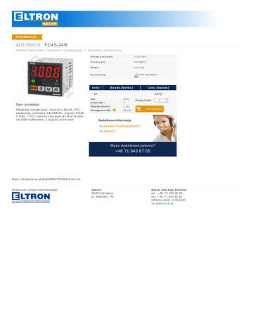 PRO MO CJA AUT ONICST C4S-24R Techni kapom i ar owa,ster owni cz ai r egul acyj na > Regul ator ytem per atur y N a z wa p ro d u ktu : T C4 S -24 R P ro d u c en t: AUT ONI CS Wa g a : 0.14 4 kg Ka rta ka ta logowa D o ku m en ty: Ilo ś ć [brutto ] /[netto ] Cena [wa luta ] 1+ O pis pro duktu: Regul ator tem per atur y,wym i ar y48 x48 ,PID, autotuni ng,z asi l ani e100-230VAC,wej ści ePt100, K(CA),J(IC),wyj ści ester uj ącepr z ekaź ni kowe l ubSSR-wybi er al ne,2wyj ści aal ar m owe 120[] Vat: Ilośćmin.: Wielokrotność: 23% 1 1sz t. Dostępnew24h: 51sz t. Pod ajIlość: 1 + - dokosz yka Maszdodatkowepytania? +48713439755 https://skl ep.el tr on.pl /pl /p/18 5537 2248 24/tc4s-24r Wł aści ci el skl epui nter netowego: Adres : 50-07 1Wr ocł aw pl .Wol ności 7 B Biuro O bs ługiKlienta : tel .:+48 7 134397 55 fax+48 7 13441141 Infol i ni apn-pt.8 .00-16.00 skl ep@ el tr on.pl