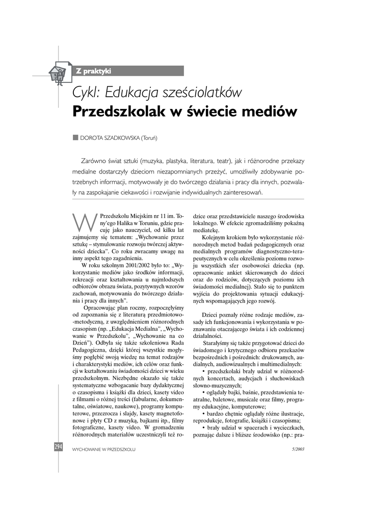 Z praktyki Cykl: Edukacja szeÊciolatków Przedszkolak w Êwiecie mediów n DOROTA SZADKOWSKA (Toruƒ) Zarówno Êwiat sztuki (muzyka, plastyka, literatura, teatr), jak i ró˝norodne przekazy medialne dostarczy∏y dzieciom niezapomnianych prze˝yç, umo˝liwi∏y zdobywanie potrzebnych informacji, motywowa∏y je do twórczego dzia∏ania i pracy dla innych, pozwala∏y na zaspokajanie ciekawoÊci i rozwijanie indywidualnych zainteresowaƒ. W Przedszkolu Miejskim nr 11 im. Tony’ego Halika w Toruniu, gdzie pracuj´ jako nauczyciel, od kilku lat zajmujemy si´ tematem: „Wychowanie przez sztuk´ – stymulowanie rozwoju twórczej aktywnoÊci dziecka”. Co roku zwracamy uwag´ na inny aspekt tego zagadnienia. W roku szkolnym 2001/2002 by∏o to: „Wykorzystanie mediów jako Êrodków informacji, rekreacji oraz kszta∏towania u najm∏odszych odbiorców obrazu Êwiata, pozytywnych wzorów zachowaƒ, motywowania do twórczego dzia∏ania i pracy dla innych”. Opracowujàc plan roczny, rozpocz´∏yÊmy od zapoznania si´ z literaturà przedmiotowo-metodycznà, z uwzgl´dnieniem ró˝norodnych czasopism (np. „Edukacja Medialna”, „Wychowanie w Przedszkolu”, „Wychowanie na co Dzieƒ”). Odby∏a si´ tak˝e szkoleniowa Rada Pedagogiczna, dzi´ki której wszystkie mog∏yÊmy pog∏´biç swojà wiedz´ na temat rodzajów i charakterystyki mediów, ich celów oraz funkcji w kszta∏towaniu ÊwiadomoÊci dzieci w wieku przedszkolnym. Niezb´dne okaza∏o si´ tak˝e systematyczne wzbogacanie bazy dydaktycznej o czasopisma i ksià˝ki dla dzieci, kasety video z filmami o ró˝nej treÊci (fabularne, dokumentalne, oÊwiatowe, naukowe), programy komputerowe, przezrocza i slajdy, kasety magnetofonowe i p∏yty CD z muzykà, bajkami itp., filmy fotograficzne, kasety video. W gromadzeniu ró˝norodnych materia∏ów uczestniczyli te˝ ro- 294 WYCHOWANIE W PRZEDSZKOLU dzice oraz przedstawiciele naszego Êrodowiska lokalnego. W efekcie zgromadziliÊmy pokaênà mediatek´. Kolejnym krokiem by∏o wykorzystanie ró˝norodnych metod badaƒ pedagogicznych oraz medialnych programów diagnostyczno-terapeutycznych w celu okreÊlenia poziomu rozwoju wszystkich sfer osobowoÊci dziecka (np. opracowanie ankiet skierowanych do dzieci oraz do rodziców, dotyczàcych poziomu ich ÊwiadomoÊci medialnej). Sta∏o si´ to punktem wyjÊcia do projektowania sytuacji edukacyjnych wspomagajàcych jego rozwój. Dzieci pozna∏y ró˝ne rodzaje mediów, zasady ich funkcjonowania i wykorzystania w poznawaniu otaczajàcego Êwiata i ich codziennej dzia∏alnoÊci. Stara∏yÊmy si´ tak˝e przygotowaç dzieci do Êwiadomego i krytycznego odbioru przekazów bezpoÊrednich i poÊrednich: drukowanych, audialnych, audiowizualnych i multimedialnych: • przedszkolaki bra∏y udzia∏ w ró˝norodnych koncertach, audycjach i s∏uchowiskach s∏owno-muzycznych; • oglàda∏y bajki, baÊnie, przedstawienia teatralne, baletowe, musicale oraz filmy, programy edukacyjne, komputerowe; • bardzo ch´tnie oglàda∏y ró˝ne ilustracje, reprodukcje, fotografie, ksià˝ki i czasopisma; • bra∏y udzia∏ w spacerach i wycieczkach, poznajàc dalsze i bli˝sze Êrodowisko (np.: pra5/2003 Z praktyki cownia komputerowa, fotograficzna, studio reklamy wizualnej, redakcja gazety, ksi´garnia, biblioteka, kino, teatr, radio, telewizja osiedlowa, galerie, muzea itp.); • uczestniczy∏y w ciekawych spotkaniach z przedstawicielami ró˝nych zawodów (np.: redaktor, dziennikarz, bibliotekarz, fotograf, informatyk itp.). Uczy∏yÊmy dzieci racjonalnego korzystania z mediów jako przekaêników cennych wartoÊci, wzorów post´powania pobudzajàcych do wzruszeƒ, kszta∏tujàcych motywacje i w∏aÊciwe postawy. Przedszkolaki naby∏y te˝ umiej´tnoÊç praktycznego zastosowania zdobytej wiedzy, doÊwiadczeƒ i umiej´tnoÊci oraz subiektywnych wra˝eƒ, doznaƒ i emocji, rejestrujàc wydarzenia z ˝ycia przedszkola i najbli˝szego Êrodowiska spo∏eczno-przyrodniczego w formie zapisu medialnego: • nagrywa∏y i odtwarza∏y wypowiedzi w∏asne i kolegów, przeprowadzane wywiady, w∏asne kompozycje muzyczno-wokalne, z u˝yciem magnetofonu, dyktafonu, kamery wideo itp.; • kr´ci∏y krótkie filmy kamerà wideo oraz wykonywa∏y zdj´cia za pomocà aparatu fotograficznego; • podejmowa∏y próby tworzenia w∏asnych, prostych prezentacji z wykorzystaniem komputera. Dzi´ki komputerom, przeznaczonym dla dzieci, mog∏yÊmy zastosowaç programy komputerowe, wspomagajàce wszechstronnà edukacj´ dziecka. S∏u˝y∏y nam one m.in. do: • praktycznego wykorzystania edytora tekstowego WordPad i graficznego Paint; • nauki czytania i pisania oraz praktycznych çwiczeƒ gramatycznych i ortograficznych (np. „Klik uczy czytaç”, „Klik uczy pisaç”, „Malinowy las”); • nauki matematyki w zakresie stosunków przestrzennych, porzàdkowania, klasyfikowania, liczenia, podstawowych dzia∏aƒ arytmetycznych (np. „Figury geometryczne”); • edukacji Êrodowiskowej (np. „Encyklopedia cz∏owieka”, „Encyklopedia zwierzàt”, „Encyklopedia przyrody”, „Moja pierwsza encyklopedia”, „Encyklopedia PWN”, „Przez kontynenty wielka wyprawa”, „Bolek i Lolek – pamiàtki z podró˝y”, „Jak to dzia∏a?”, „Pif i Paf na Dzikim Zachodzie”, „Przyjaciele z Krainy Wiedzy”); 5/2003 • çwiczeƒ rytmicznych i komponowania prostych uk∏adów dêwi´kowych (np. „W Êwiecie muzyki”); • rysowania, malowania, kolorowania (np. „W galerii obrazów”, „Âwiat kolorów”); • rekreacji, tj. rozwijania w∏asnych zainteresowaƒ, uzdolnieƒ, odczuwania radoÊci, przyjemnoÊci, wprowadzenia zdrowej rywalizacji przez udzia∏ w grach, m.in. logicznych, planszowych, zr´cznoÊciowych itp. (np. „Âwiàteczne zabawy”, „Sportowe zmagania bez wysi∏ku i biegania”, „W lunaparku zabawa szalona”). KontynuowaliÊmy wspólnie z dzieçmi nasze „w´drówki w wyobraêni” Êladami wielkiego